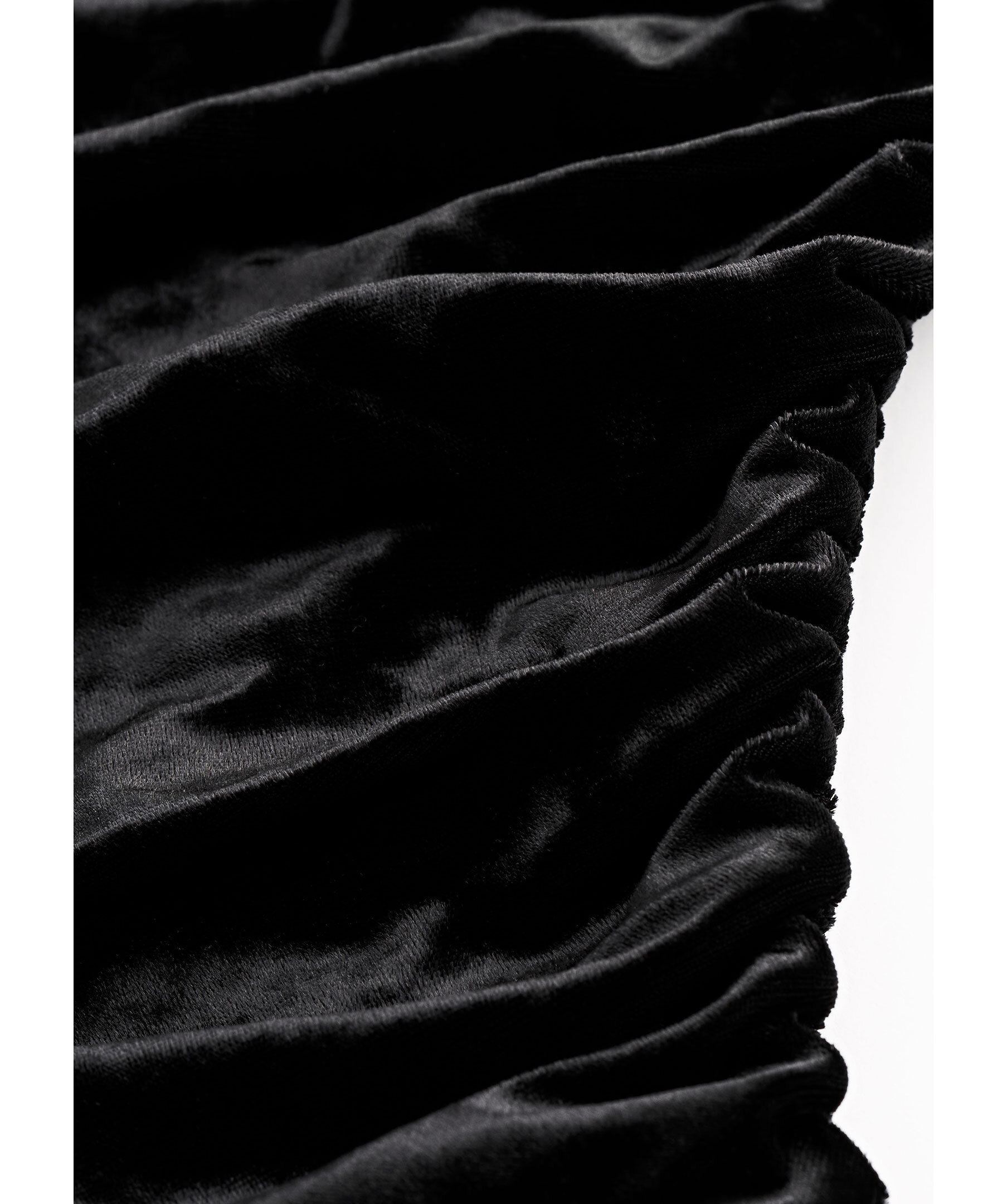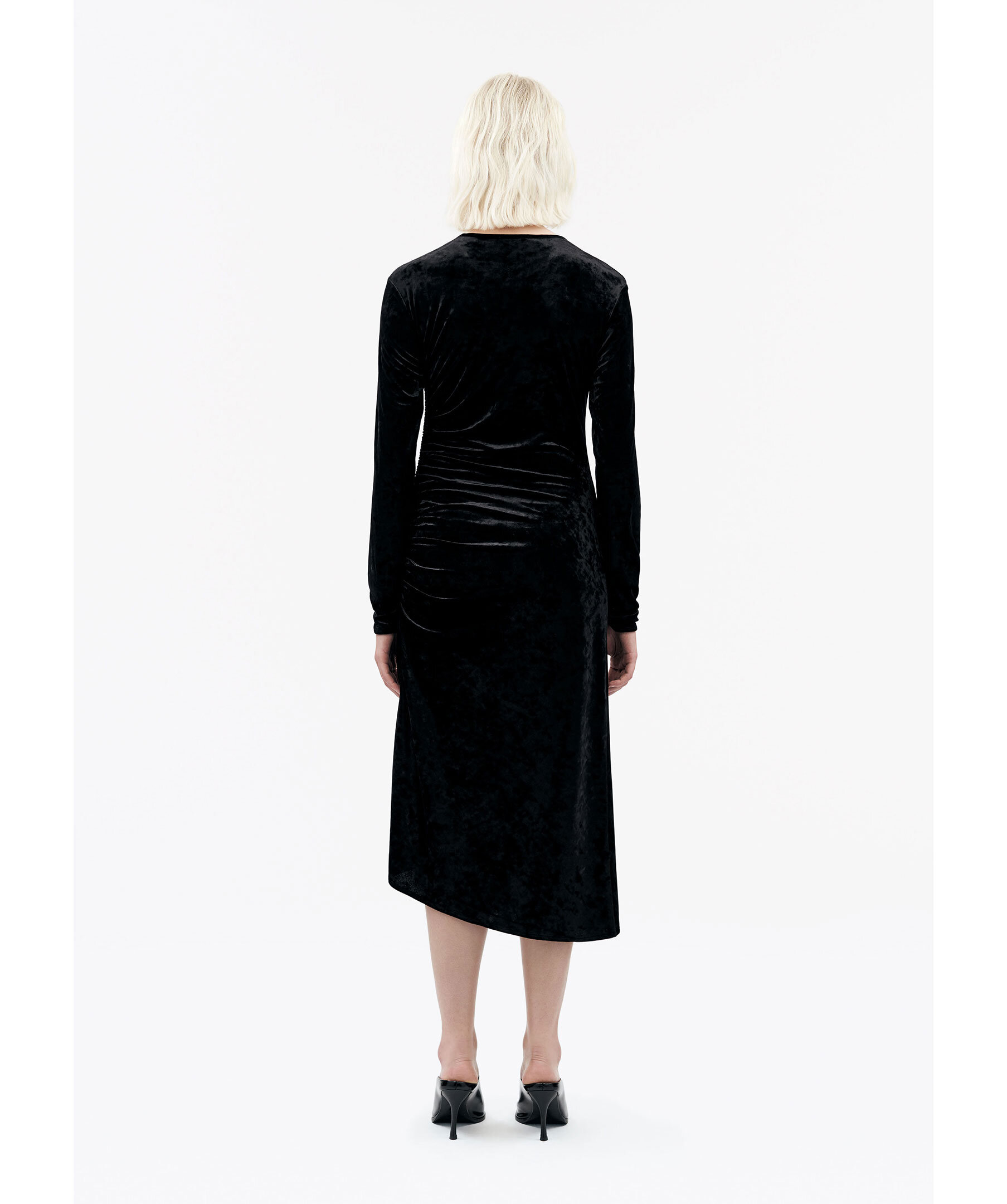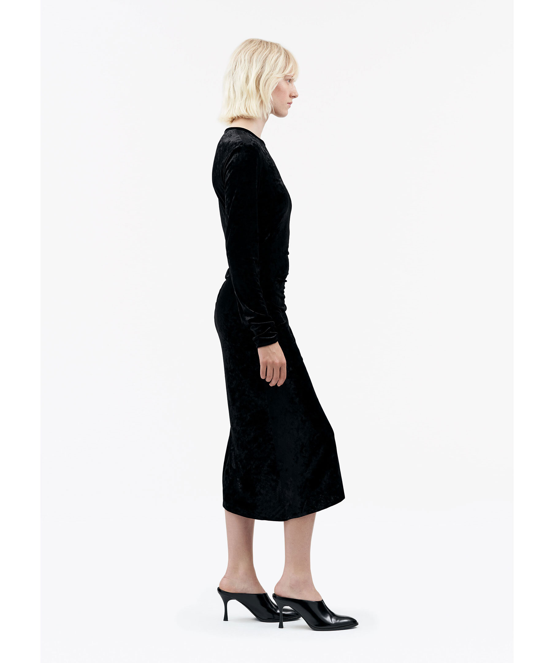 Svart slim Fit klänning i draperad sammet från Tiger of Sweden. Smal passform, längd till mitten av vaden och rund halsringning. Rynkad sidsöm som skapar en draperad effekt framtill.
