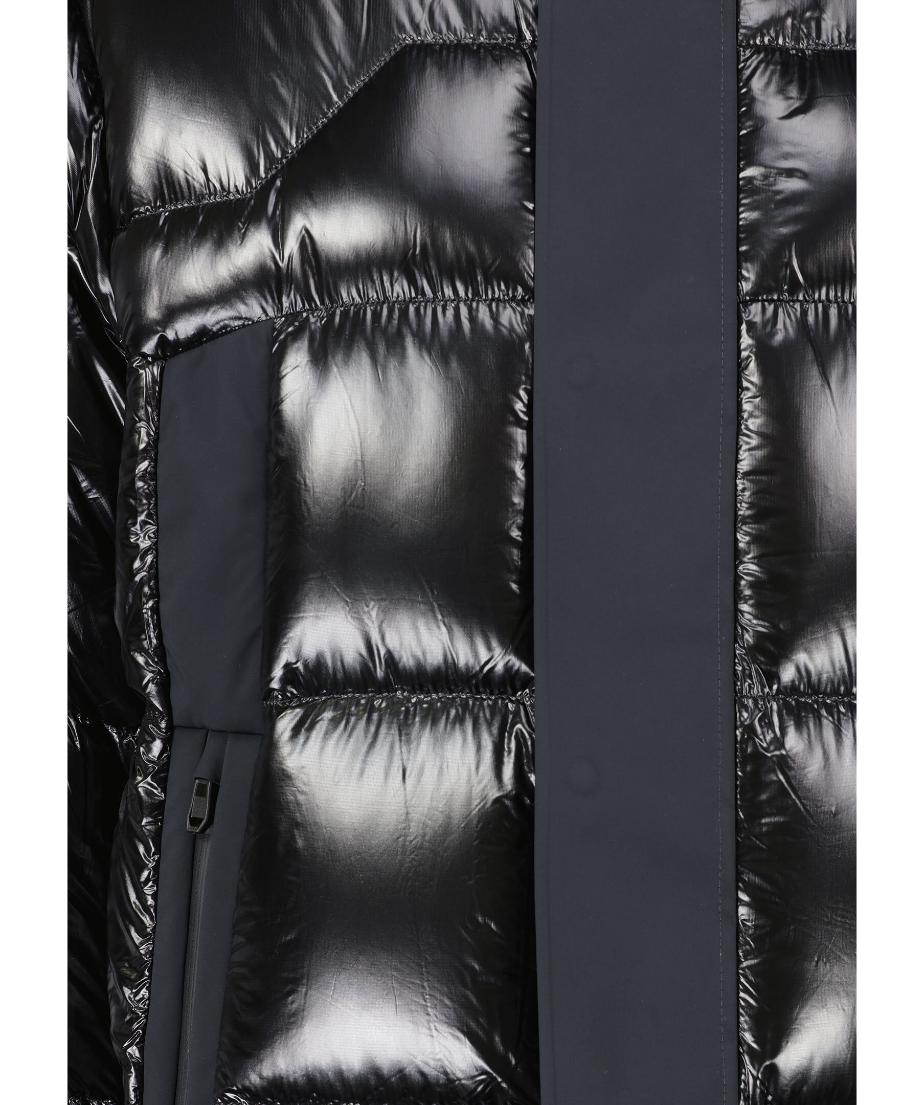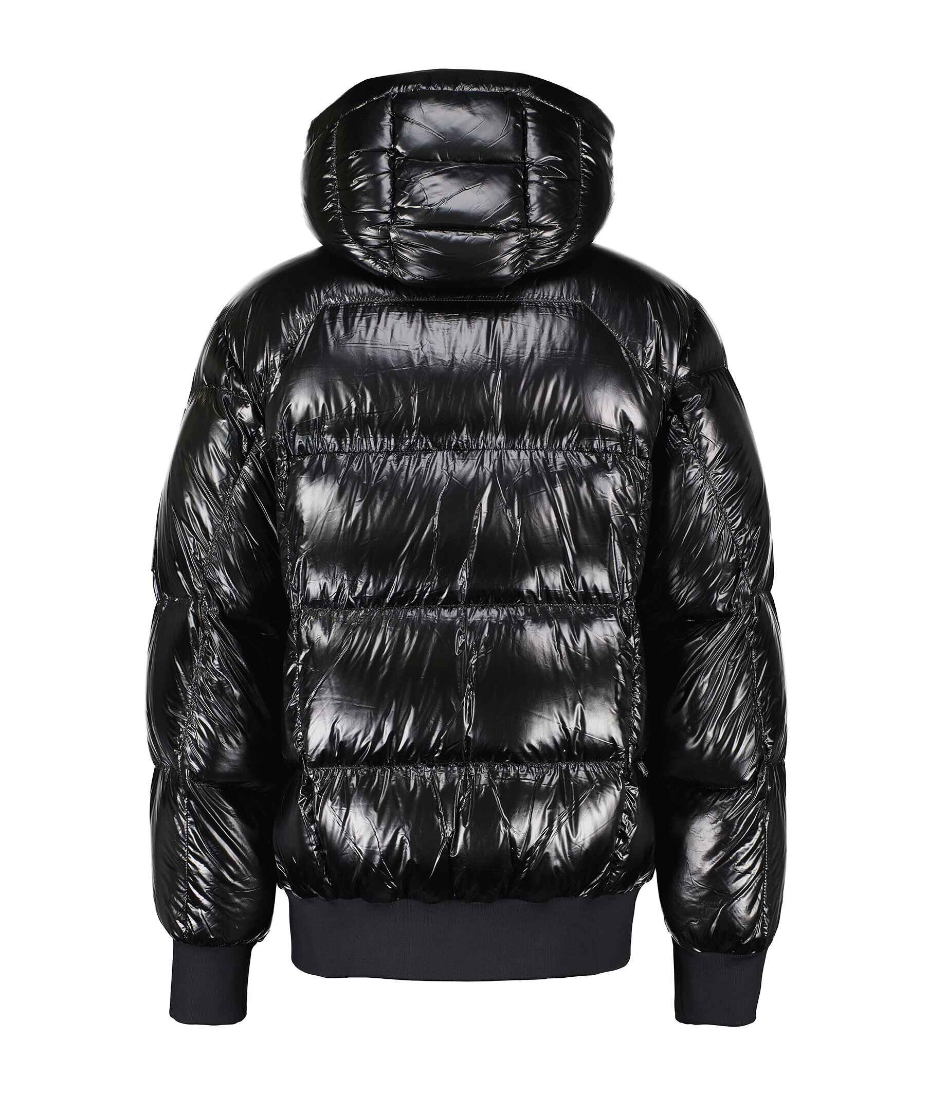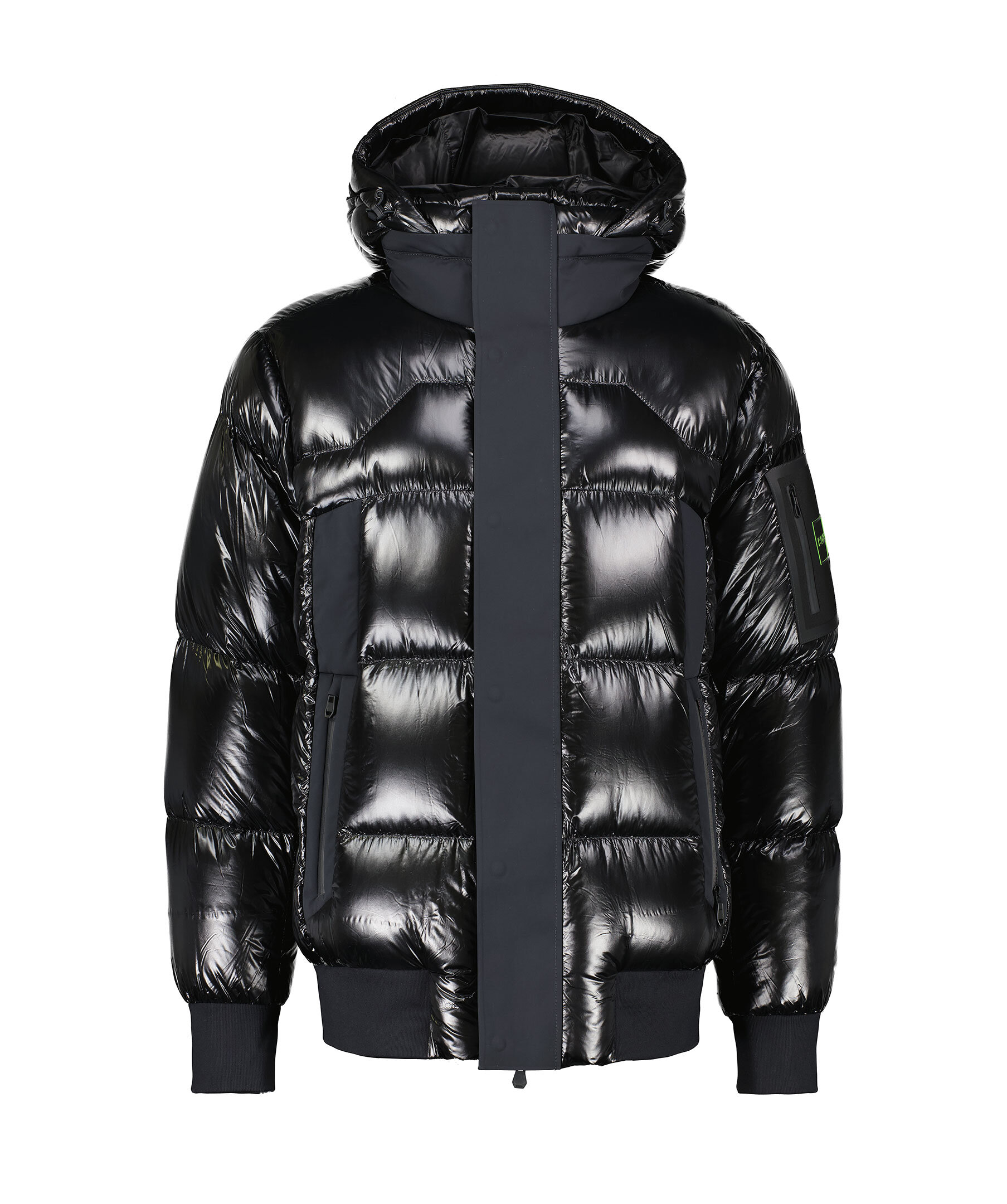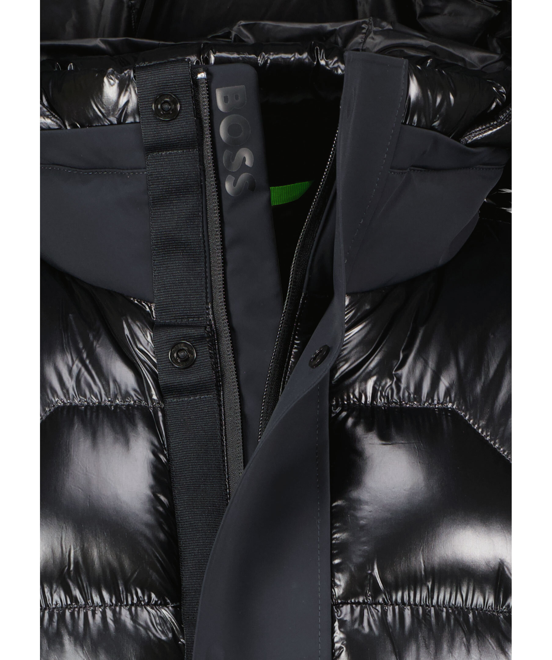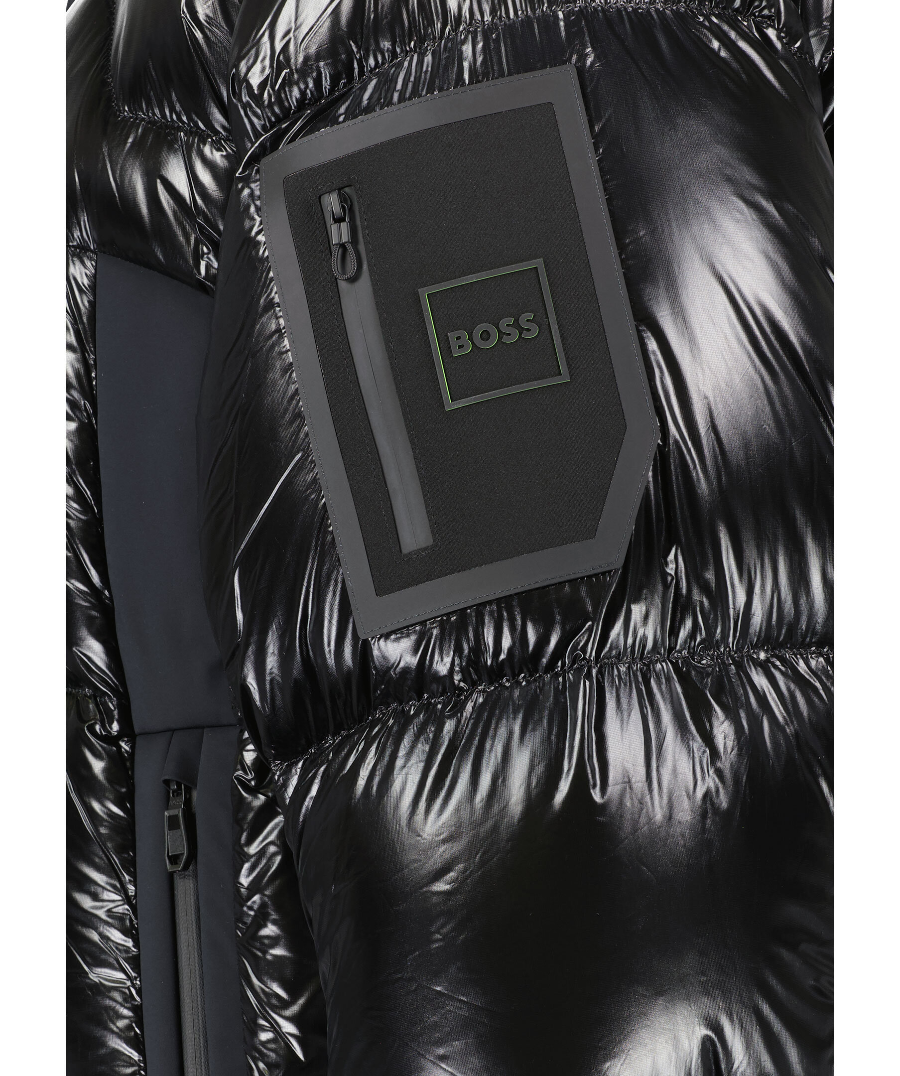 Svart puffer jacka från Hugo Boss. Jackan har ett tvåvägsblixtlås dolt bakom en knappstängning. Två sidofickor med blixtlås, en ärmficka med blixtlås samt logotyp med gummi detaljer. Två innerfickor, ena med tryckknapps stängning och en med blixtlås. Elastiska band på insidan som man kan sätta över axlarna och låta jackan hänga fritt om man vill ha den öppen. Glansig med matta detaljer, mudd vid ärm och tröjslut. Jackan har en vattenavstötande finish med dunfyllning.