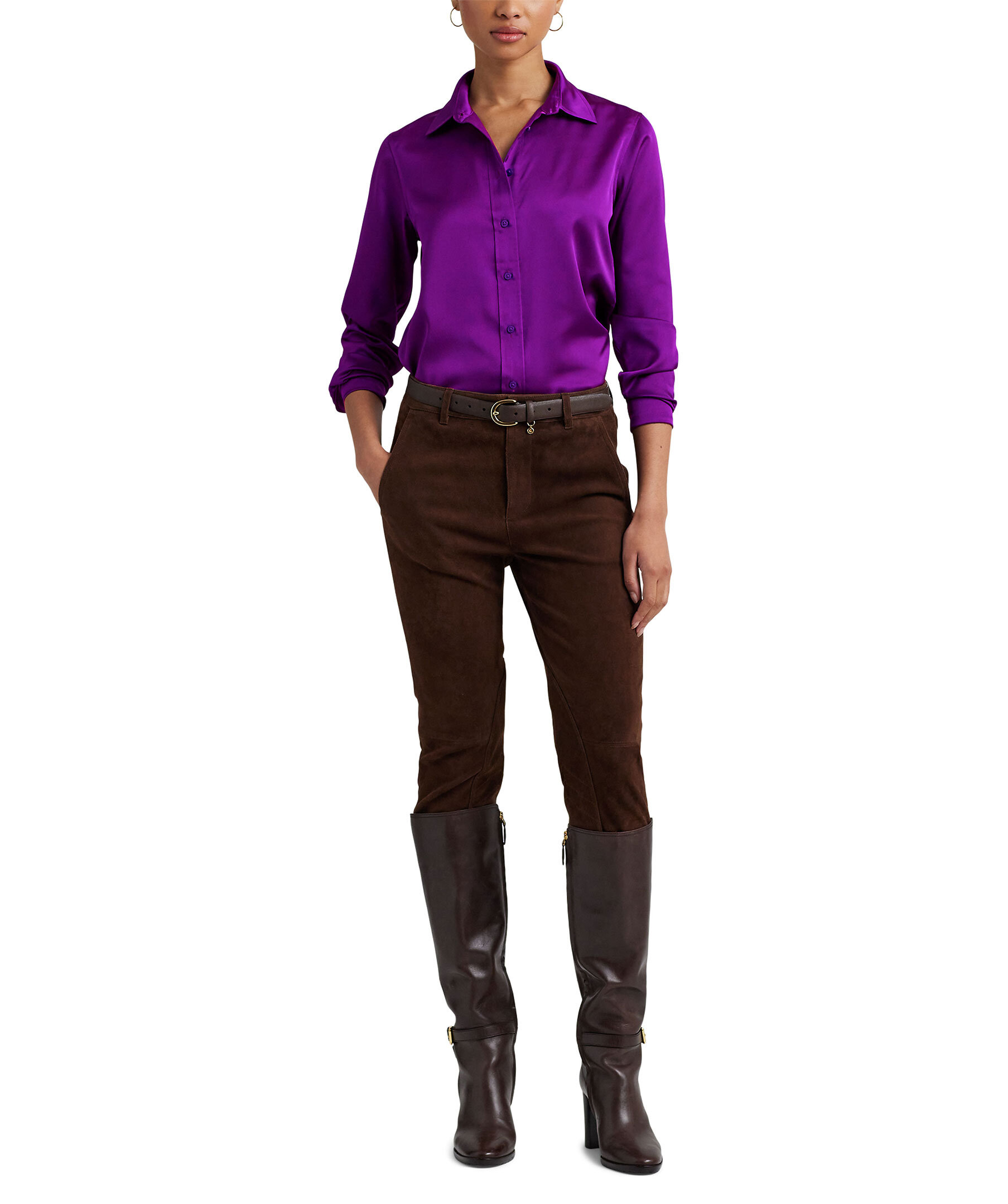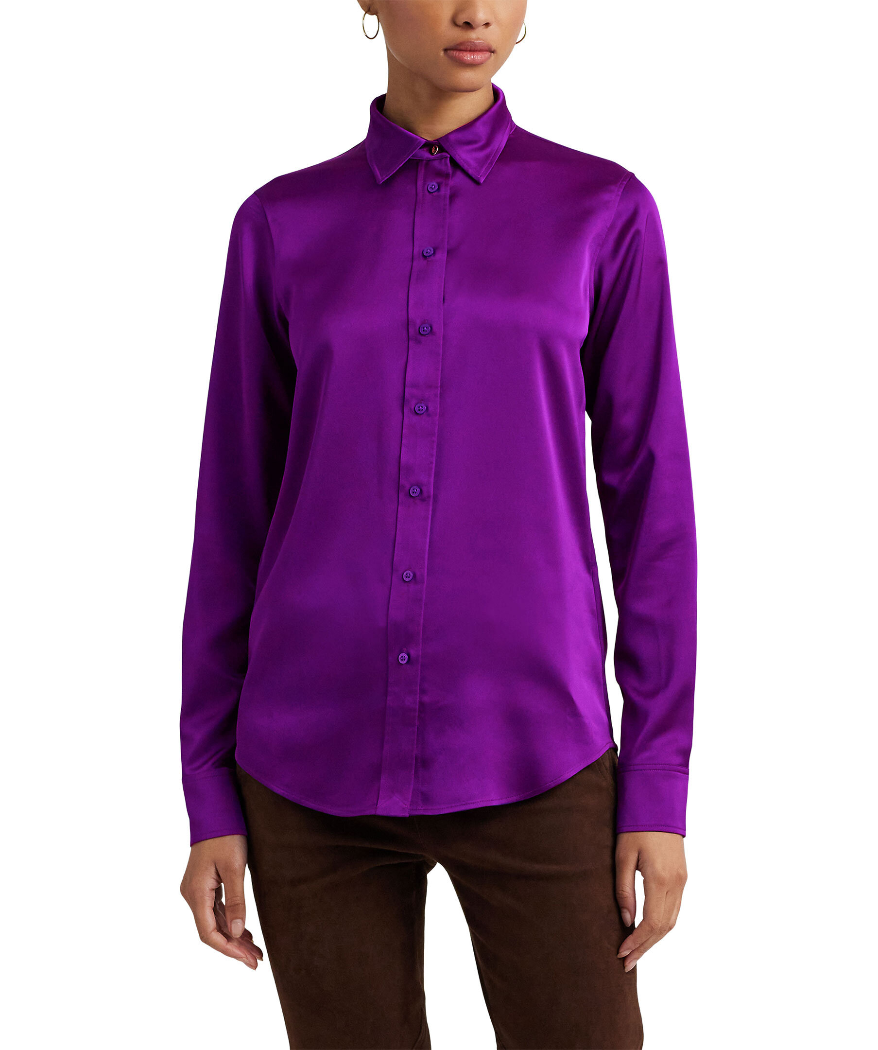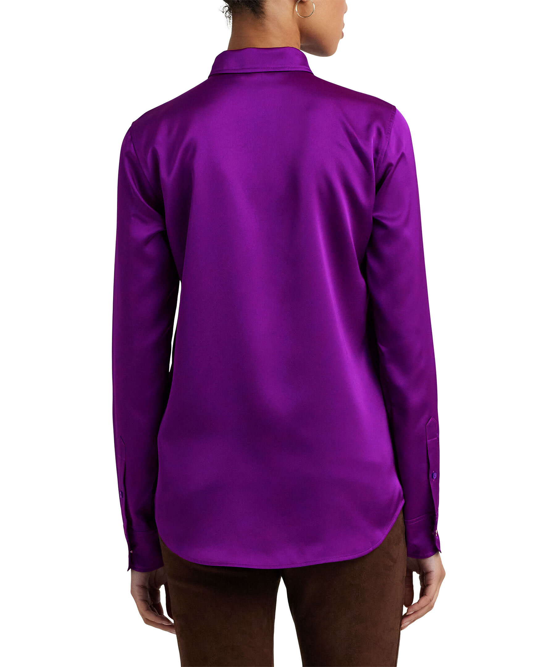 Lila skjorta från Lauren Ralph Lauren i ett glansigt charmeusetyg. Rak passform, spetsig krage och slutar vid höften. Modellen är 178cm och har på sig storlek S.