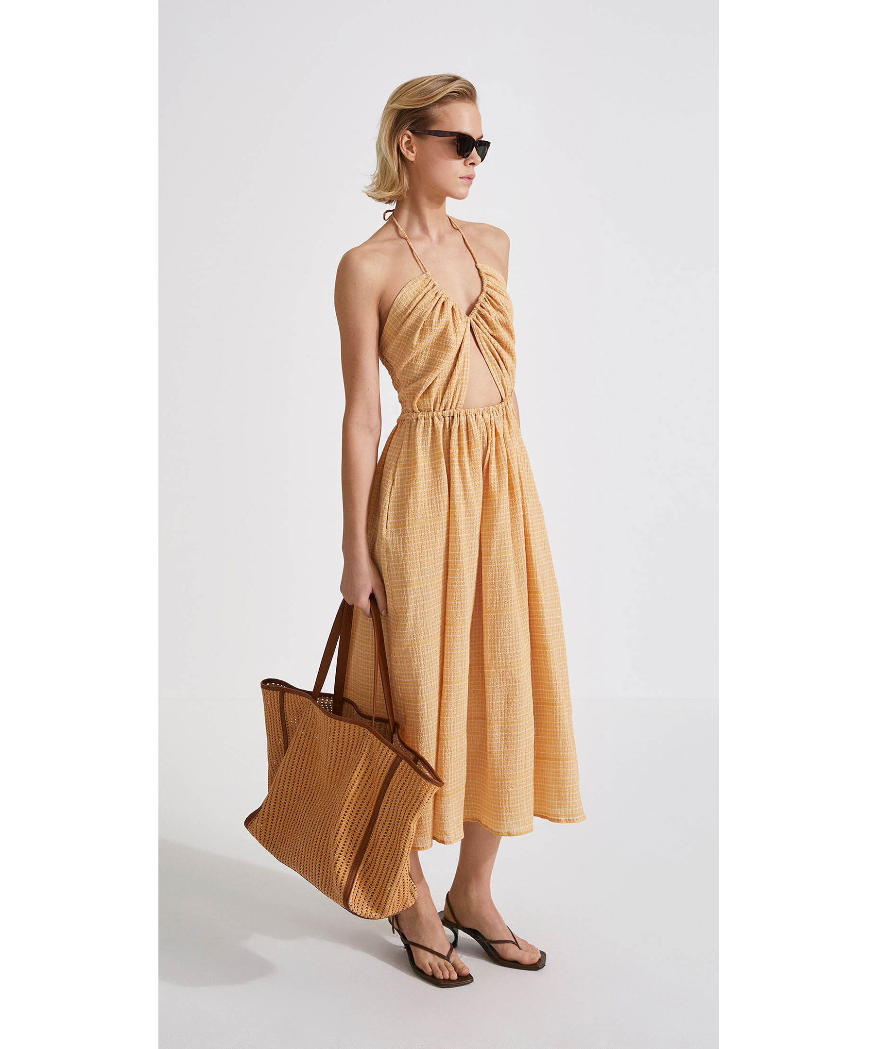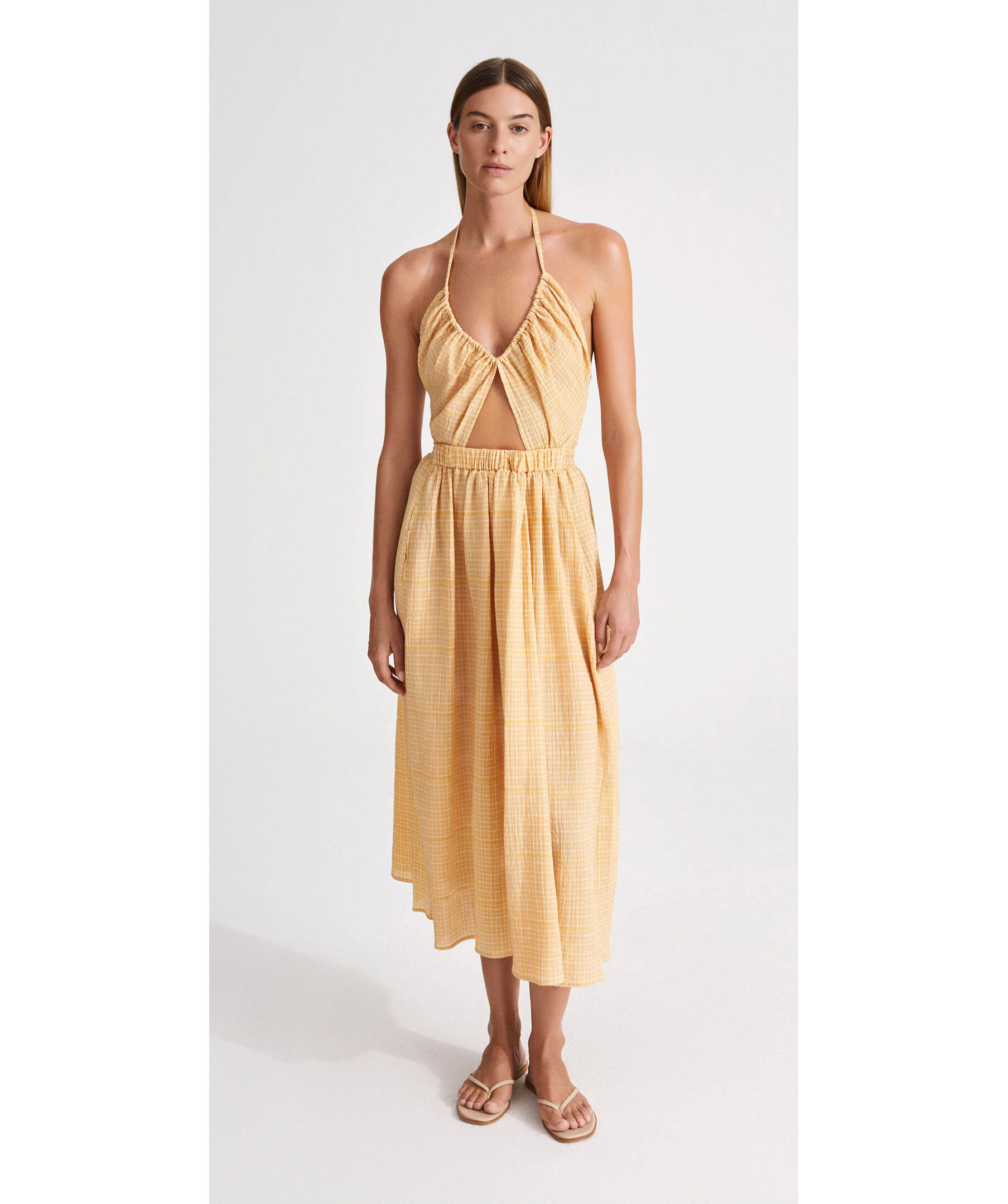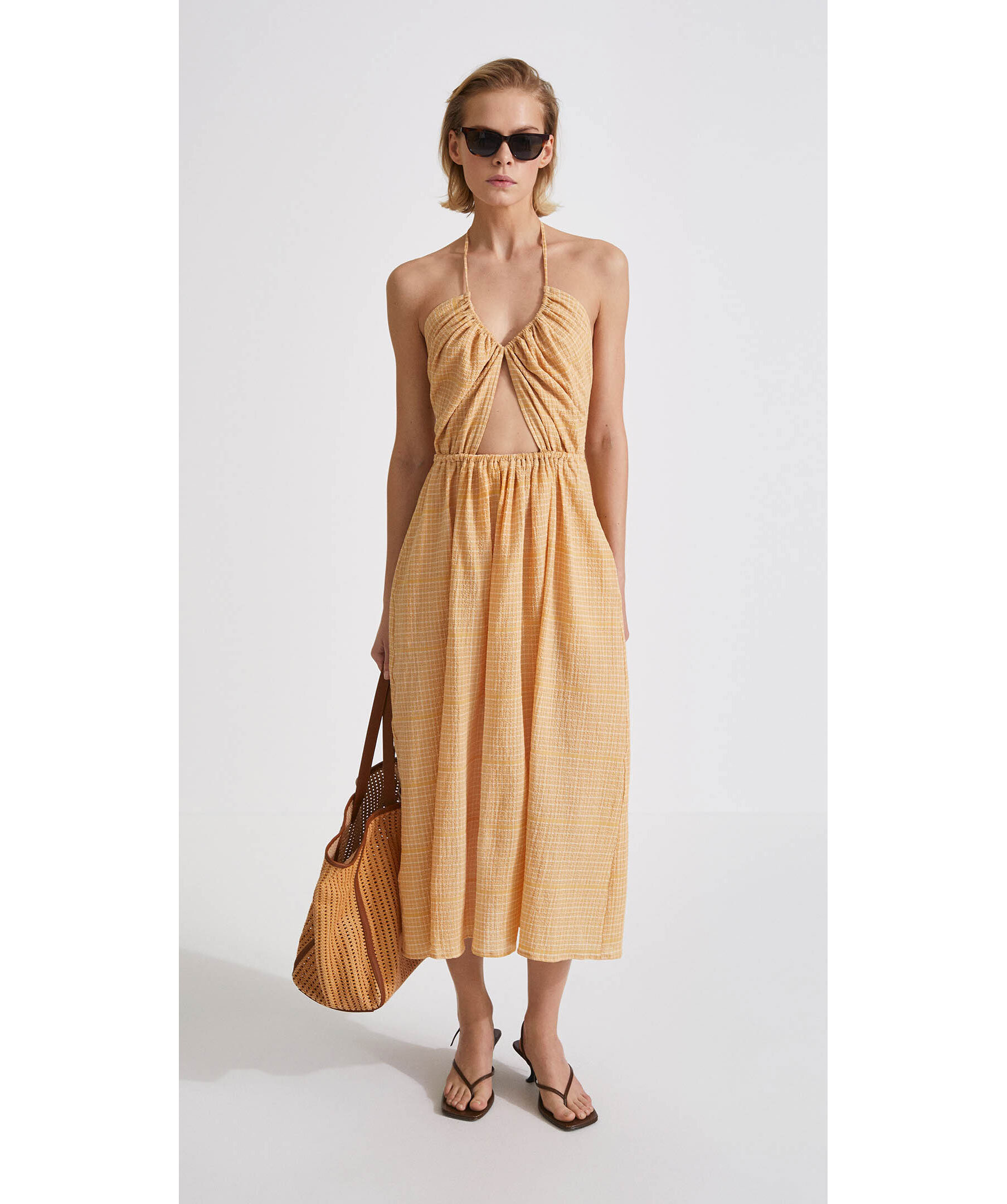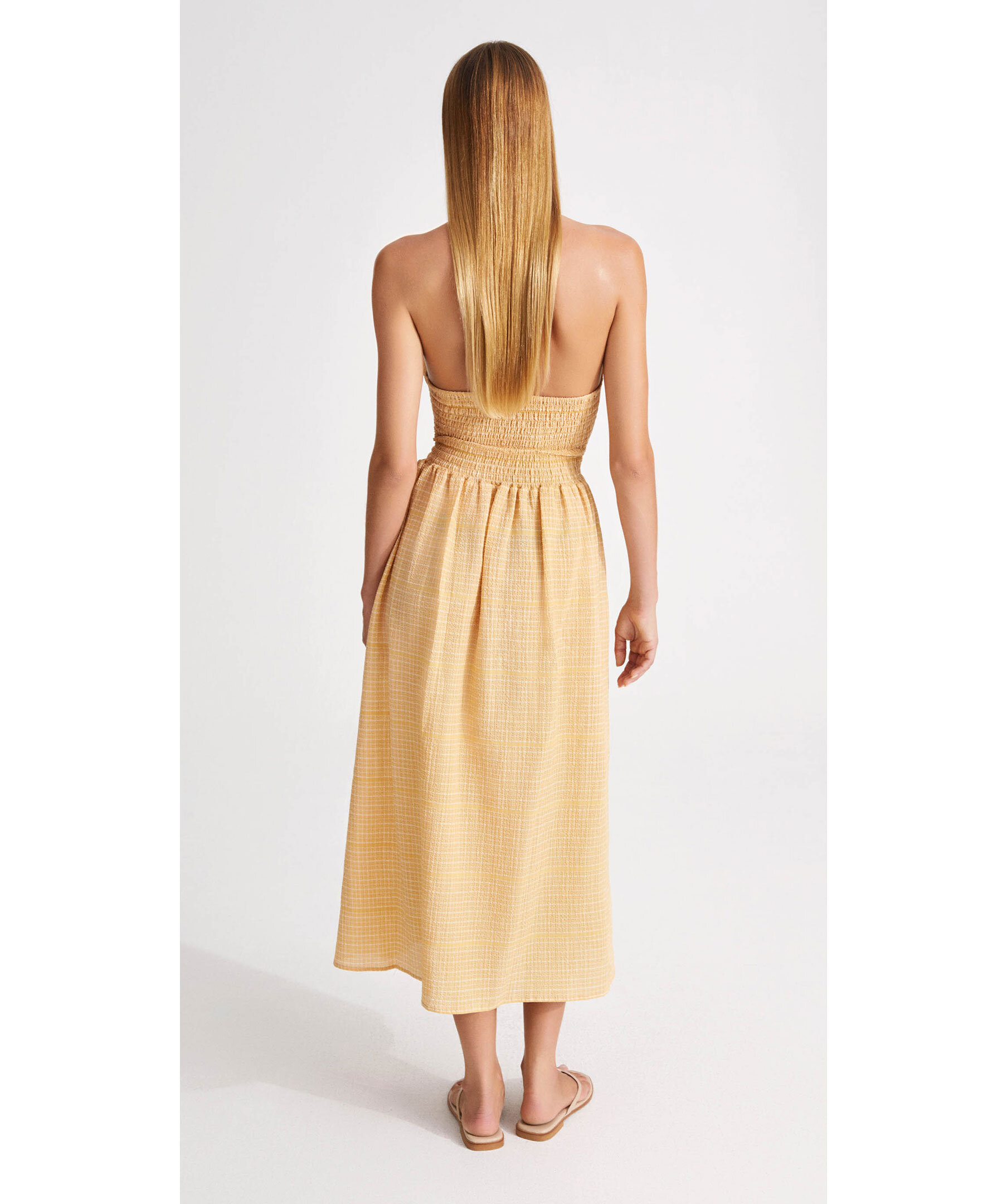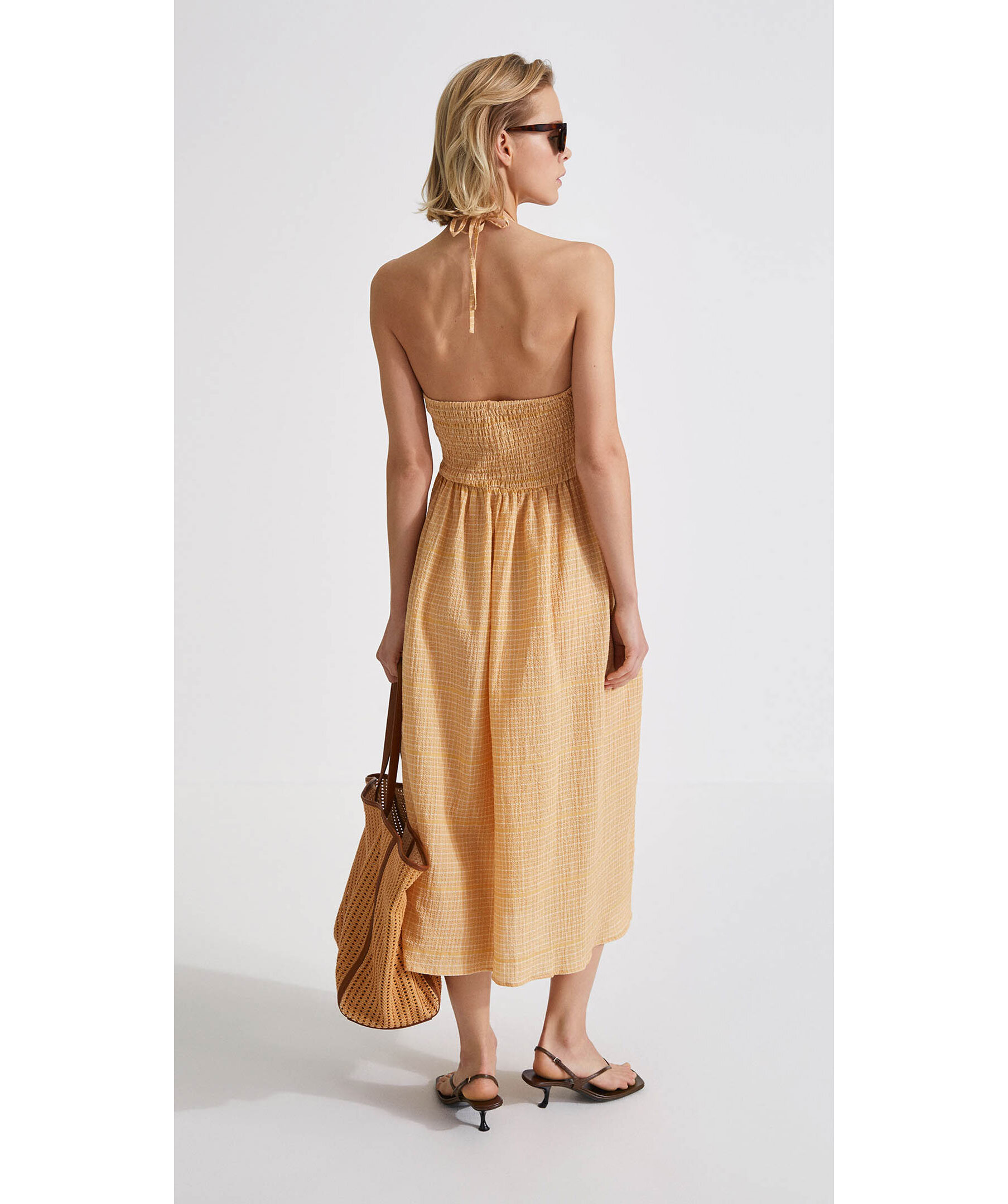 Gul och vit mönstrad klänning i halterneck modell från Stylein. Cut-out detalj framtill. Elastiskt band i midjan. Smock detalj i ryggen. Texturerat tyg. Tillverkad i bomullsblandning.
