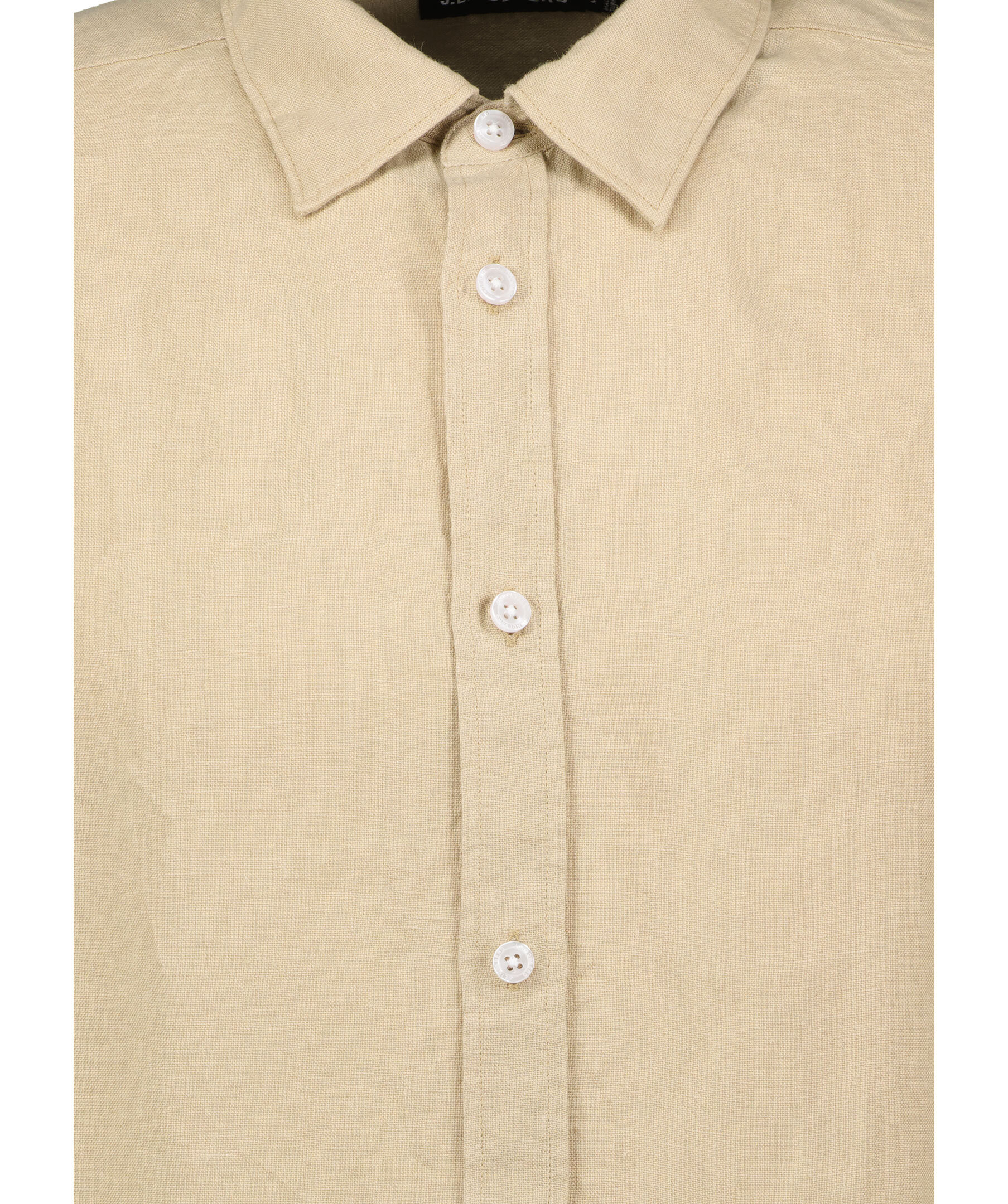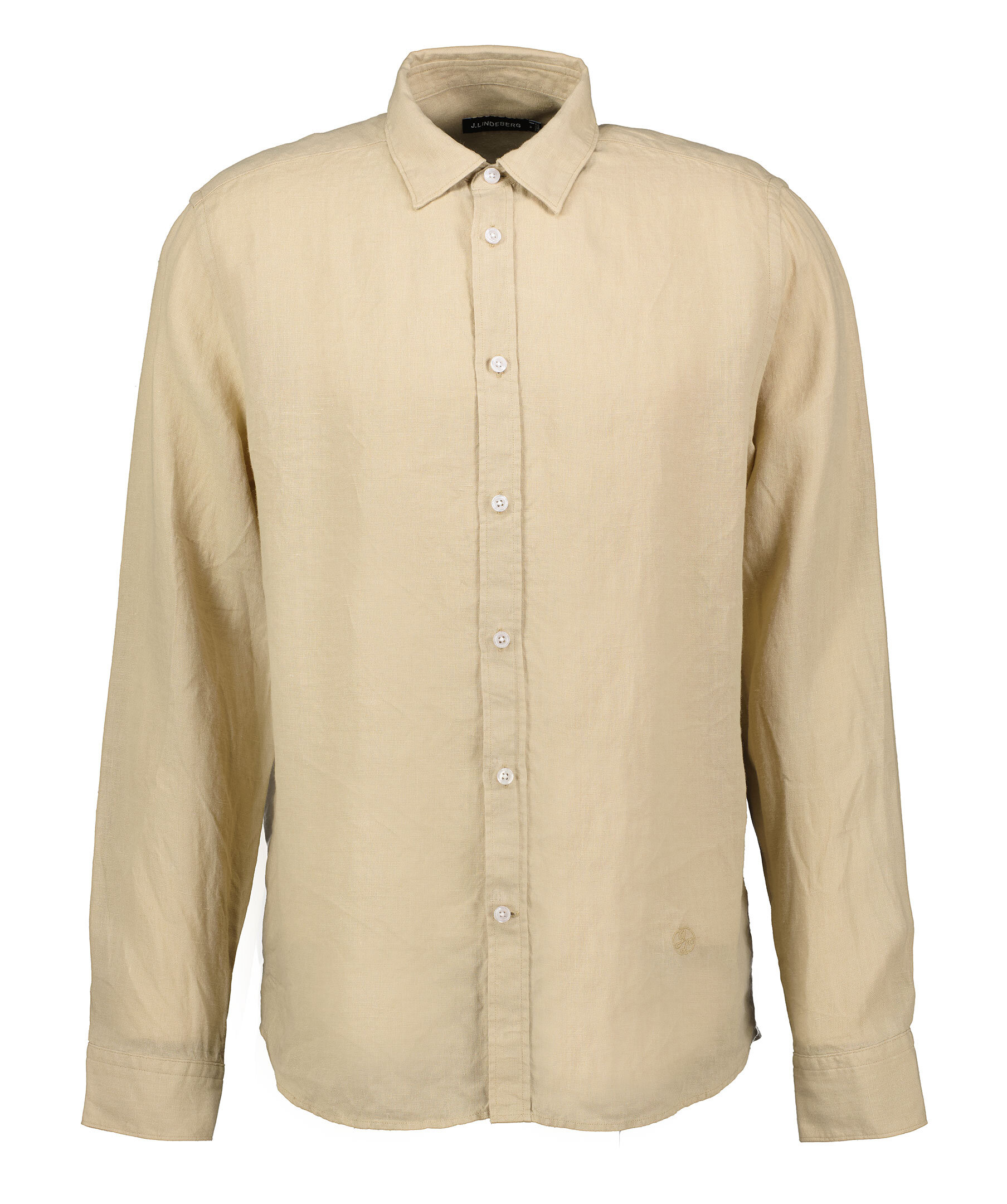 Beige skjorta i linne från J Lindeberg. Stängs framtill med knappar. Bröstficka på vänster sida. Enkla manschetter. Spetsig krage. Broderad logotyp vid midjan på vänster sida. Tillverkad i 100% Linne.