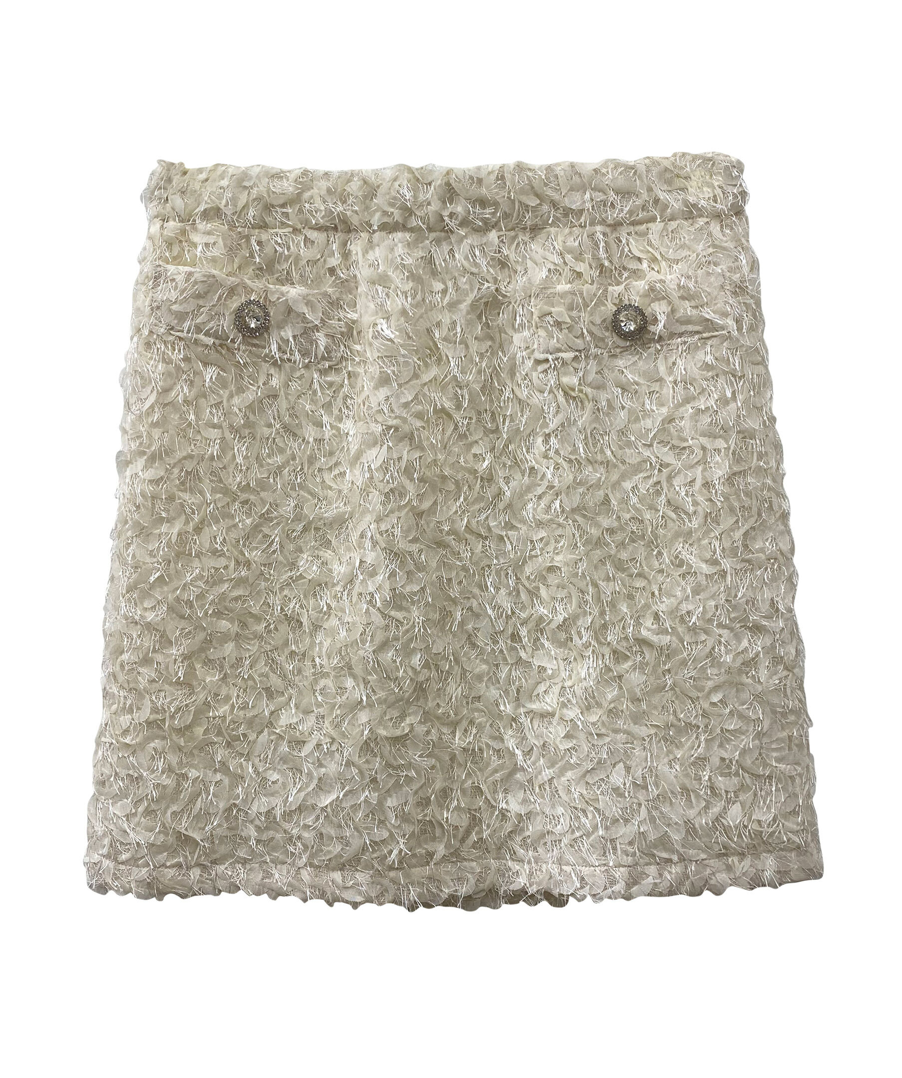 Krämfärgad kjol från Ida Sjöstedt. Minikjol med silverknappar och en elastisk midja för bekväm passform. Kjolen är A-linjeformad och fodrad med ett delikat tyg.