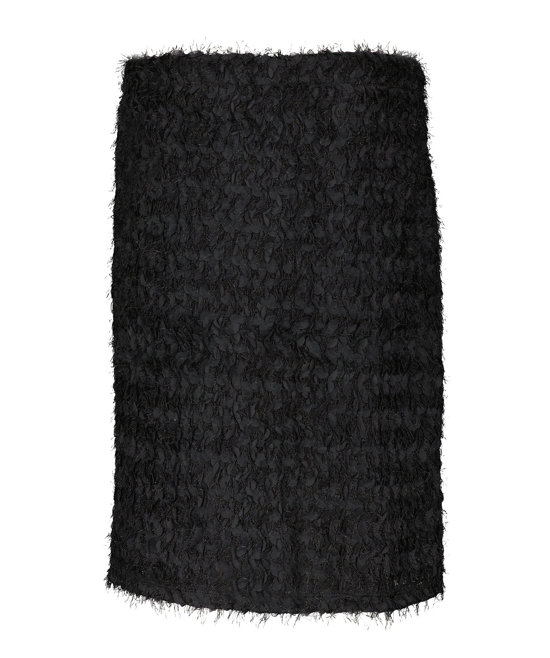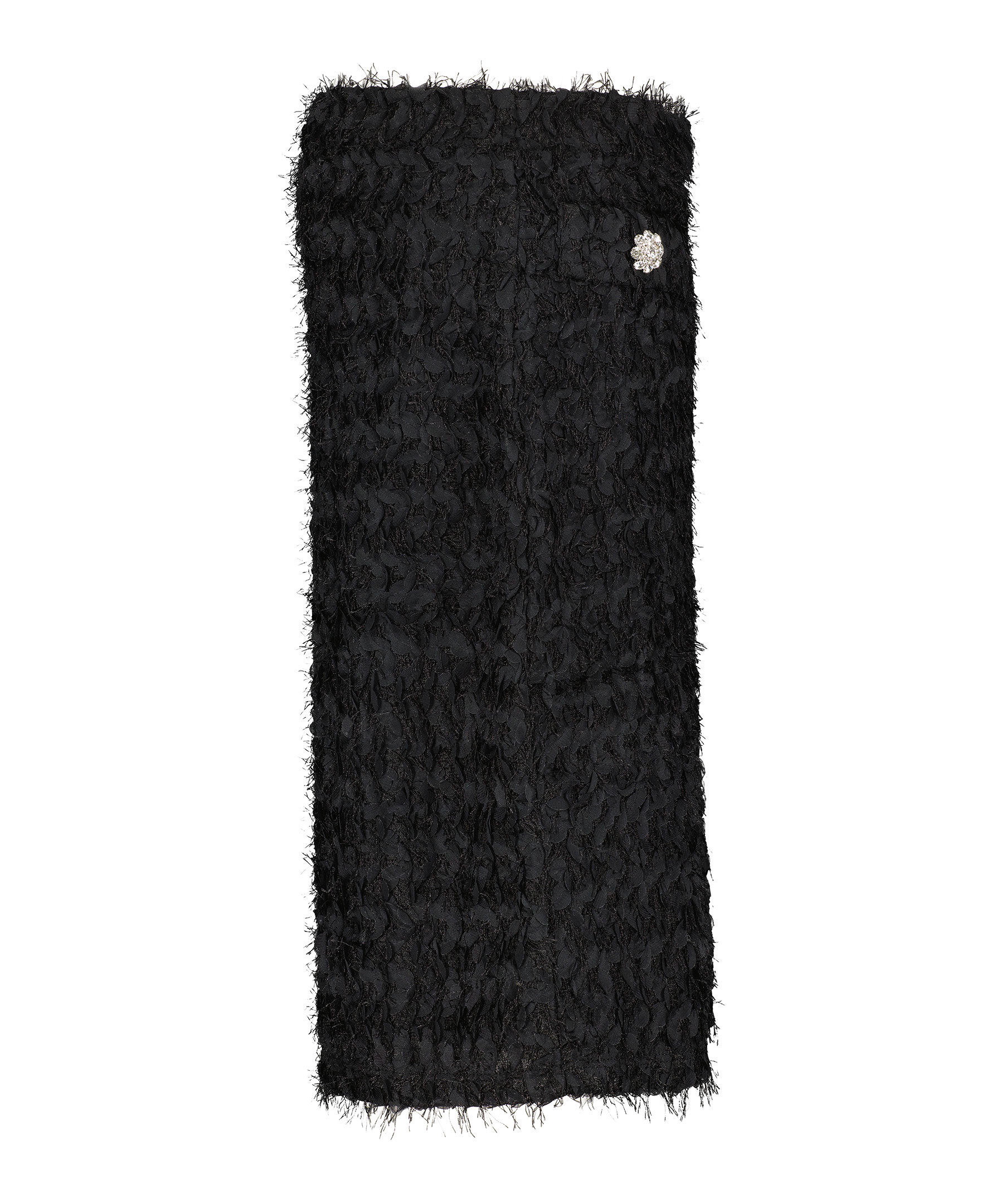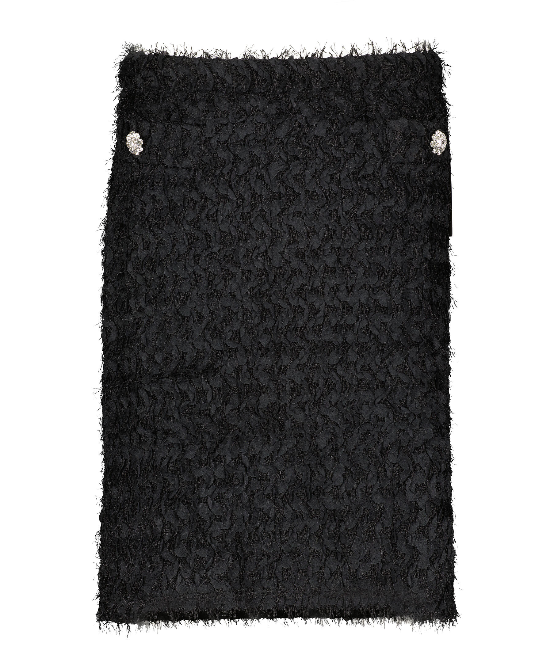 Svart midikjol från Ida Sjöstedt. Kjolen har elastisk midja, dekorativa fickor framtill med glittriga, blomformade strassknappar. Kjolen har även ett heltäckande franstyg. Tillverkad i polyester.