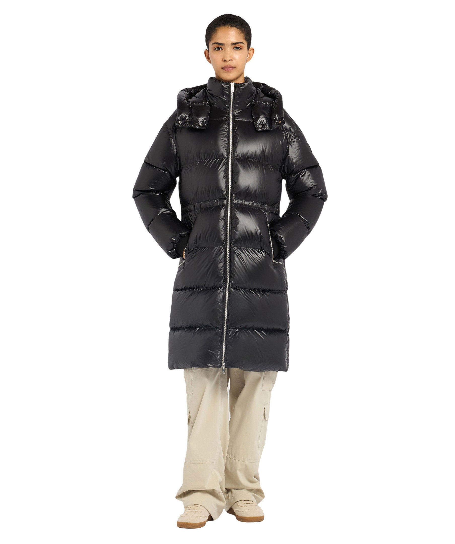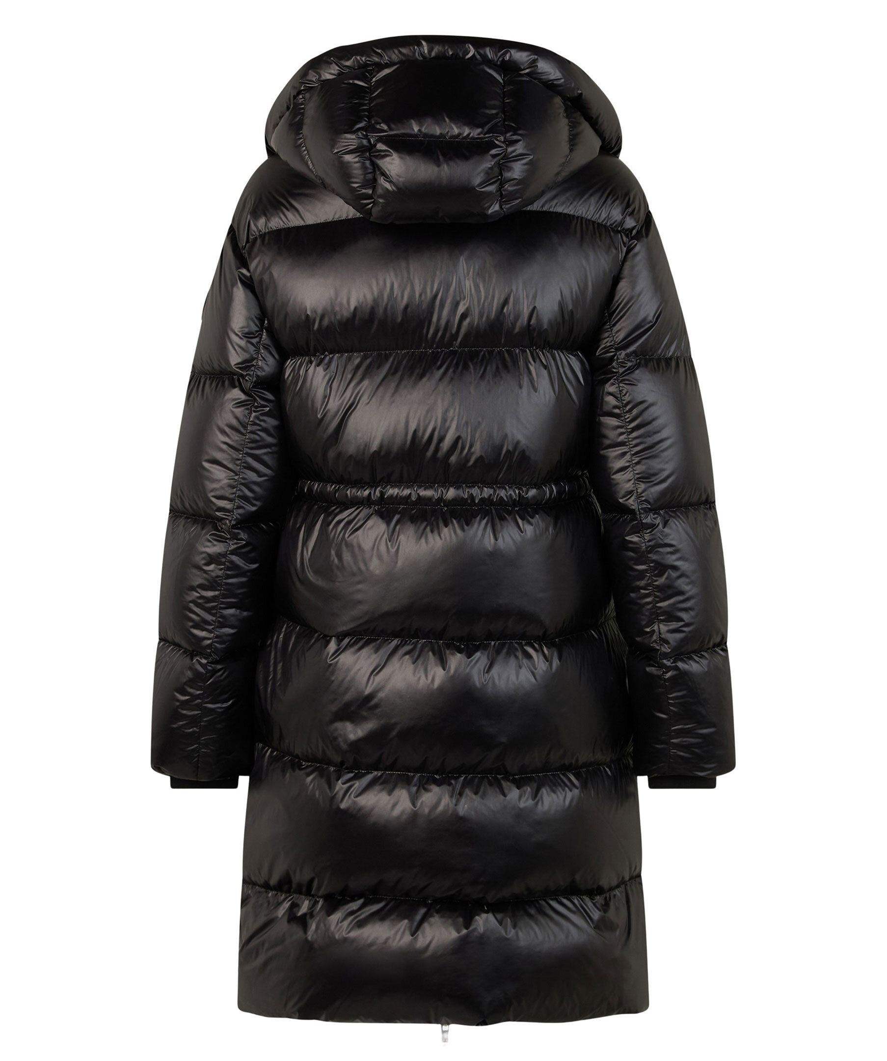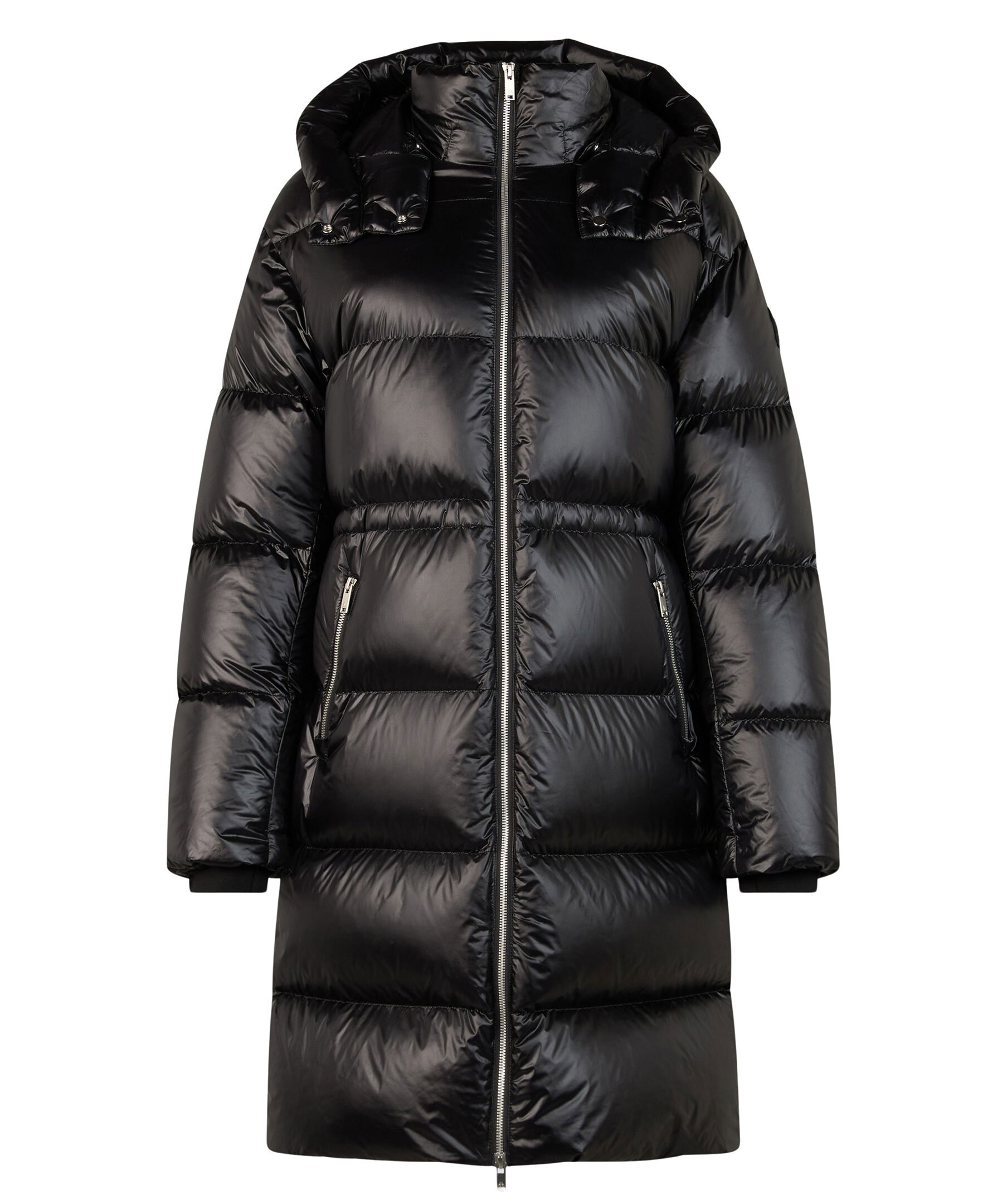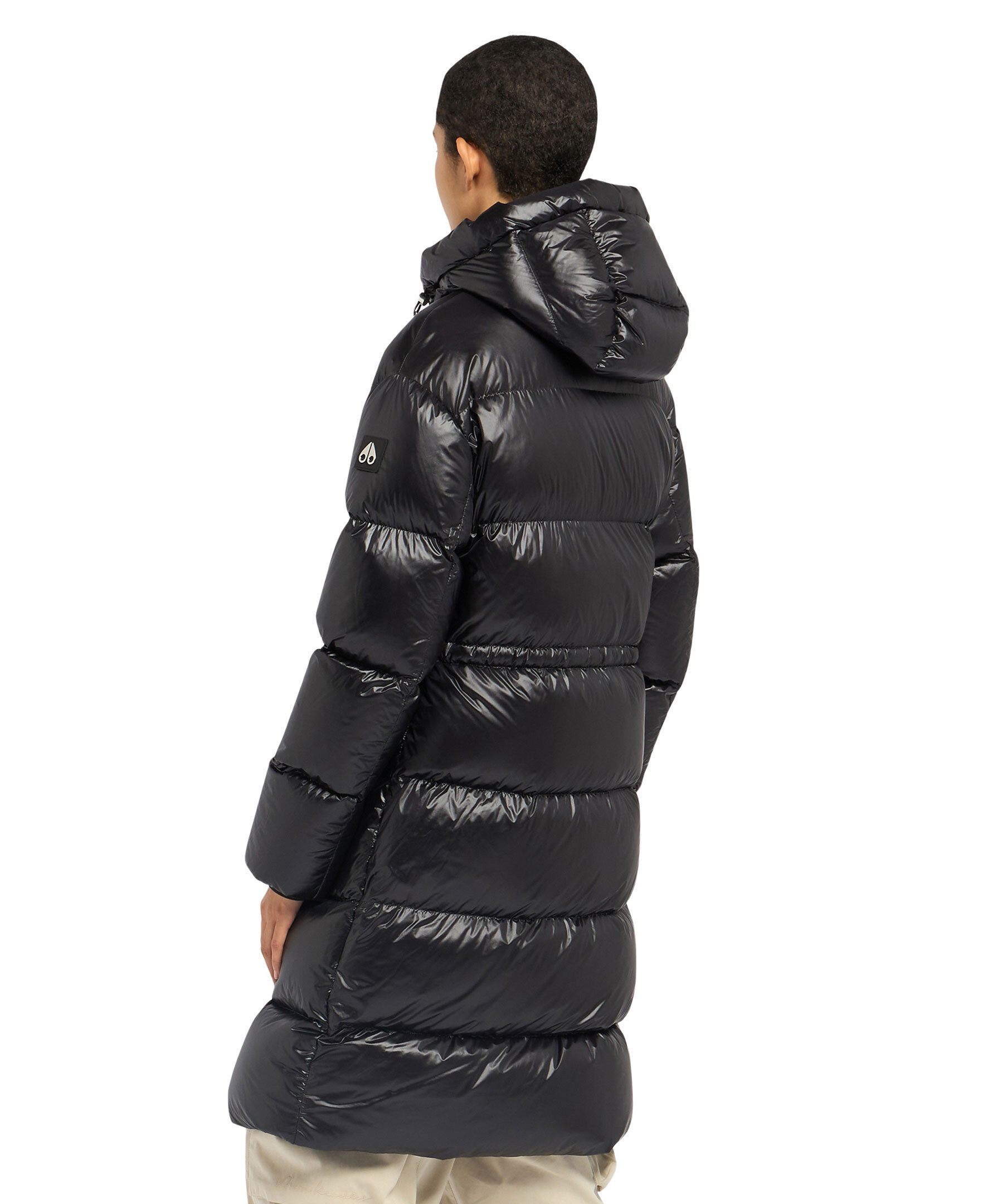 Svart, lång parka från Moose Knuckles. Jackan stängs med tvåvägsdragkedja framtill och har ett glansigt yttertyg, en huva med dragsko, två sidfickor, innerfickor, dold dragsko i midjan samt metallogotyp på vänster ärm. Tillverkad i nylon med gåsfjädervaddering.