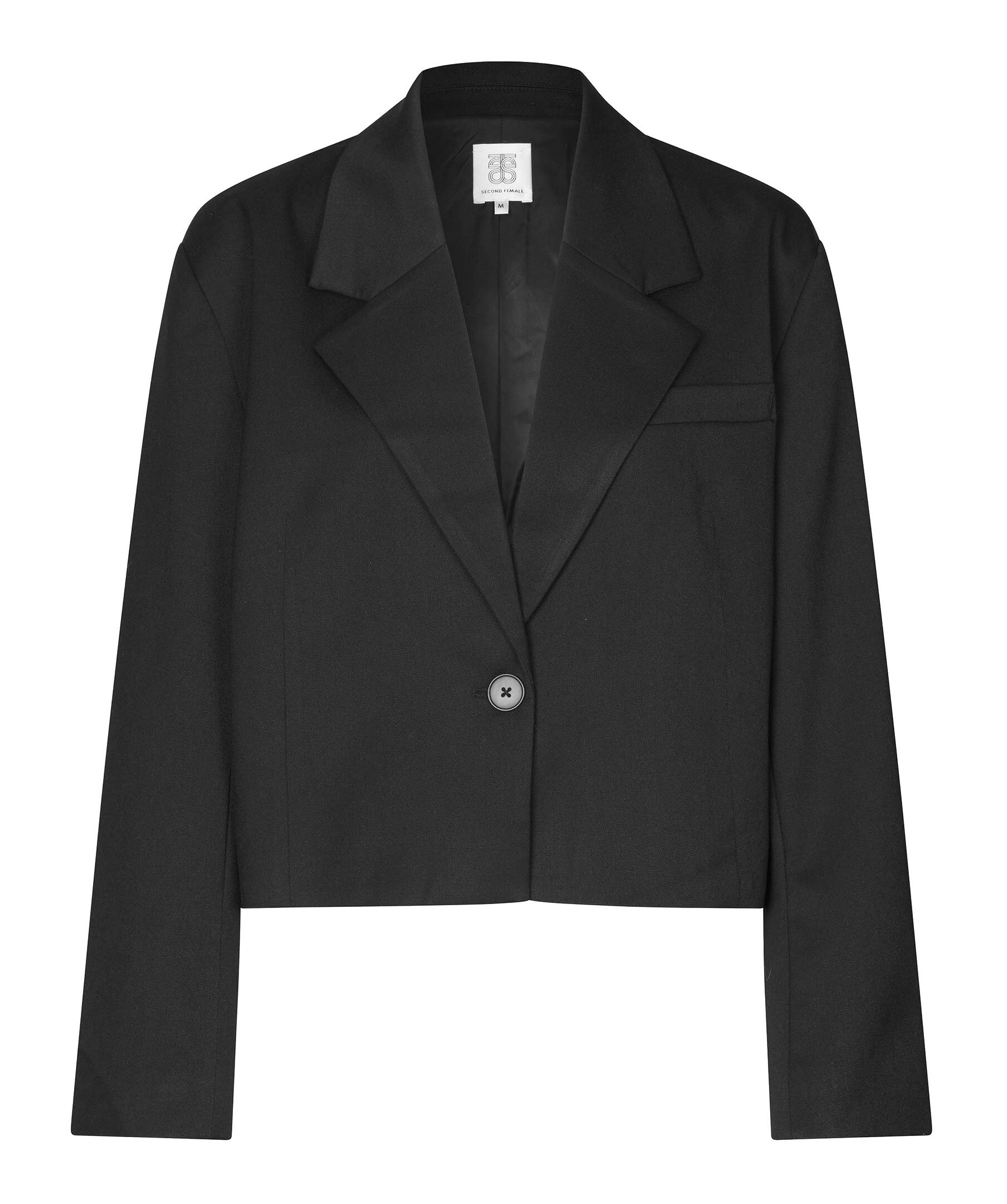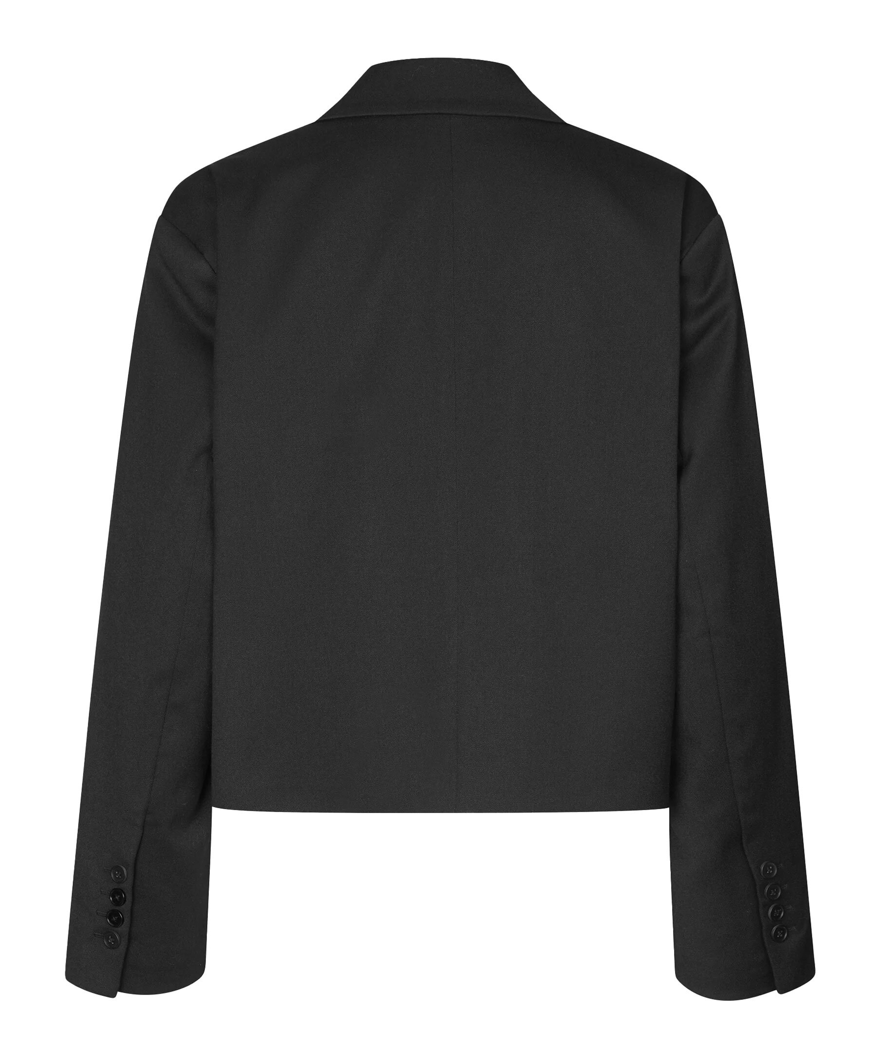 Svart enkelknäppt kavaj i cropad modell från Second Female. Bröstficka på vänster sida. Stora slag. Ärmslut med fyra knappar. Vadderade axlar med långa ärmar.