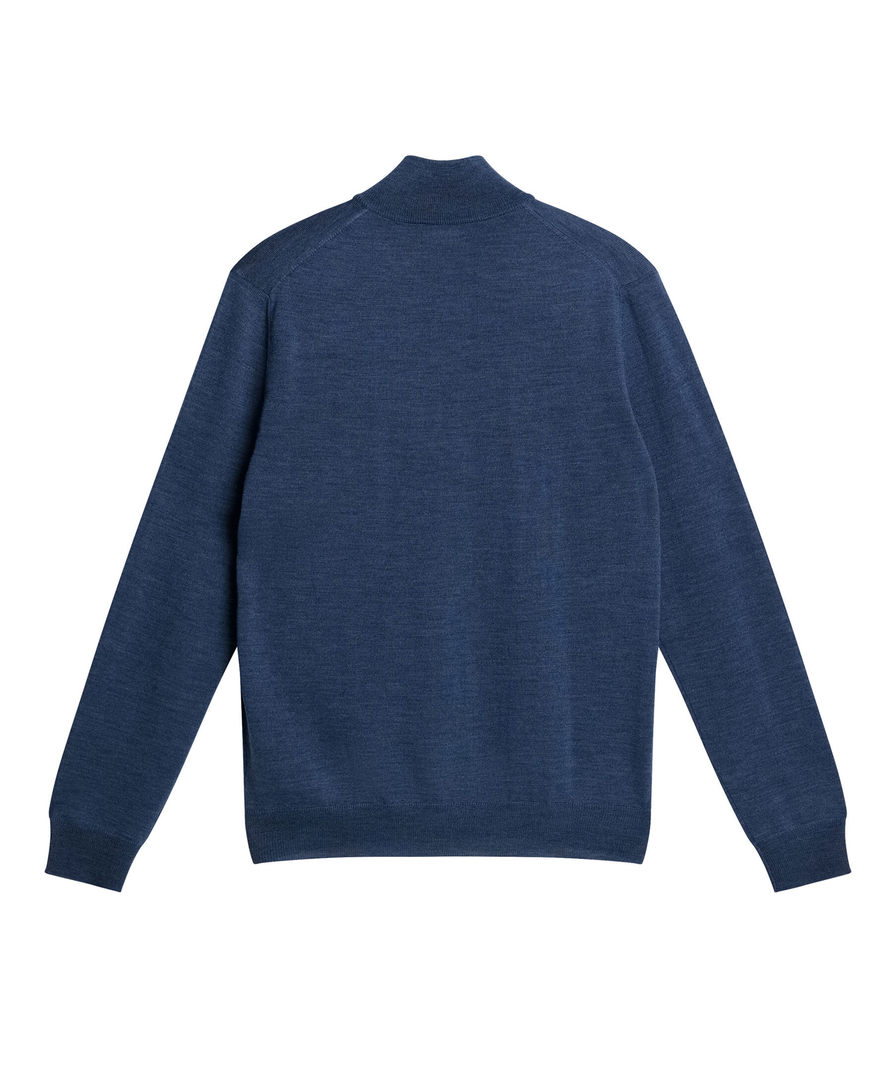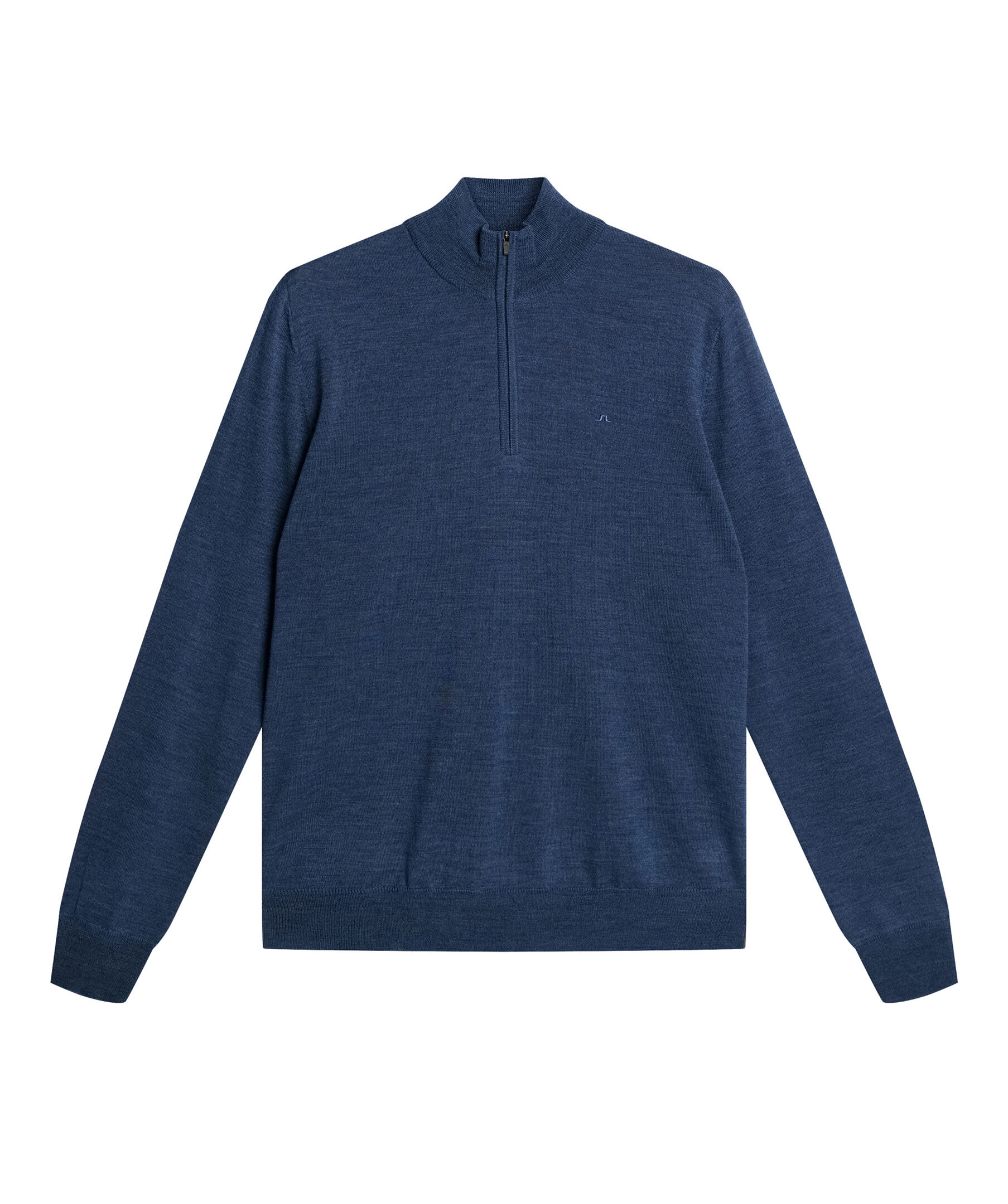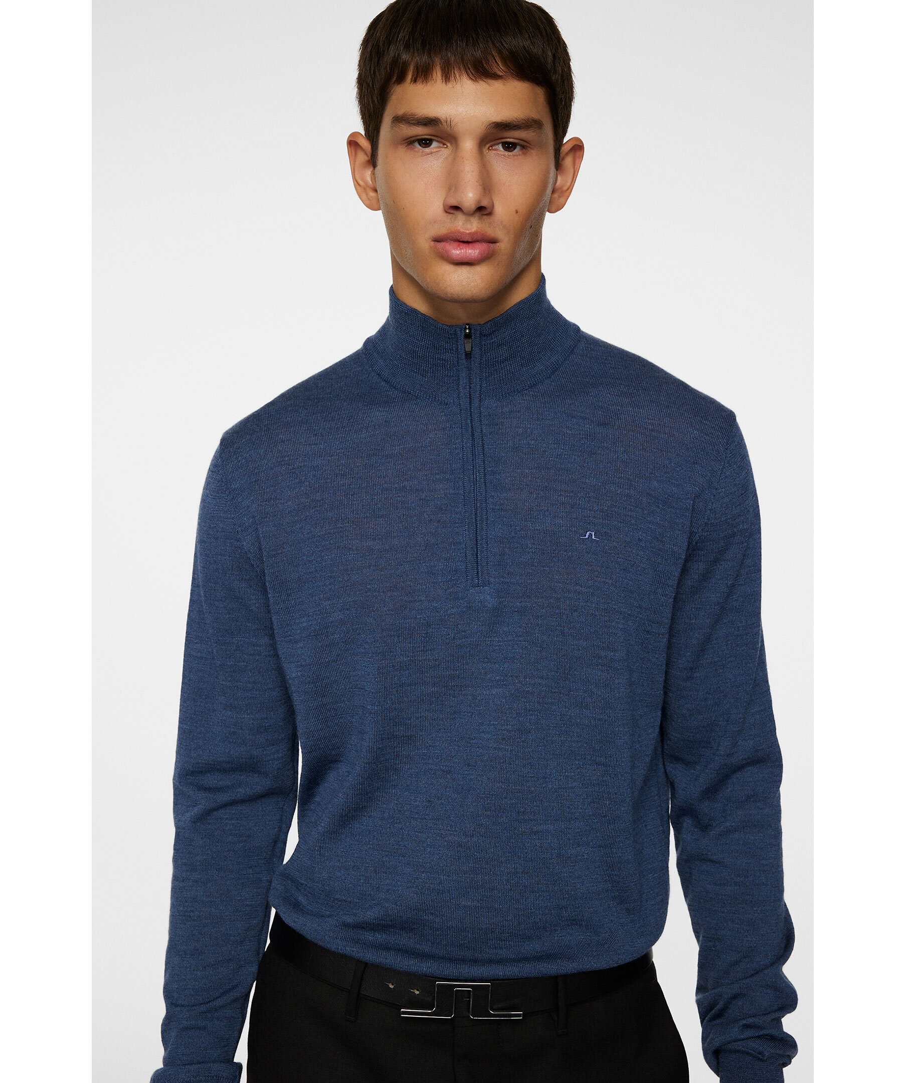 Blå half-zip tröja från J.Lindeberg. Tröjan har en ribbstickad krage och en diskret färg i färg logotyp på vänster bröst. Ribbstickade ärm- och tröjavslut. Tillverkad av 100% merinoull.