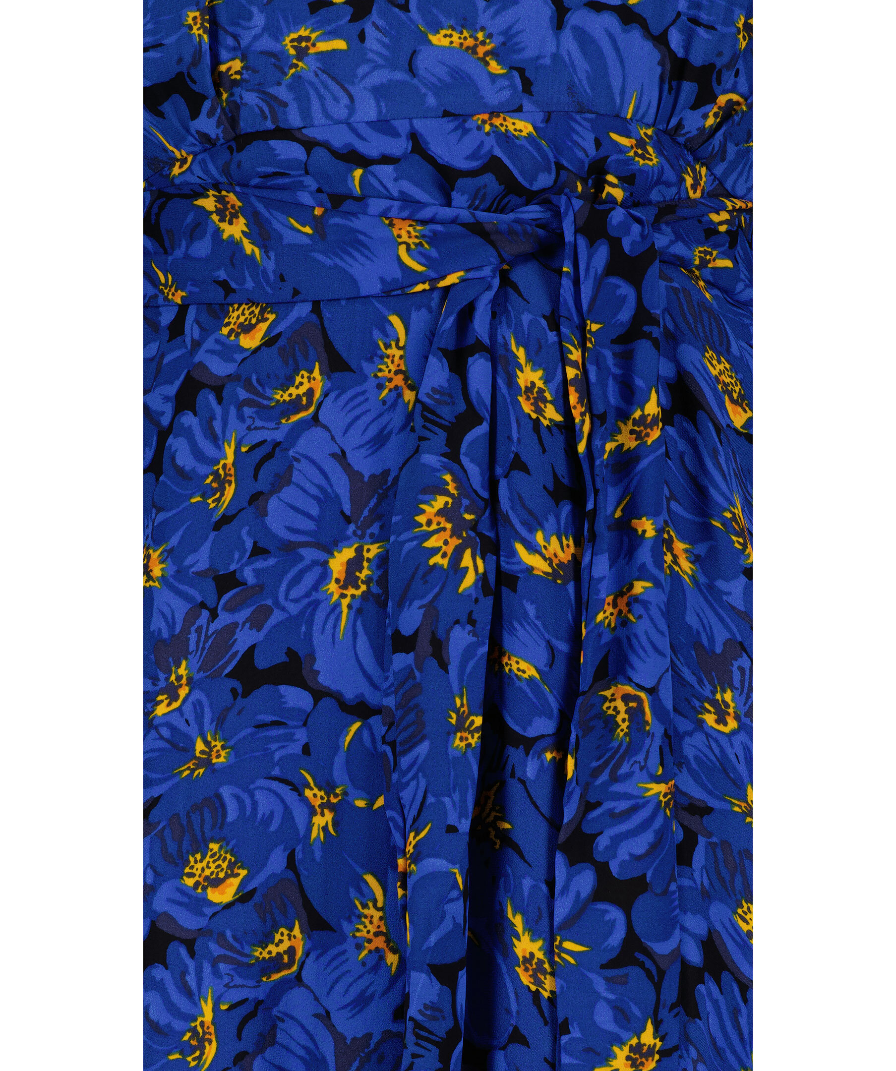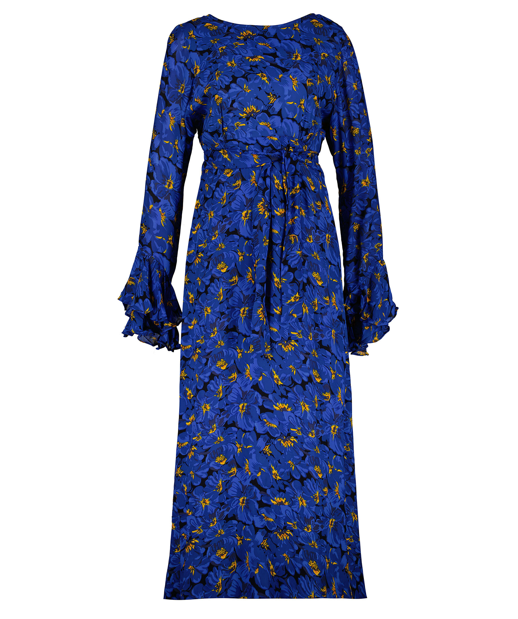 Blåblommig långklänning från Faithfull The Brand. Klänningen har en hög halsringning och en utskärning i ryggen med knyt i nacken. Elastiskt band i svanken. Långa ärmar med volanger vid ärmslutet.