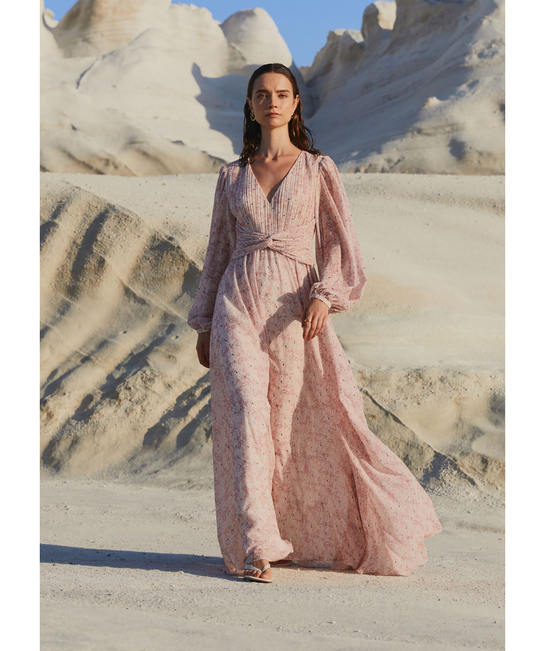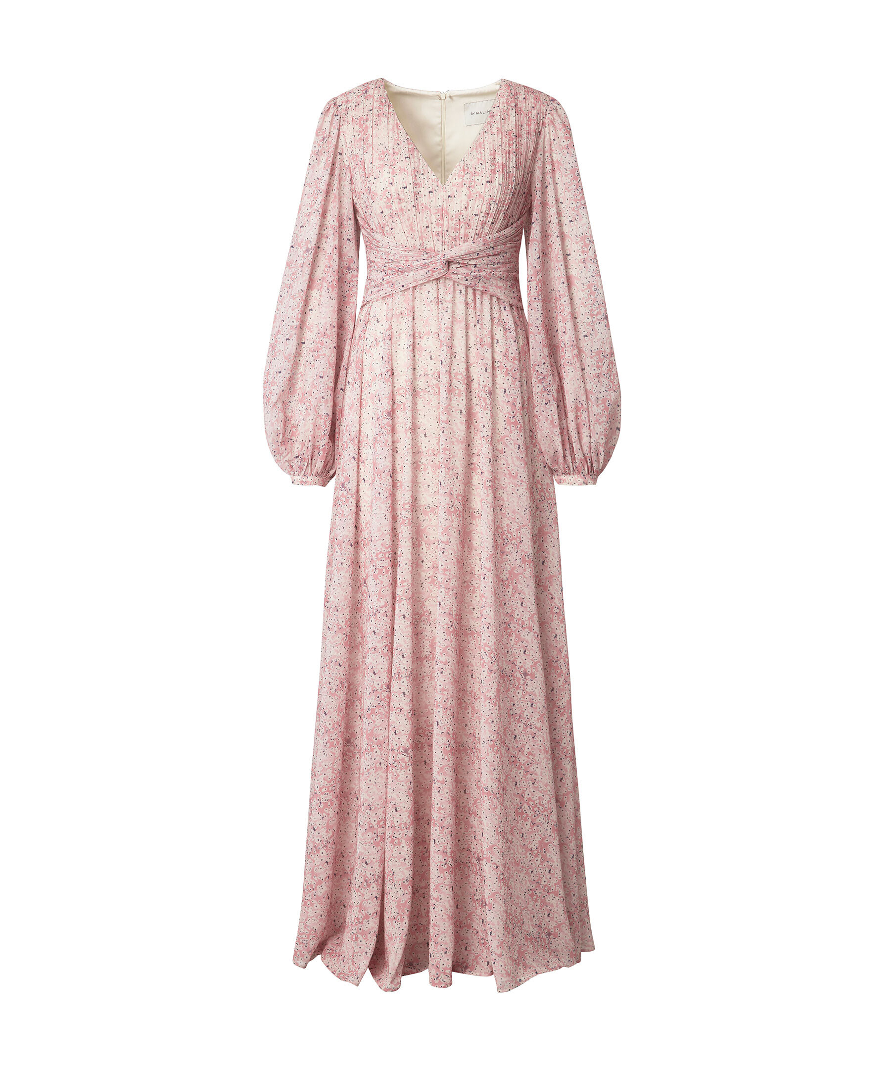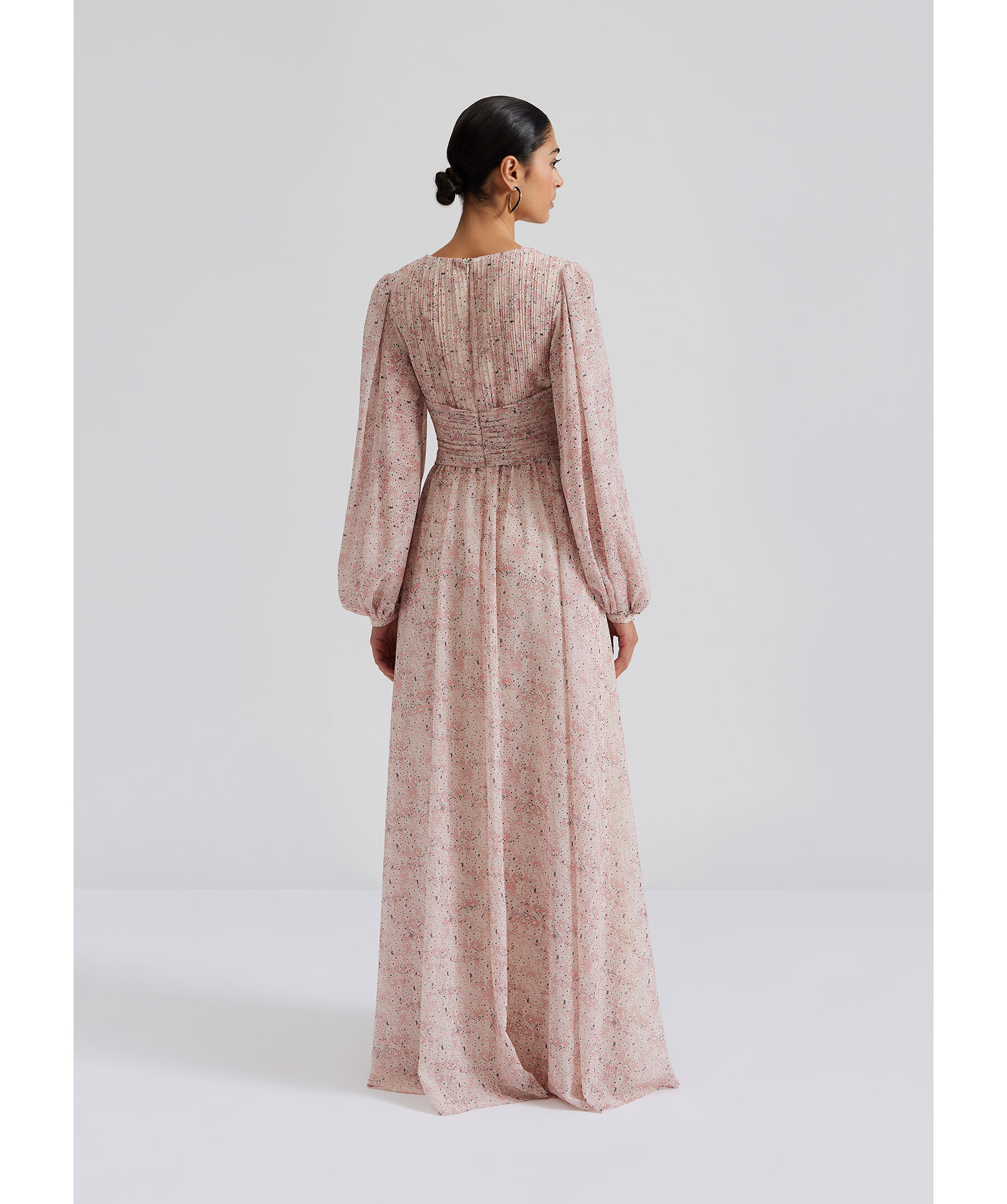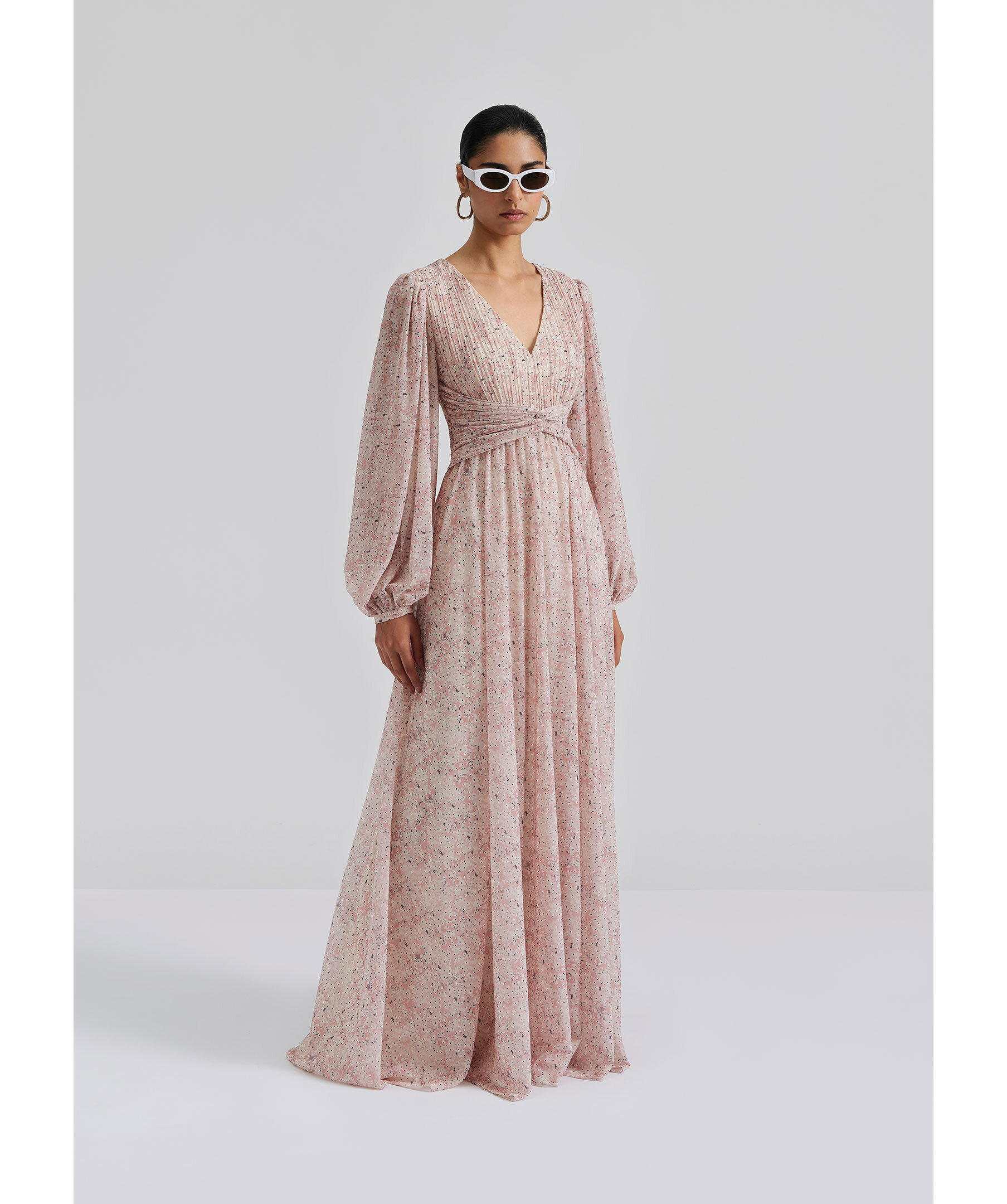 Maxiklänning med vackers blommönster från By Malina. V-ringning, långa luftiga ballongärmar och markerad i midjan. Dold dragkedja baktill.