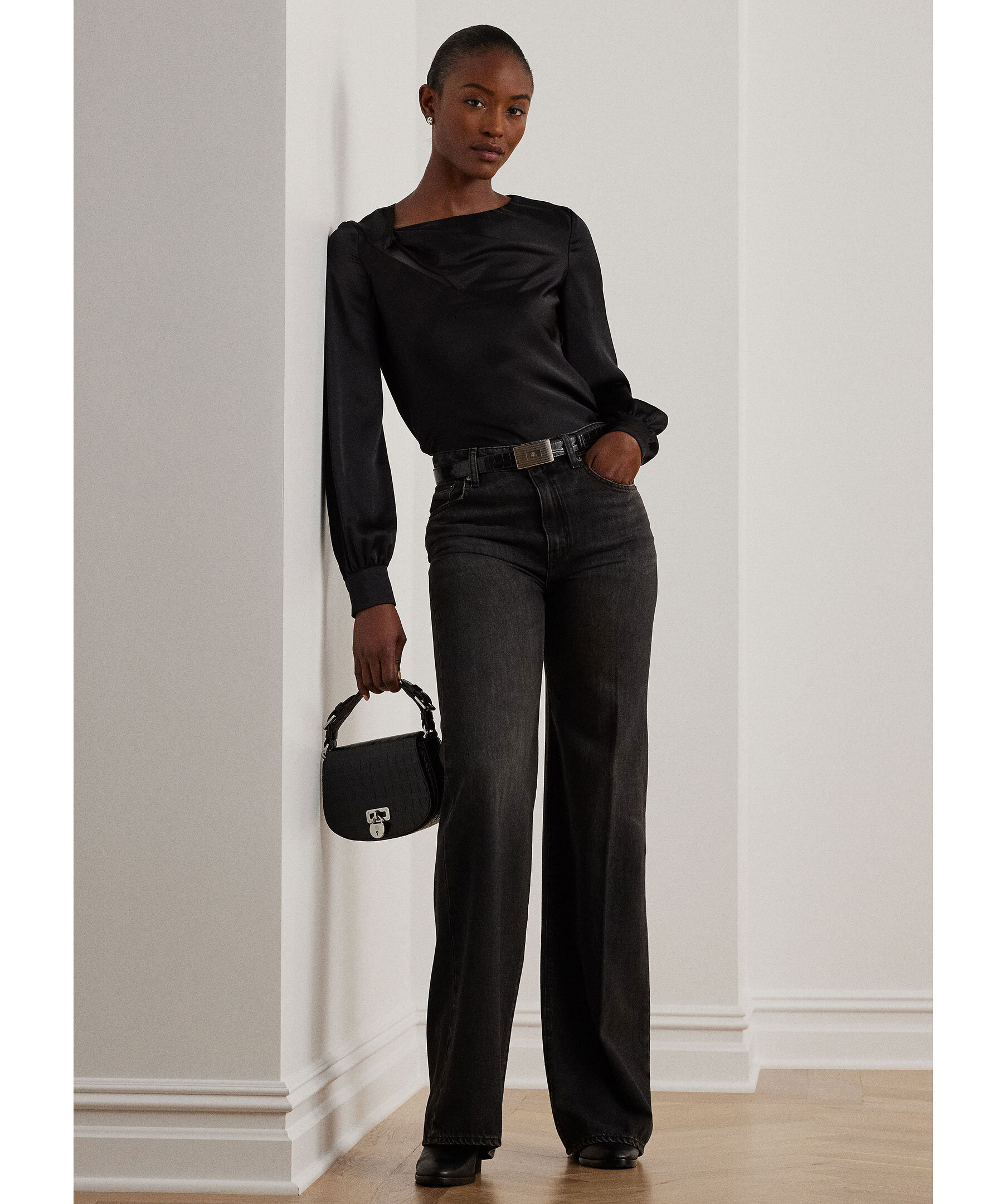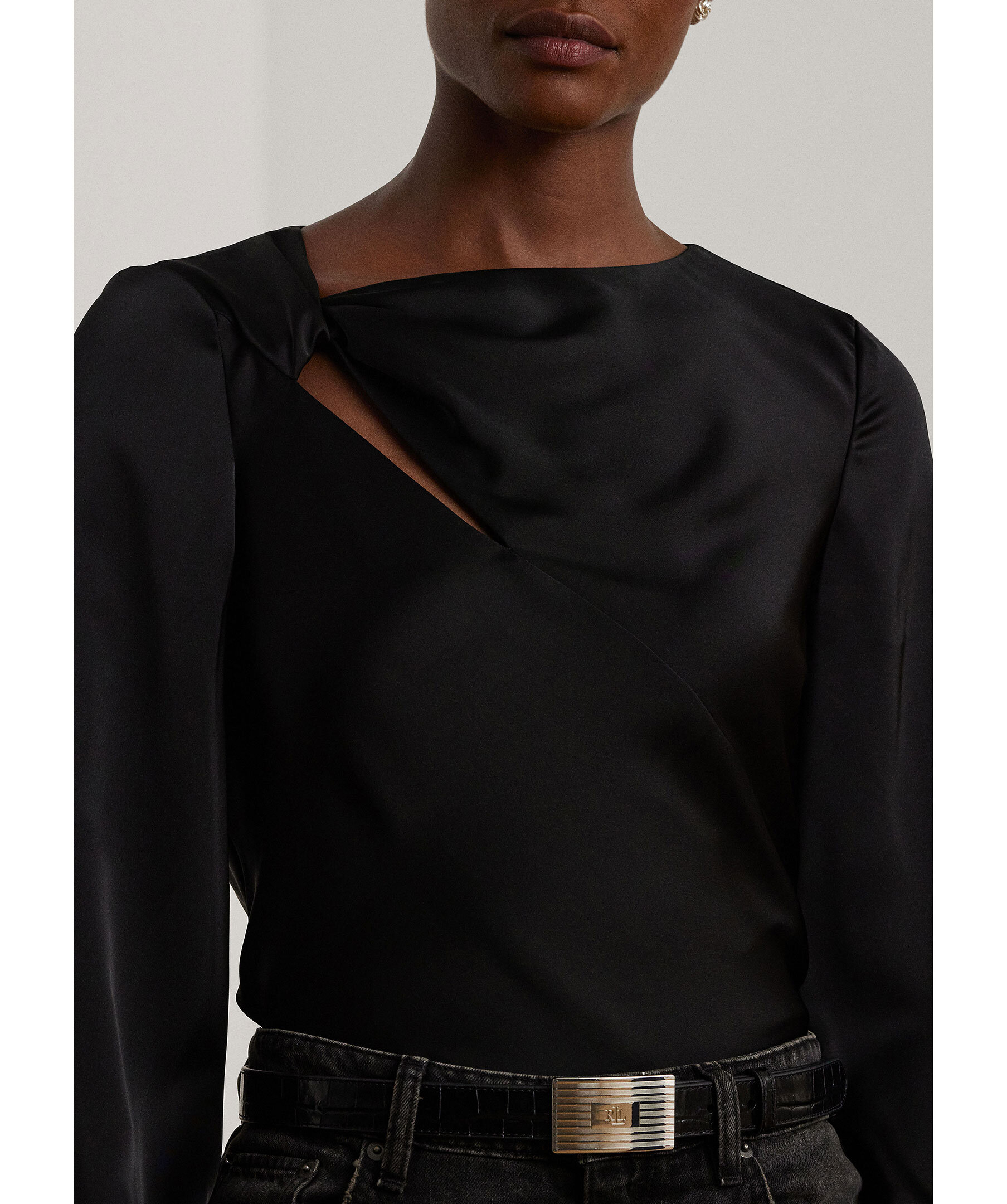 Svart glansig blus från Ralph Lauren. Blusen är långärmad och har en asymmetrisk halsöppning. Dekorativt sydd med en öppning strax ovan bröstet. Graverade manschett knappar med LrL. Tillverkad av en polyesterblandning.
