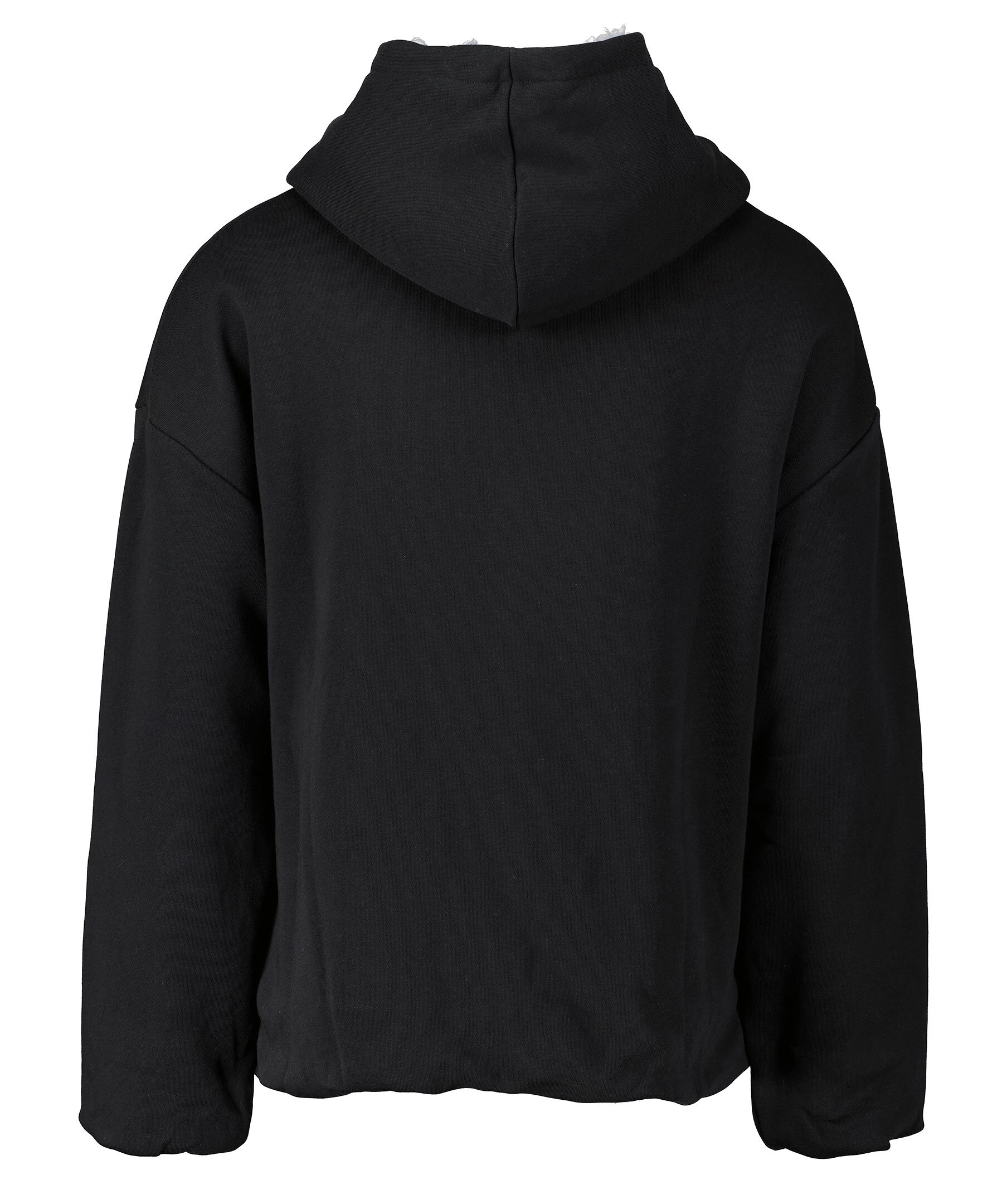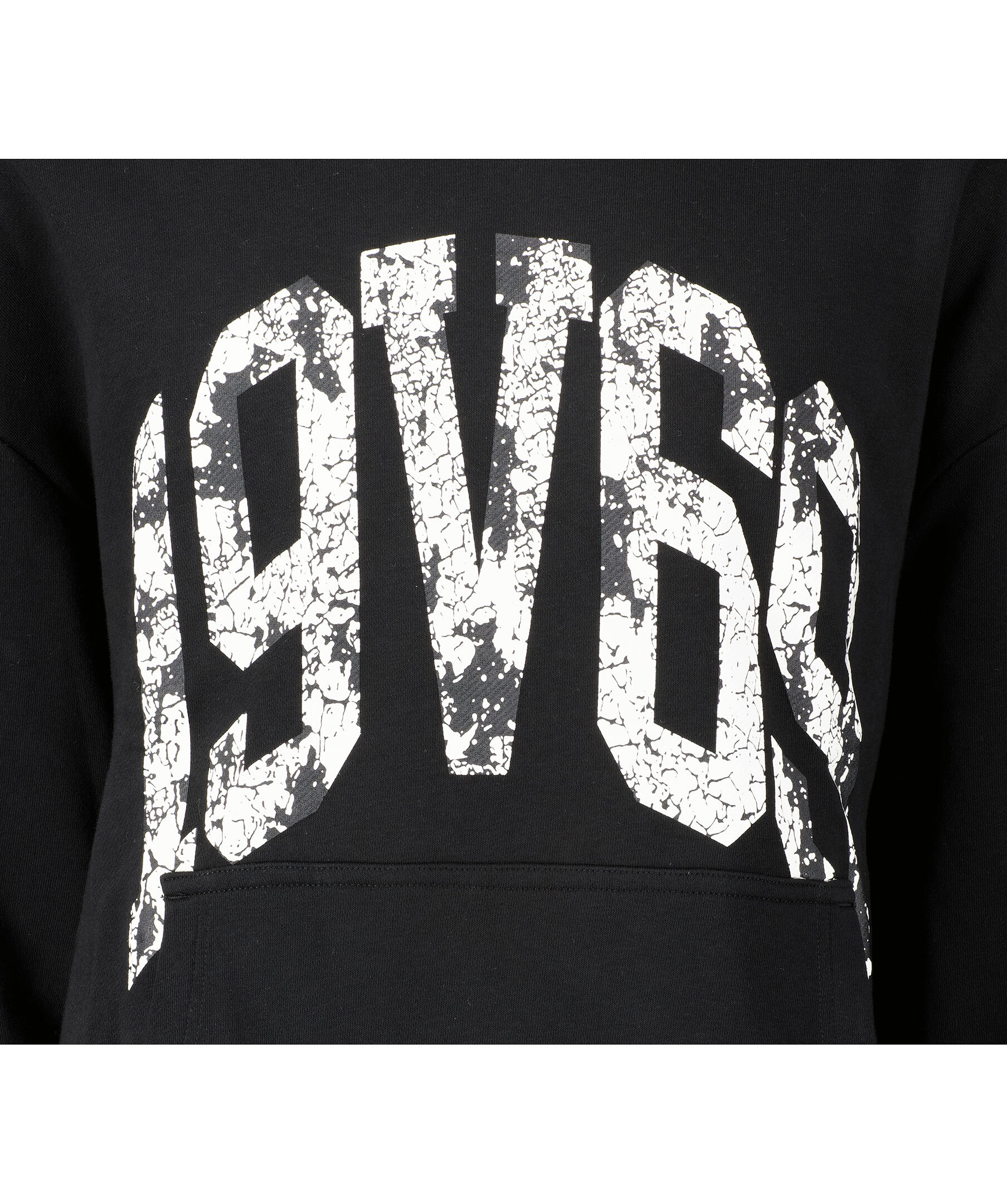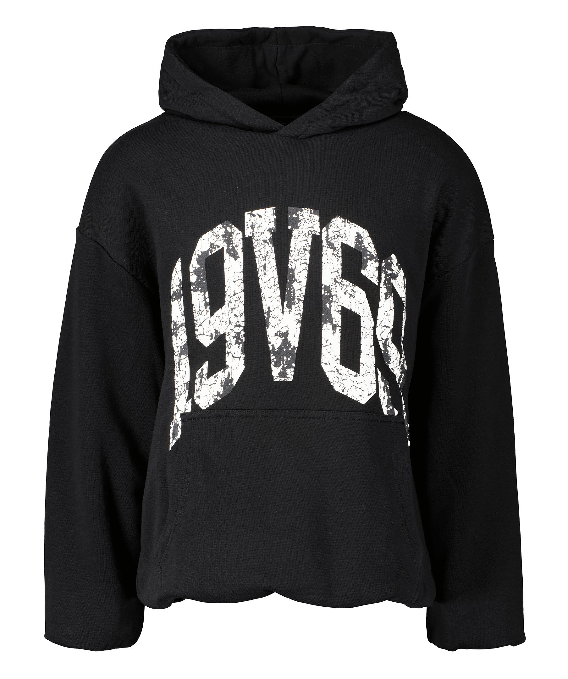 Svart hoodie från 19V69 Italia by Versace. Stort, vitt krackelerat och gummerat tryck på framsidan. Tillverkad i en bomull- och polyesterblandning. Känguruficka på magen.