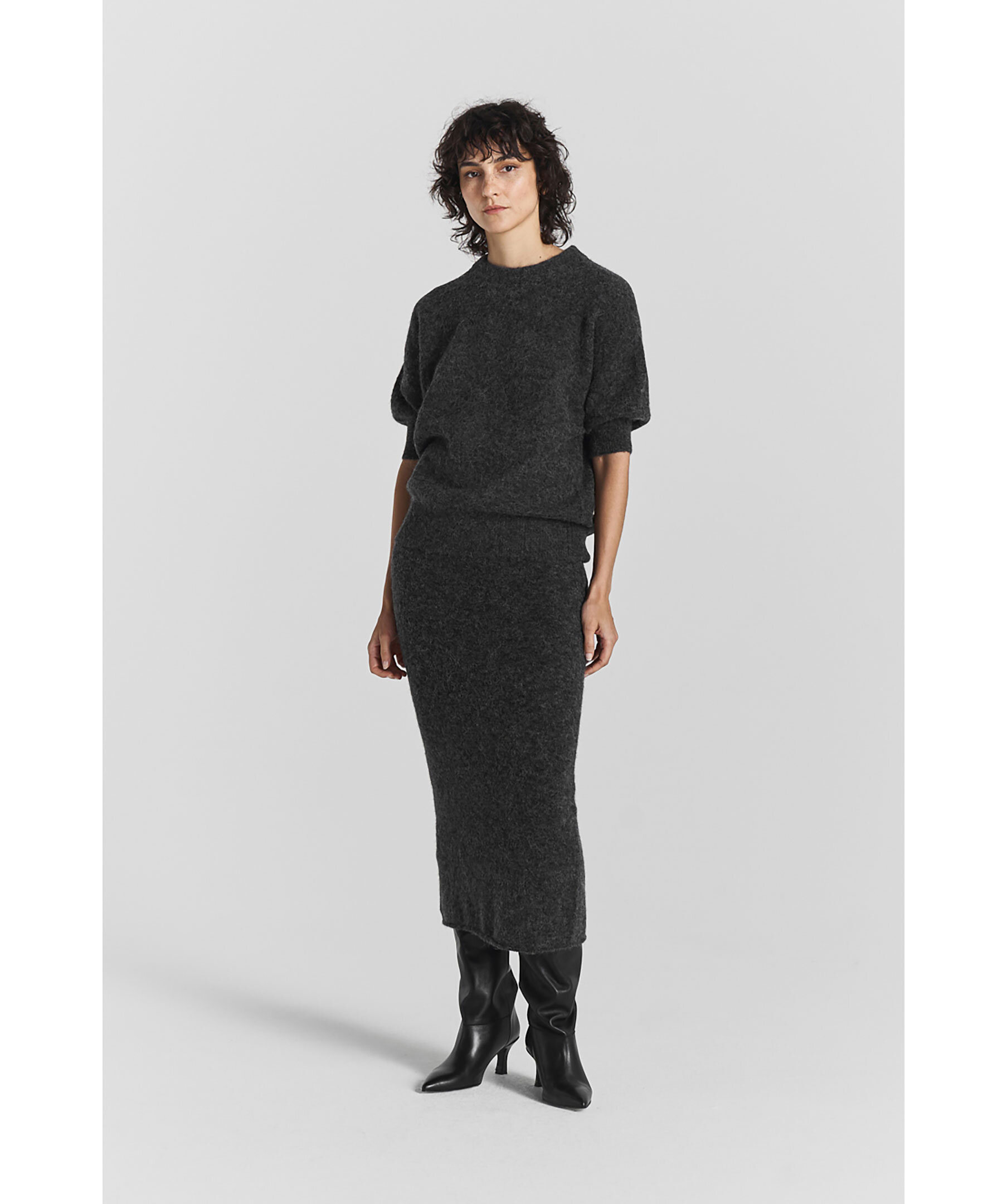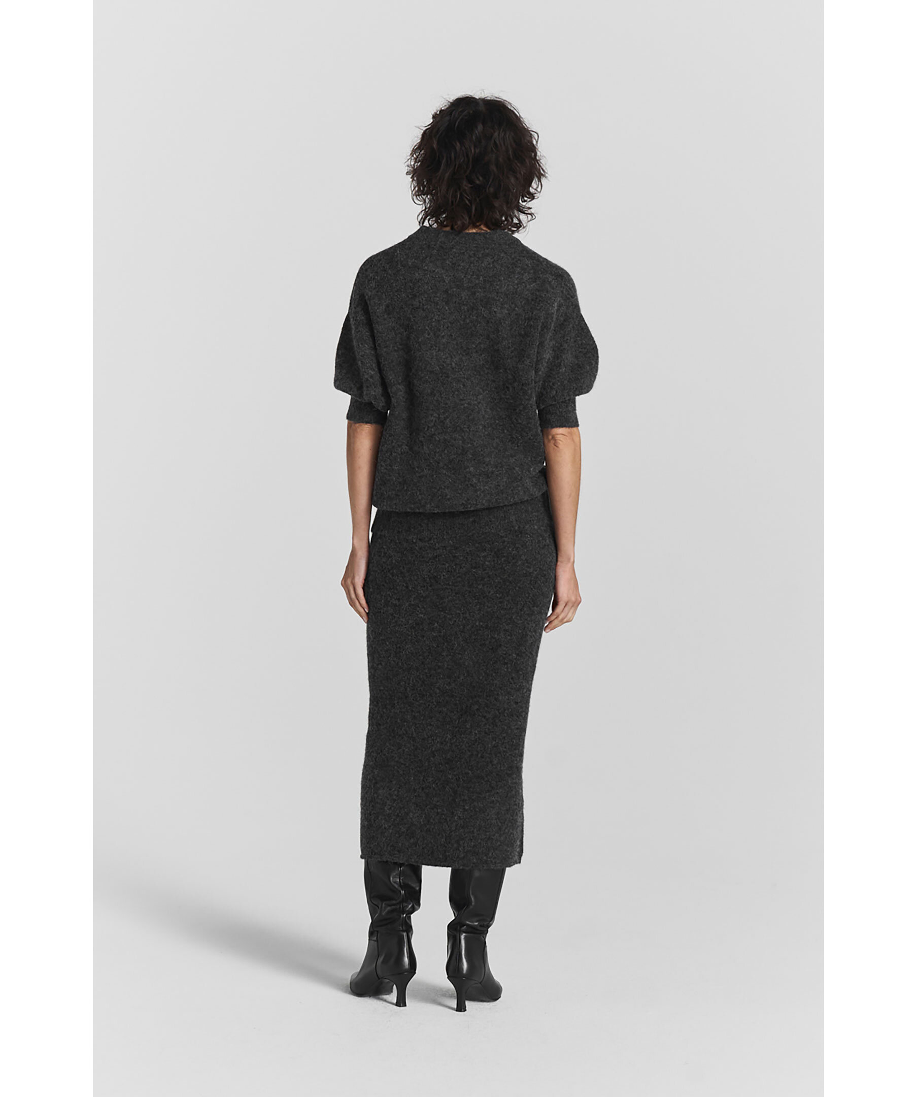 Mörkgrå, stickad pennkjol från Twist&Tango. Gjord i en fin alpackablandning. Kjolen har en midi-längd med elastisk midja.