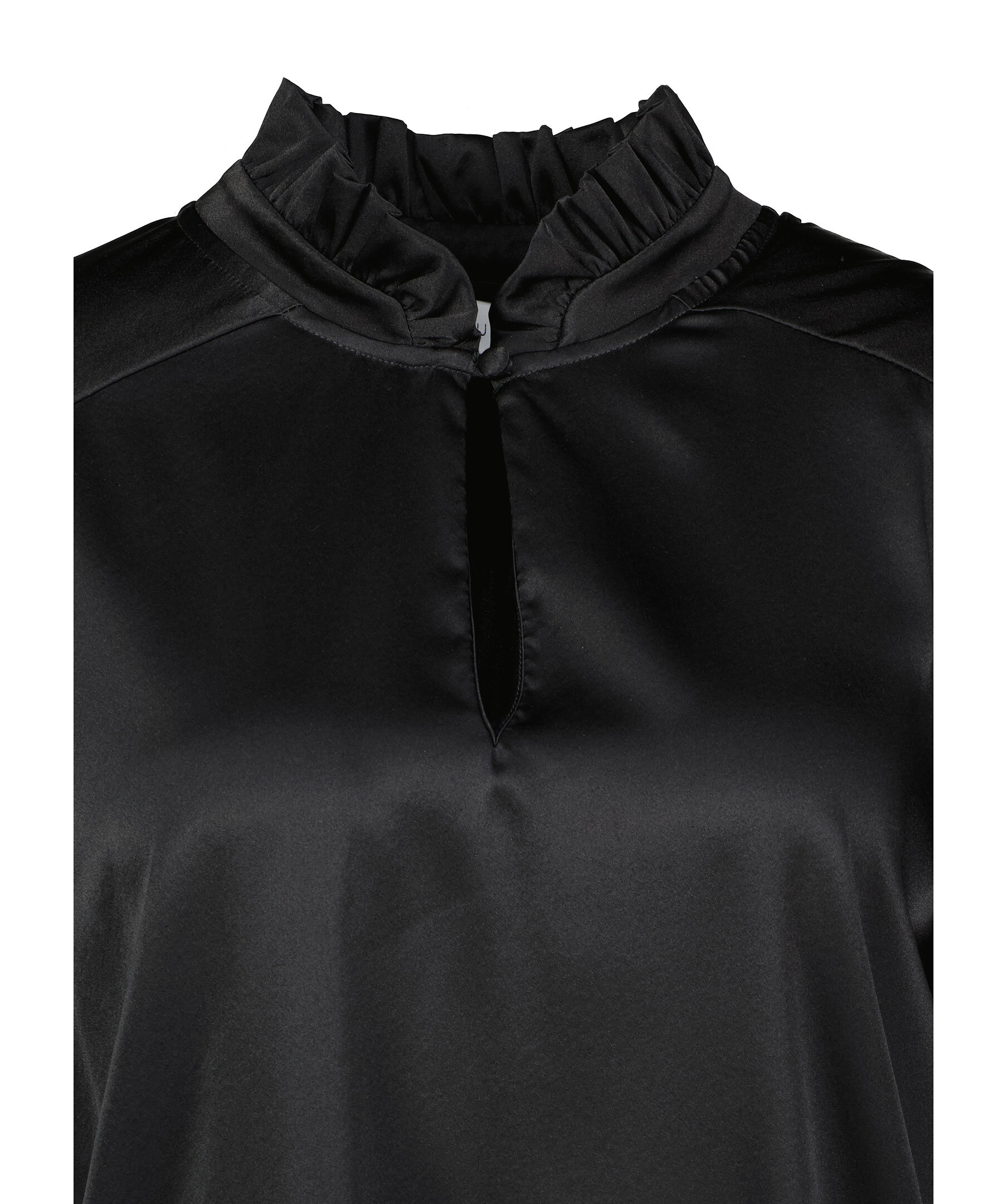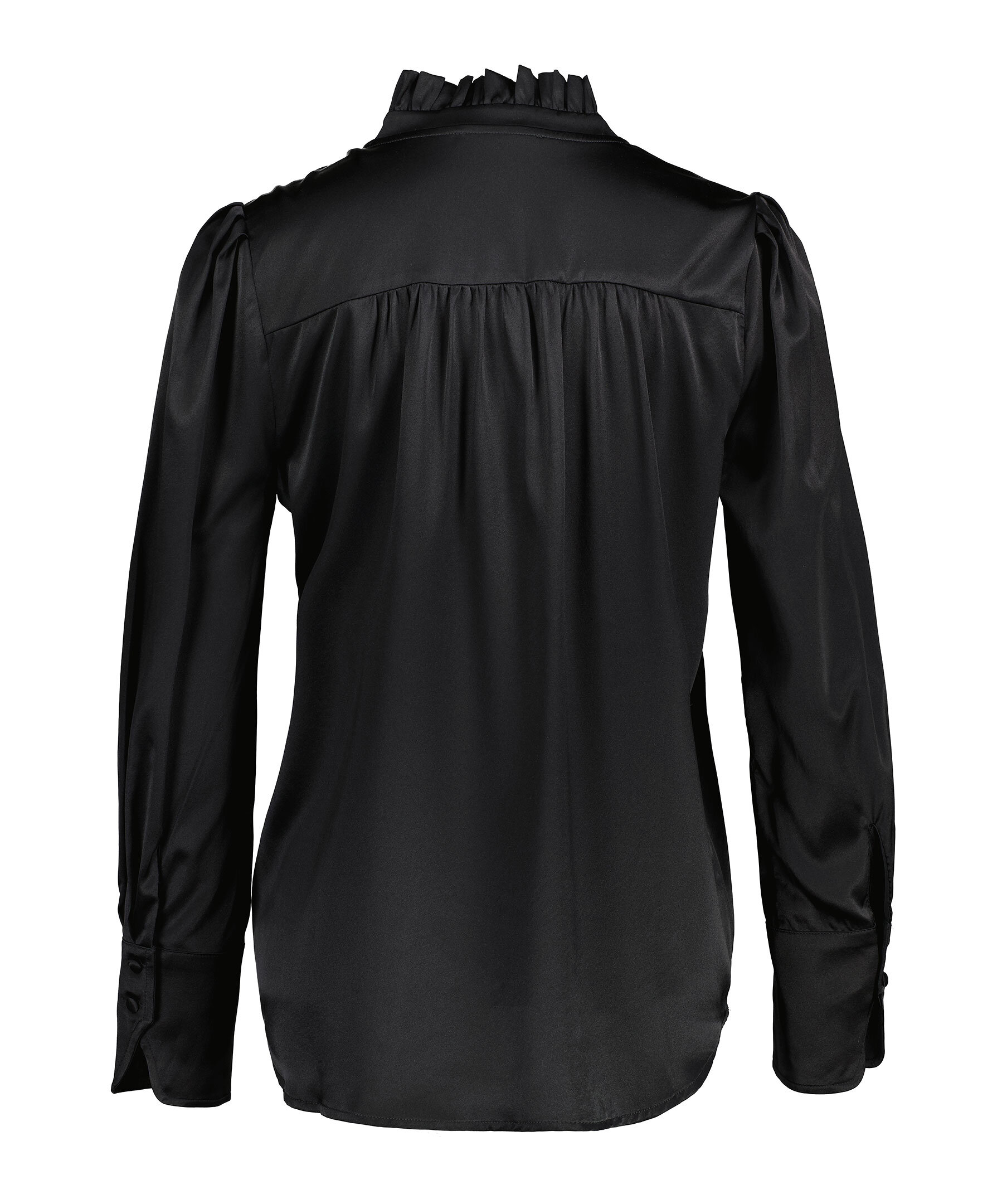 Svart silkblus från My Aurora. Blusen har rynkad halsringning med volangkrage samt manchetter vid ärmslut och liten öppning med knapp. Tillverkad i en silkblandning.