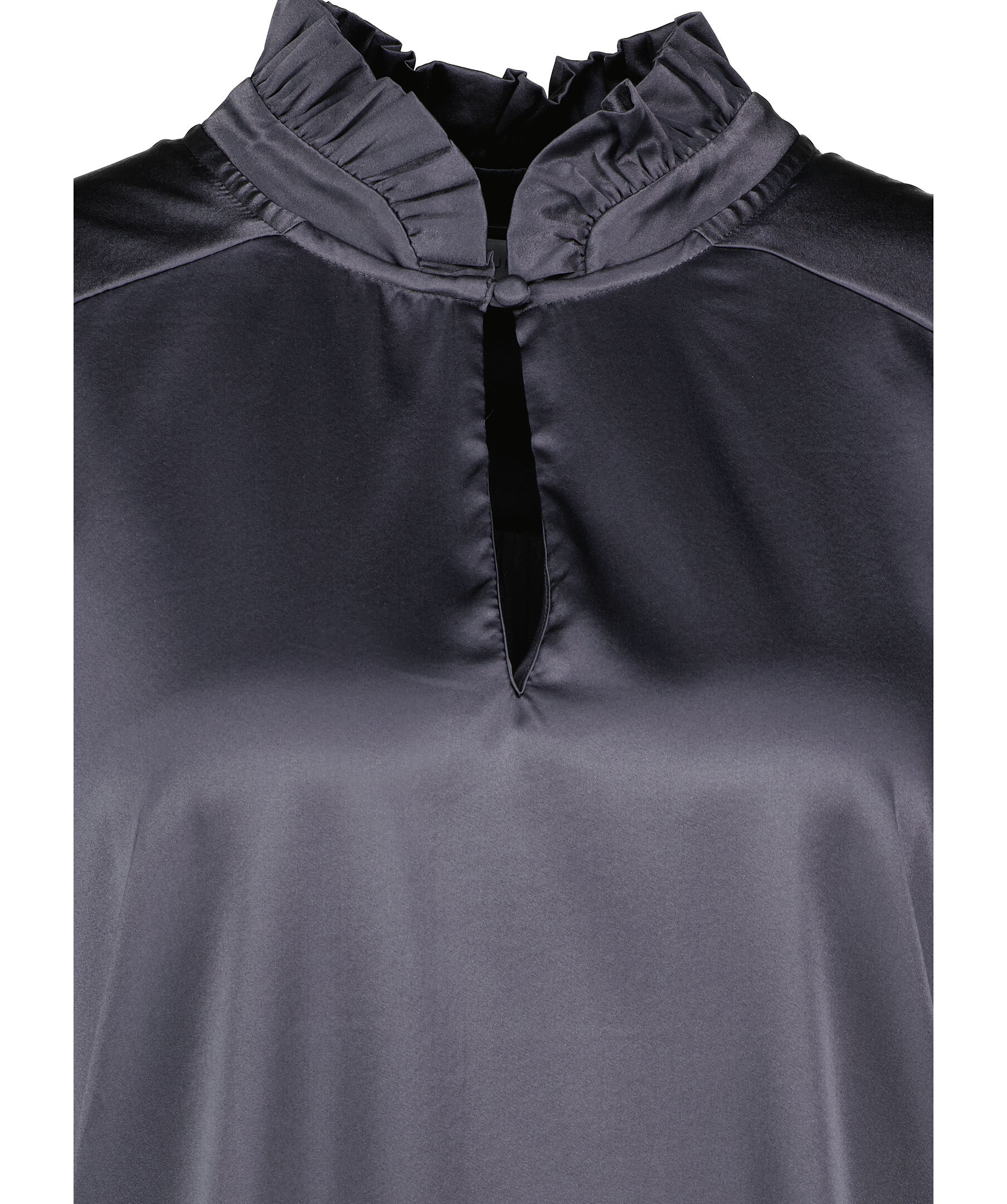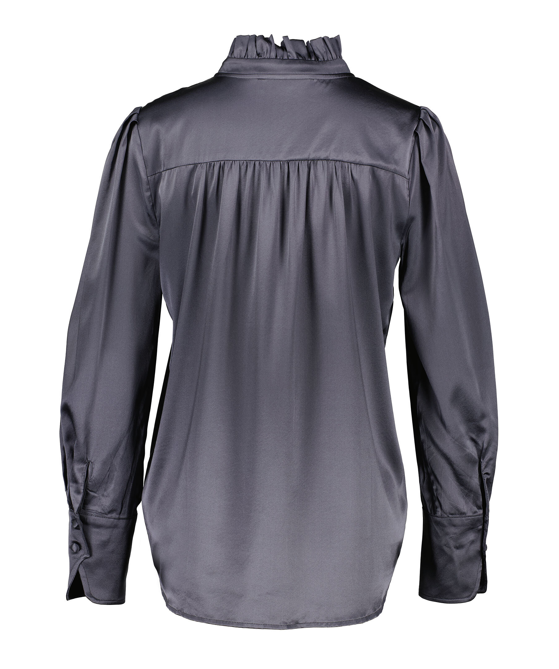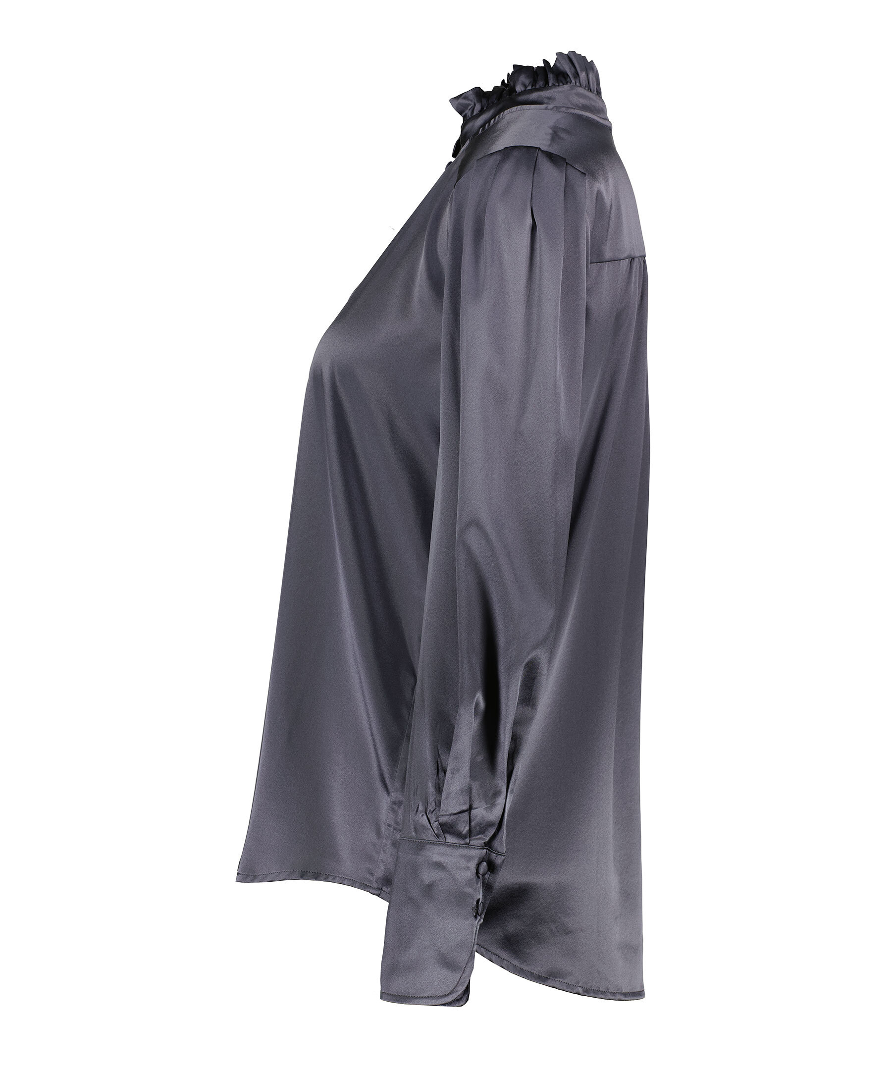 Grå silkblus från My Aurora. Blusen har rynkad halsringning med volangkrage samt manchetter vid ärmslut och liten öppning med knapp. Tillverkad i en silkblandning.