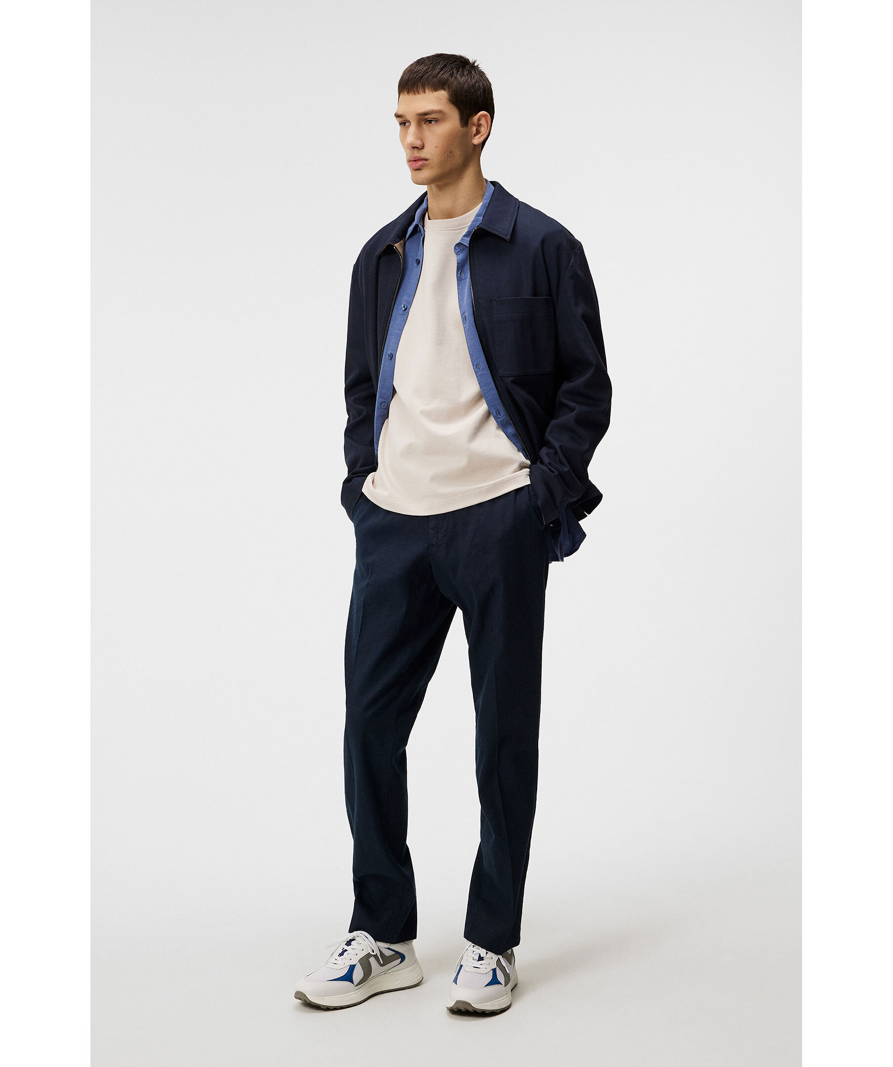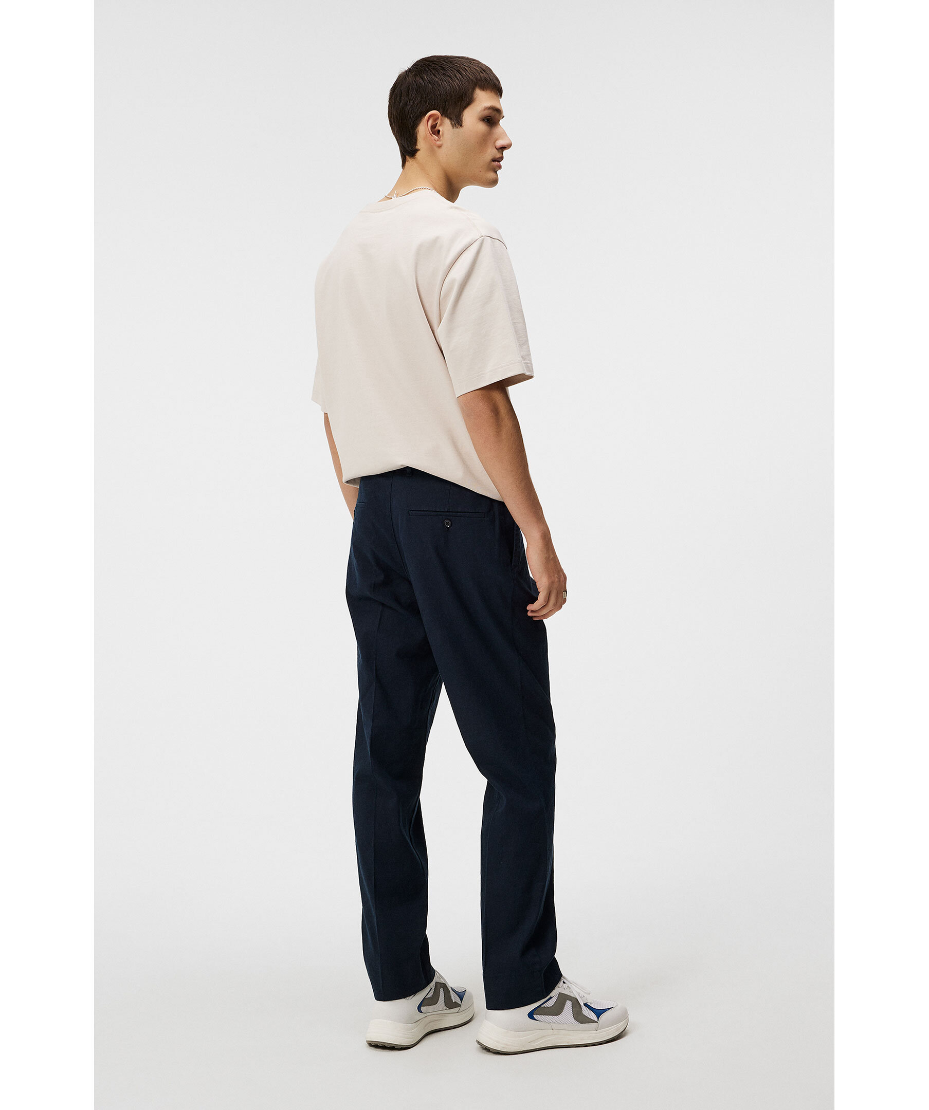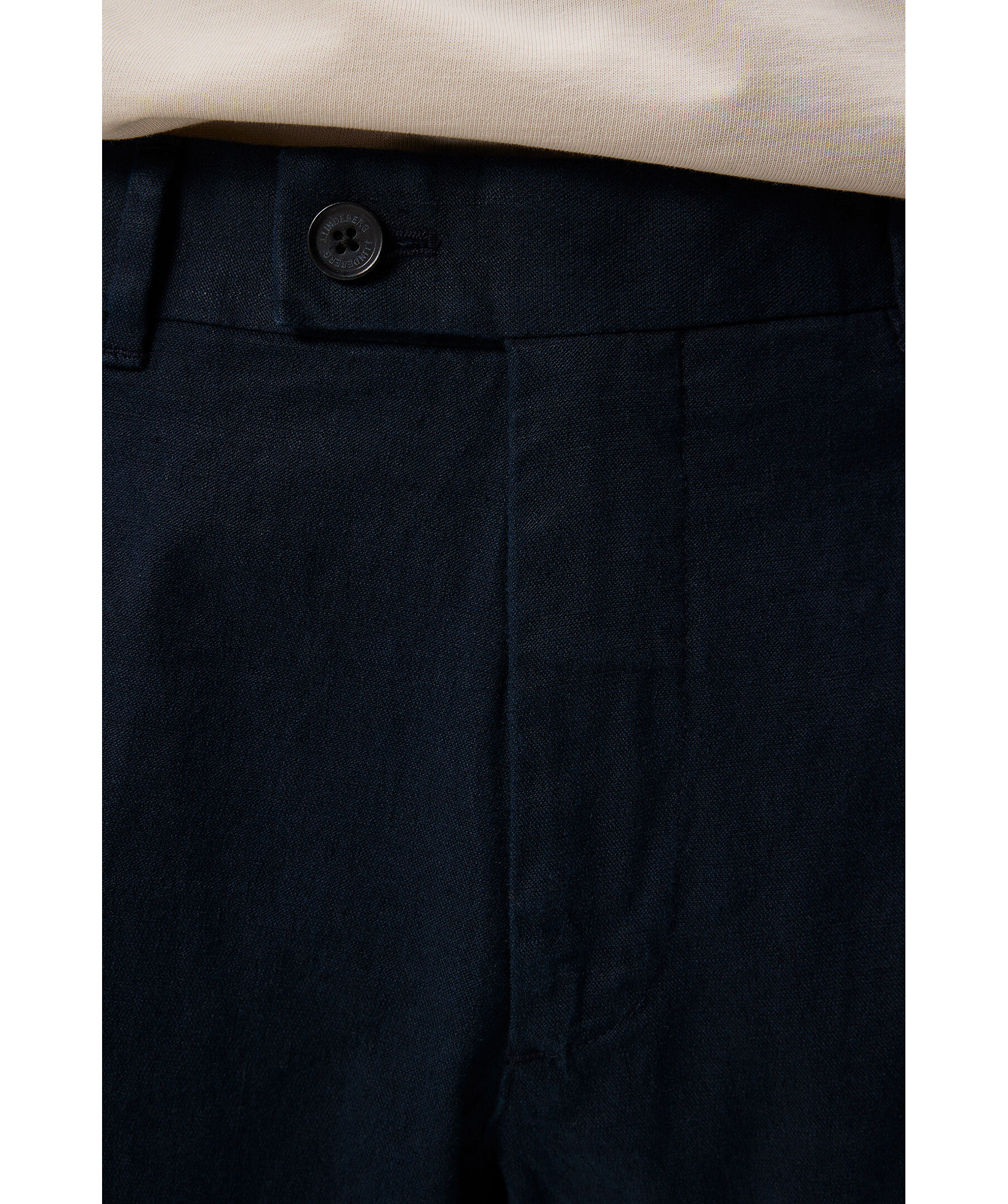 Marinblå linnebyxor från J Lindeberg. Pressveck på fram- och baksida, två sidfickor och två welt bakfickor med knapp samt bälteshällor i midjan. Gylfstängning med knapp och dragkedja. Tillverkade i en linnemix.