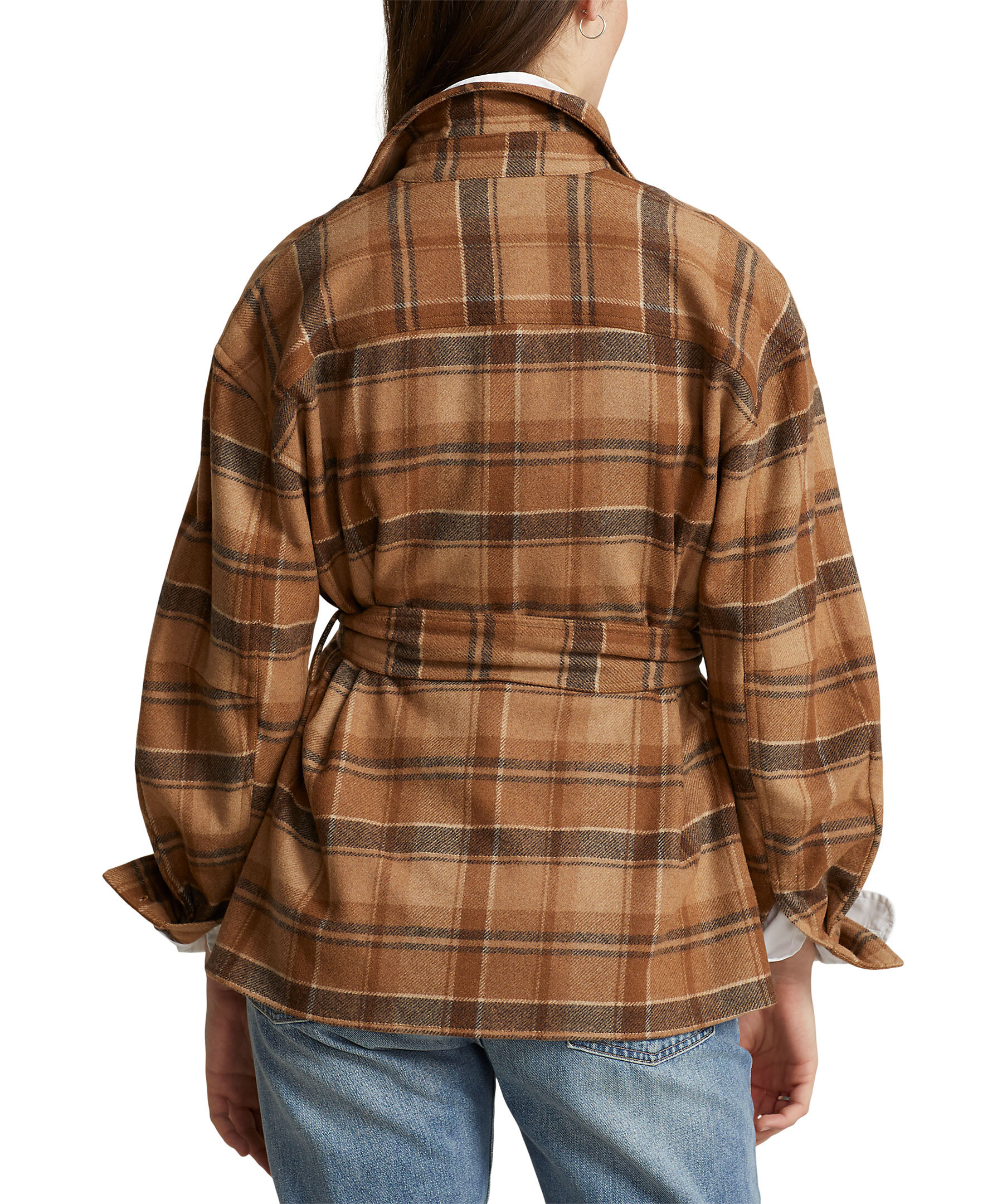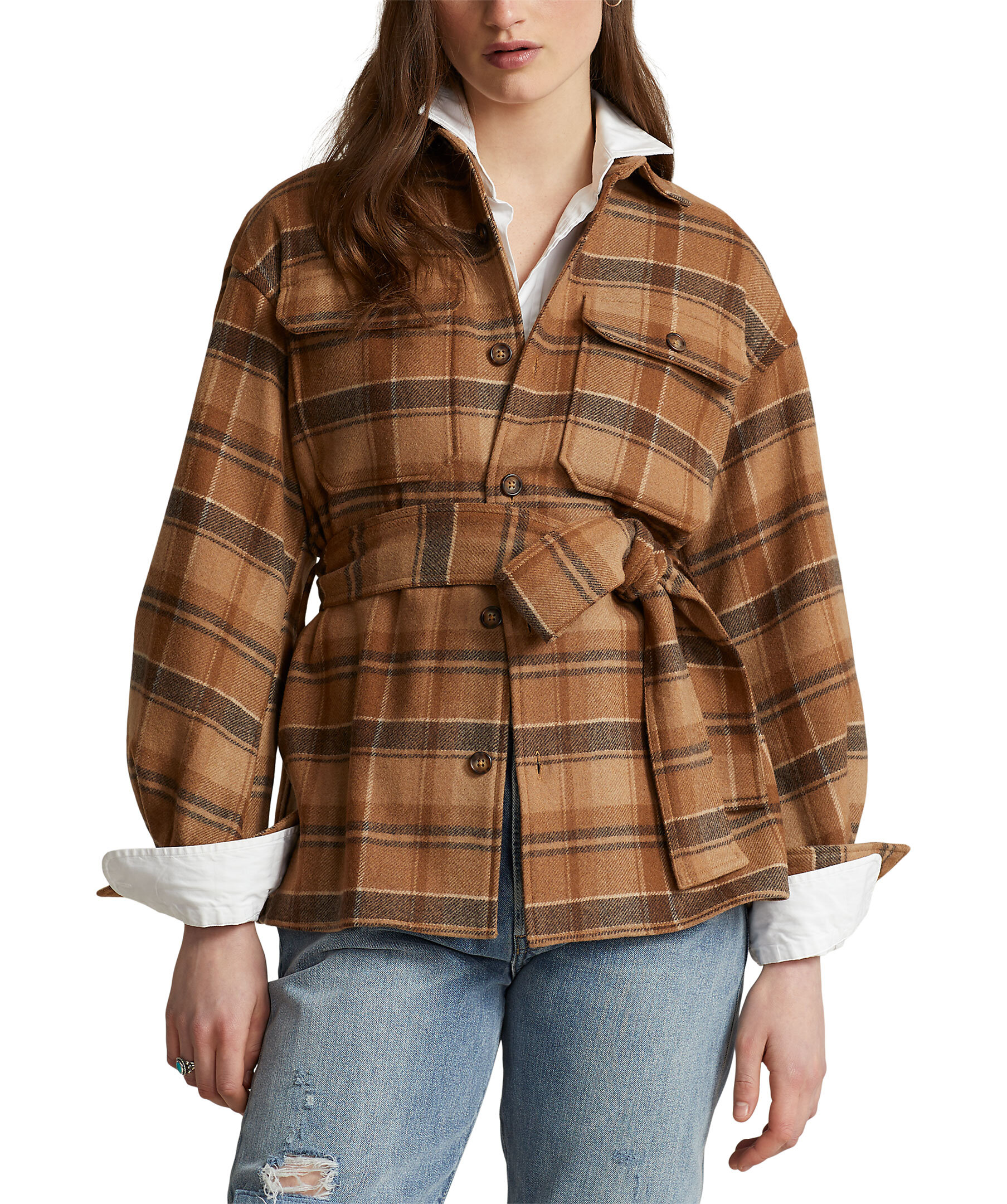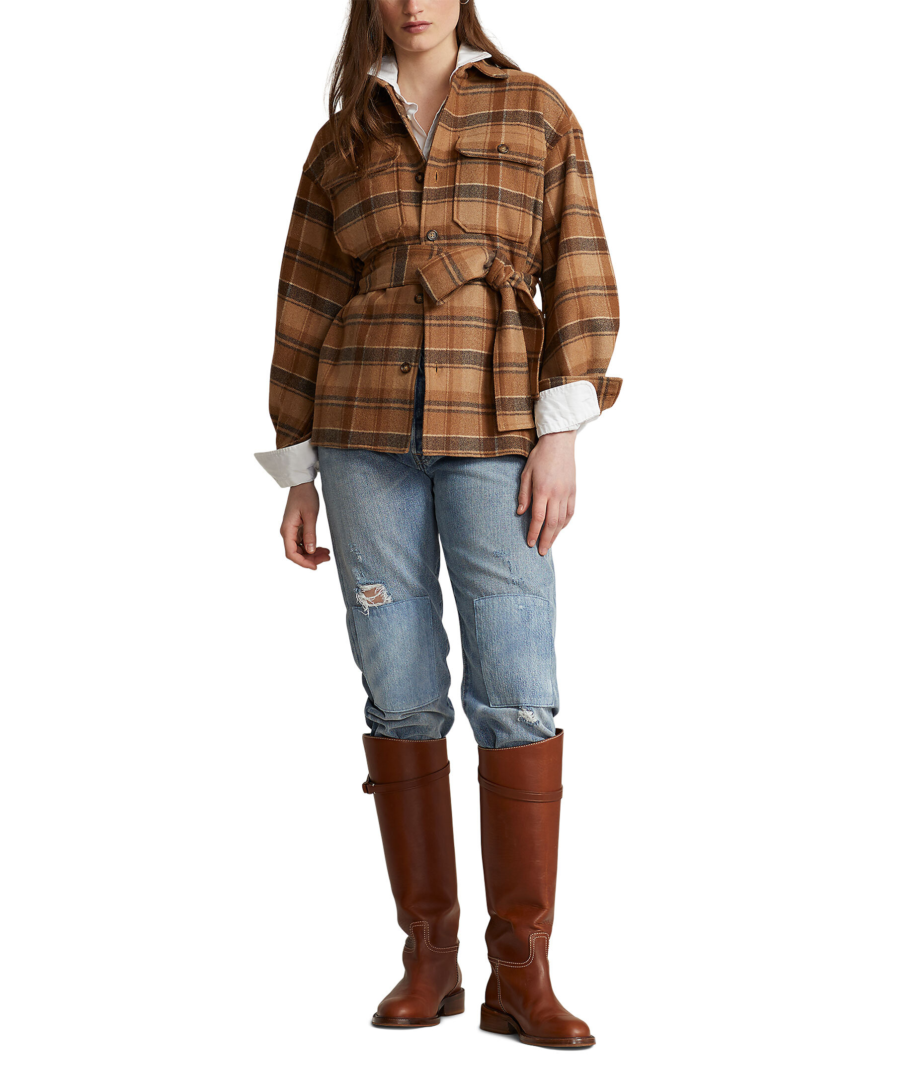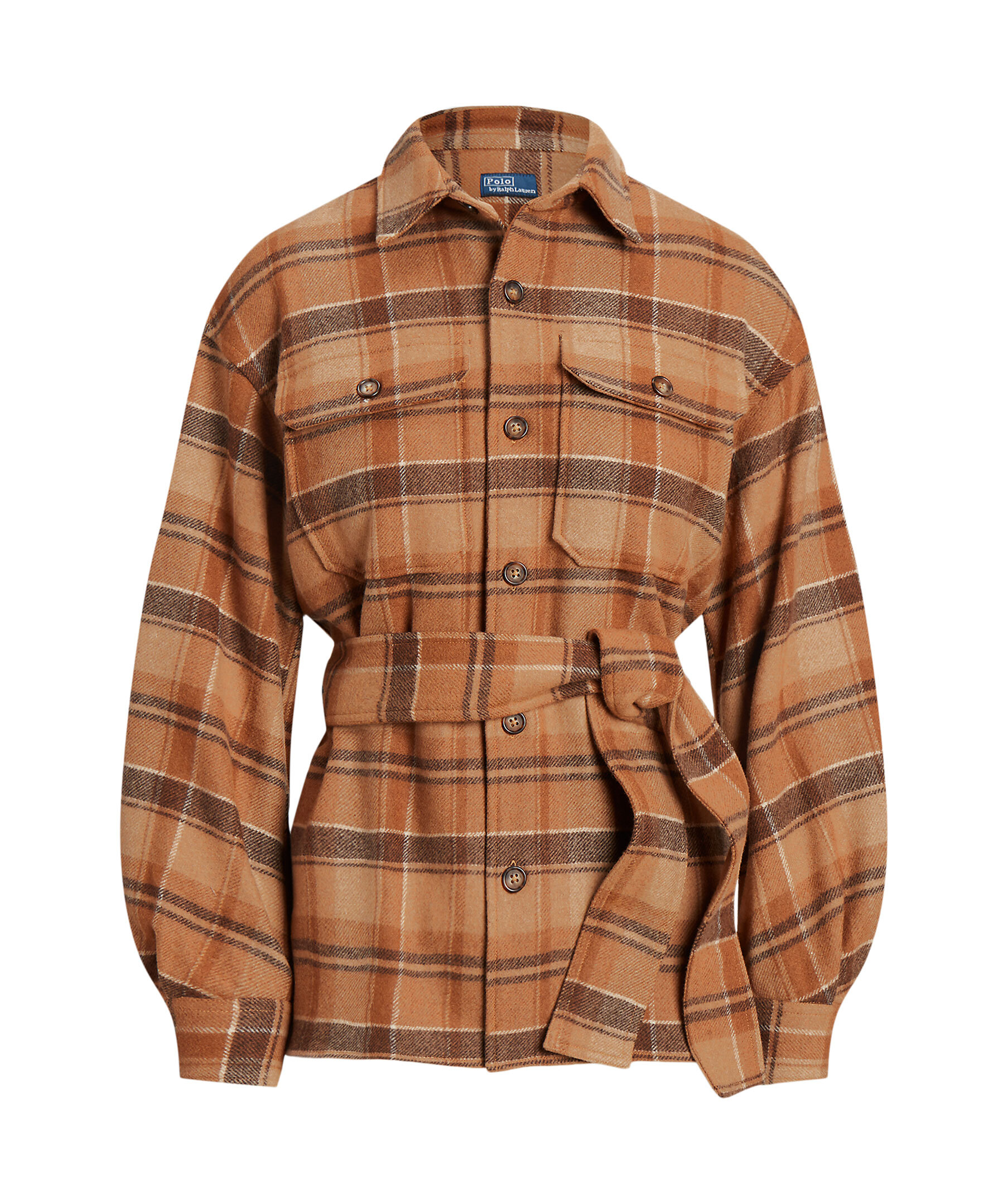 Brunrutig overshirt från Polo Ralph Lauren. Den här twillskjortan i ylleblandning, framställd i rika jordtoner med ett klassiskt rutigt motiv, är detaljerad med bröstfickor med knappar och en midja med bälte. Skjortan har en rak modell och är designad för att slå i höften. Punktkrage, knappslå, bakre ok och tappade axlar. Storlek medium har en kroppslängd på 69,2 cm och en ärmlängd på 85,1 cm. Kroppslängd och ärmlängd tas från mitten bak i nacken. Ärmlängden ändras 1,3 cm mellan storlekarna.