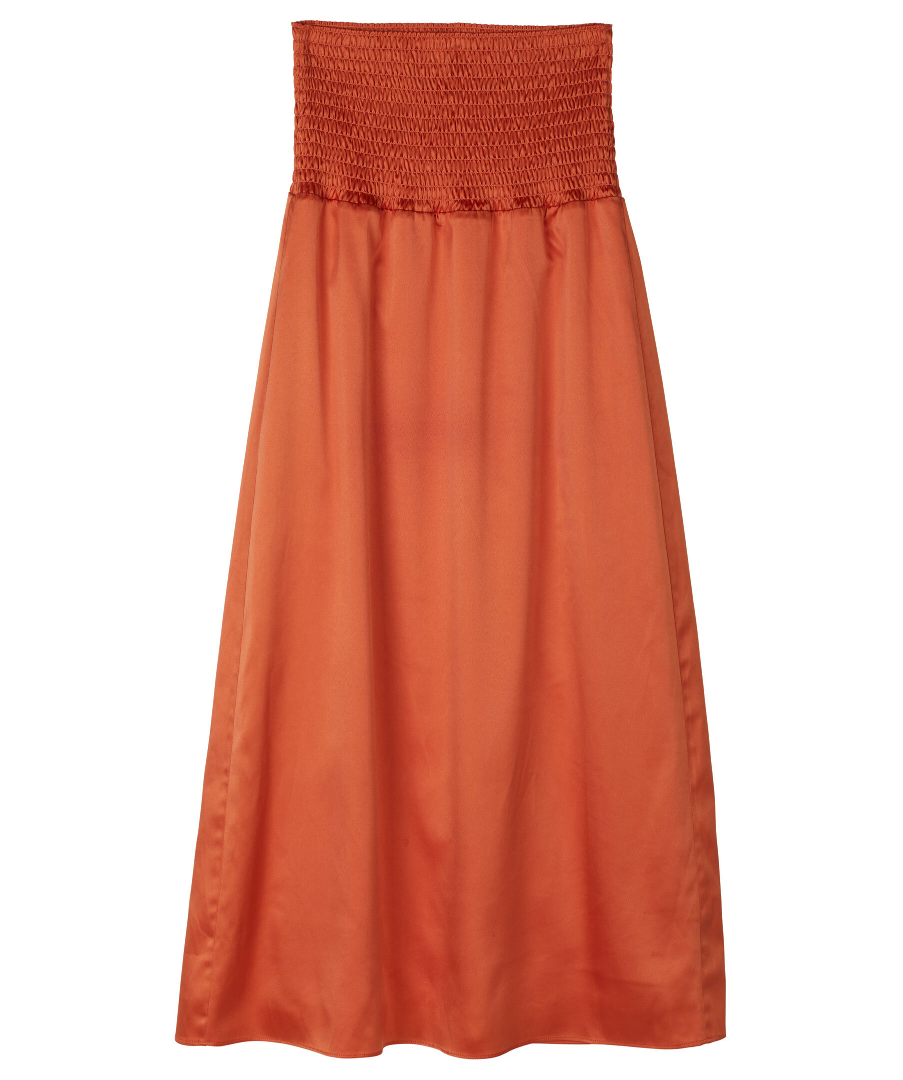 Orange kjol från Stylein. Smock detalj i midjan. Kjolen har en hög midja. Tillverkad i glansigt tyg. Kjolen slutar strax över ankeln.