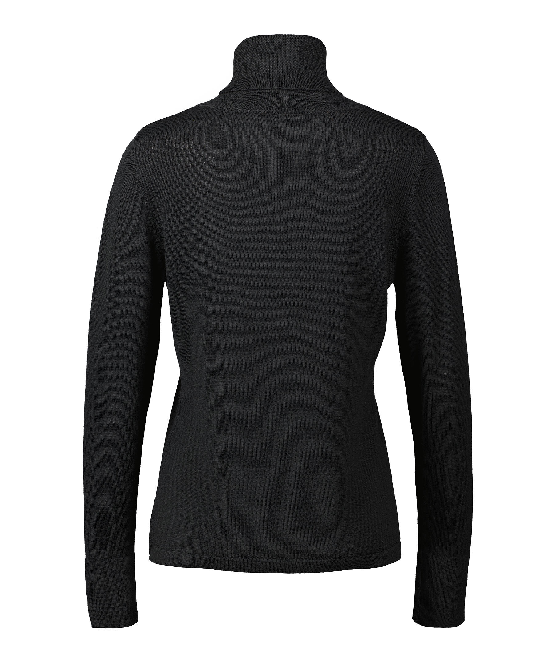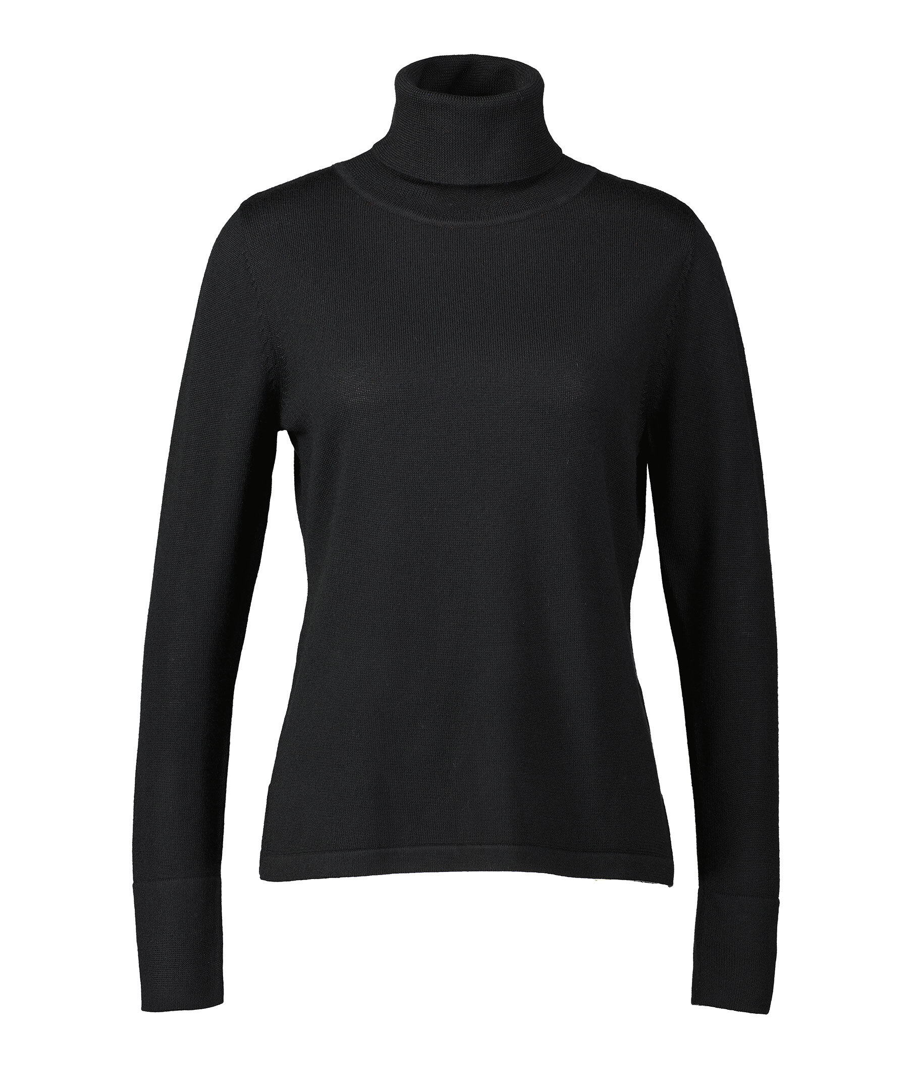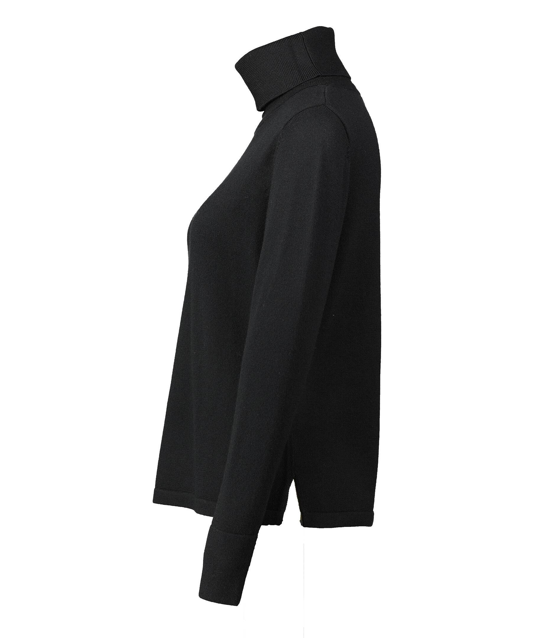 Svart stickad polotröja från My Aurora. Tillverkad i 100% merinoull. Korta slitsar i sidorna, ribbstickad polokrage samt muddar vid ärm- och plaggslut.