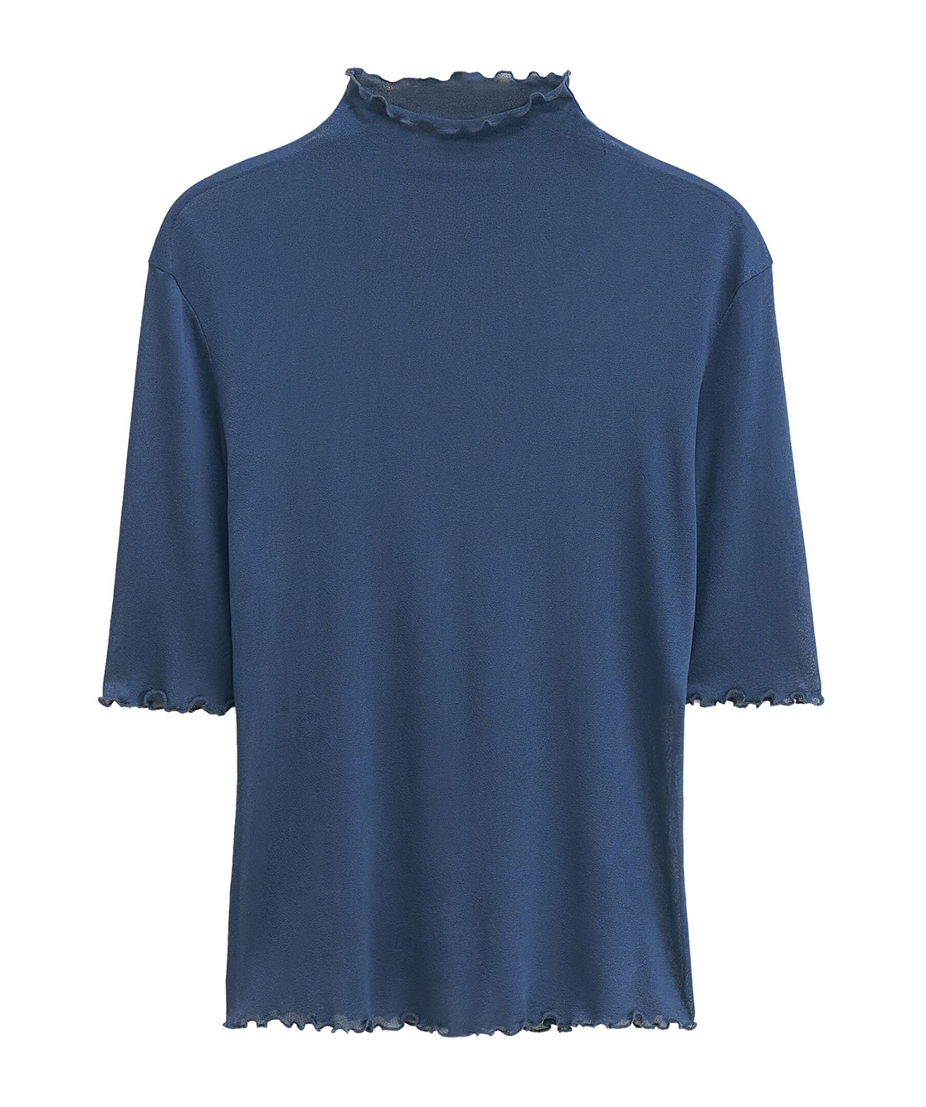 Tunn, halvtransparent kortärmad tröja i blått från Filippa K. Lätt stickad av ett lätt och delikat glänsande Naia™-acetatcrepe material. Slim fit och slutar vid höften. Volanger vid halsringningen, ärmarnas avslut och nederkanten.