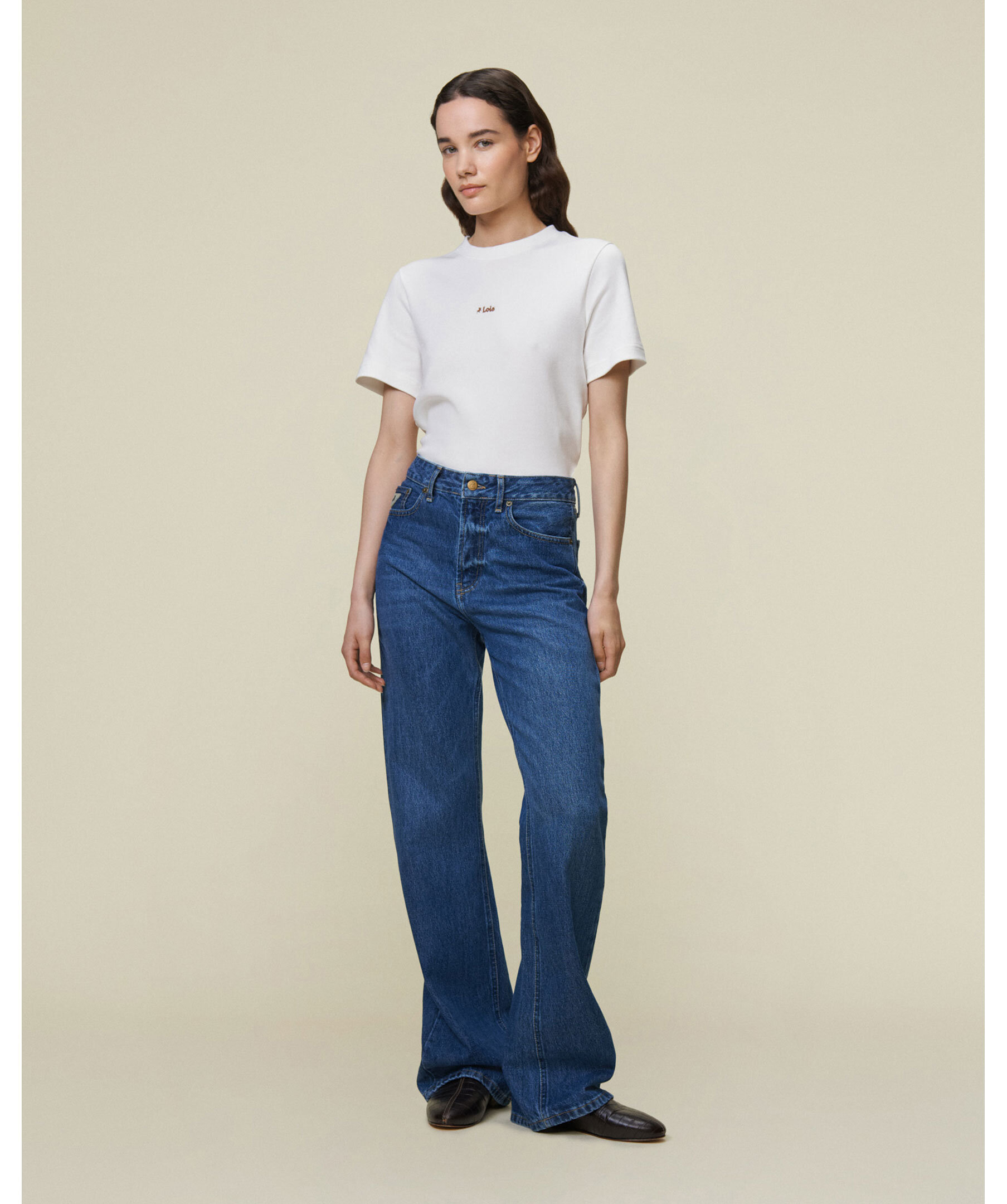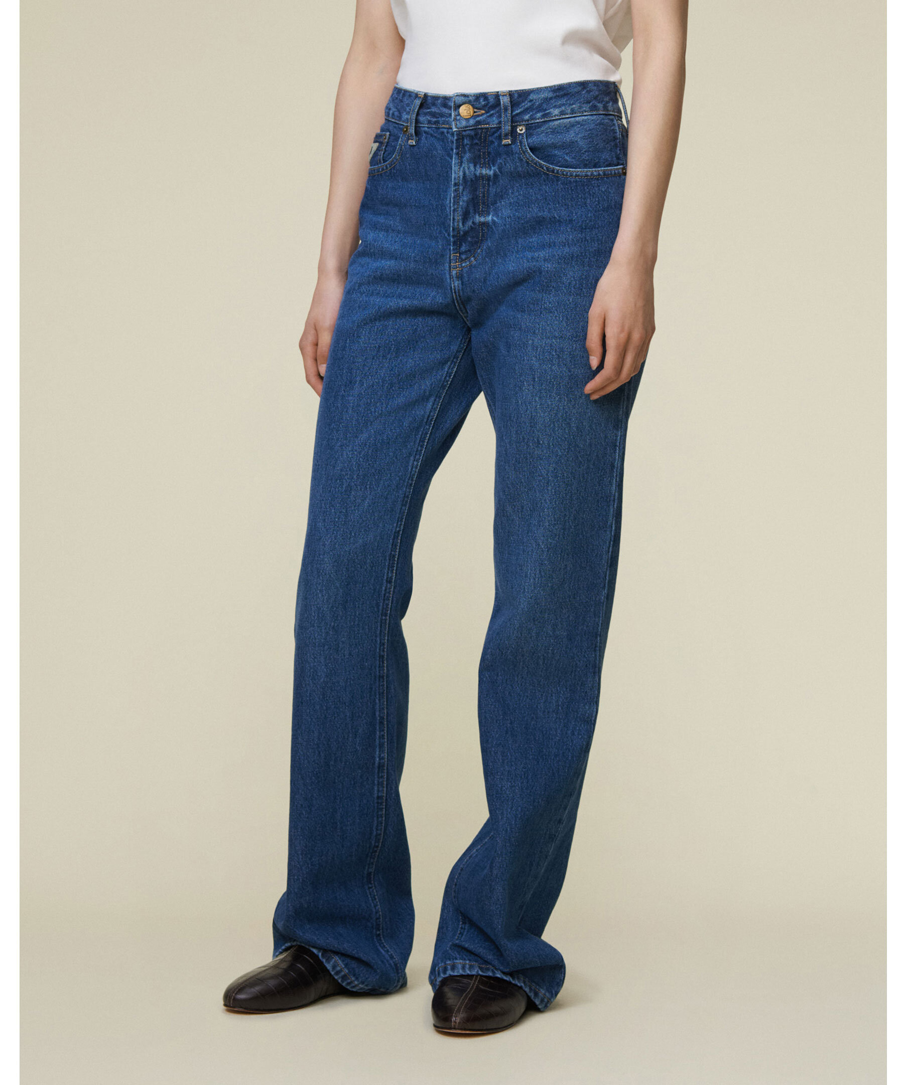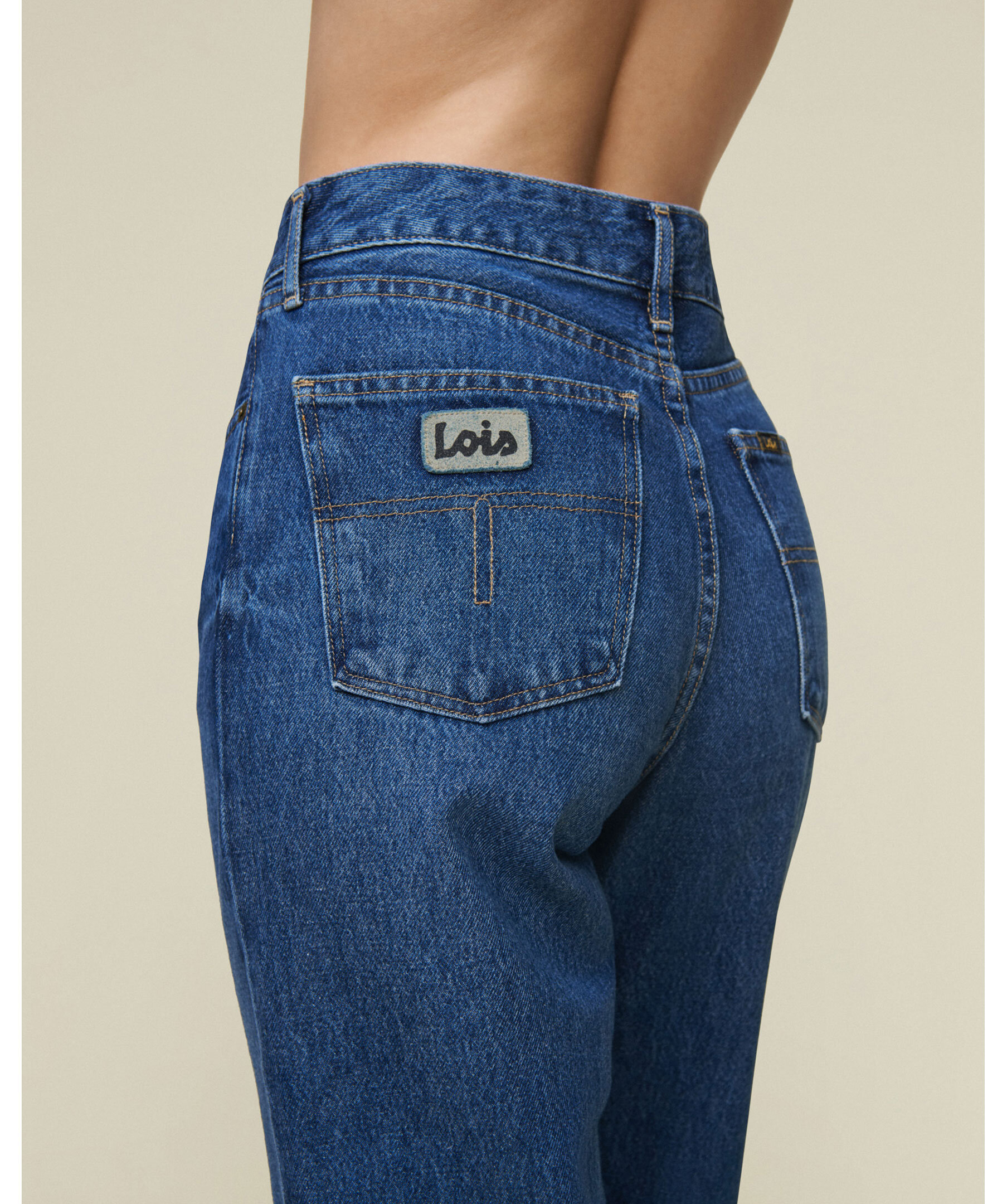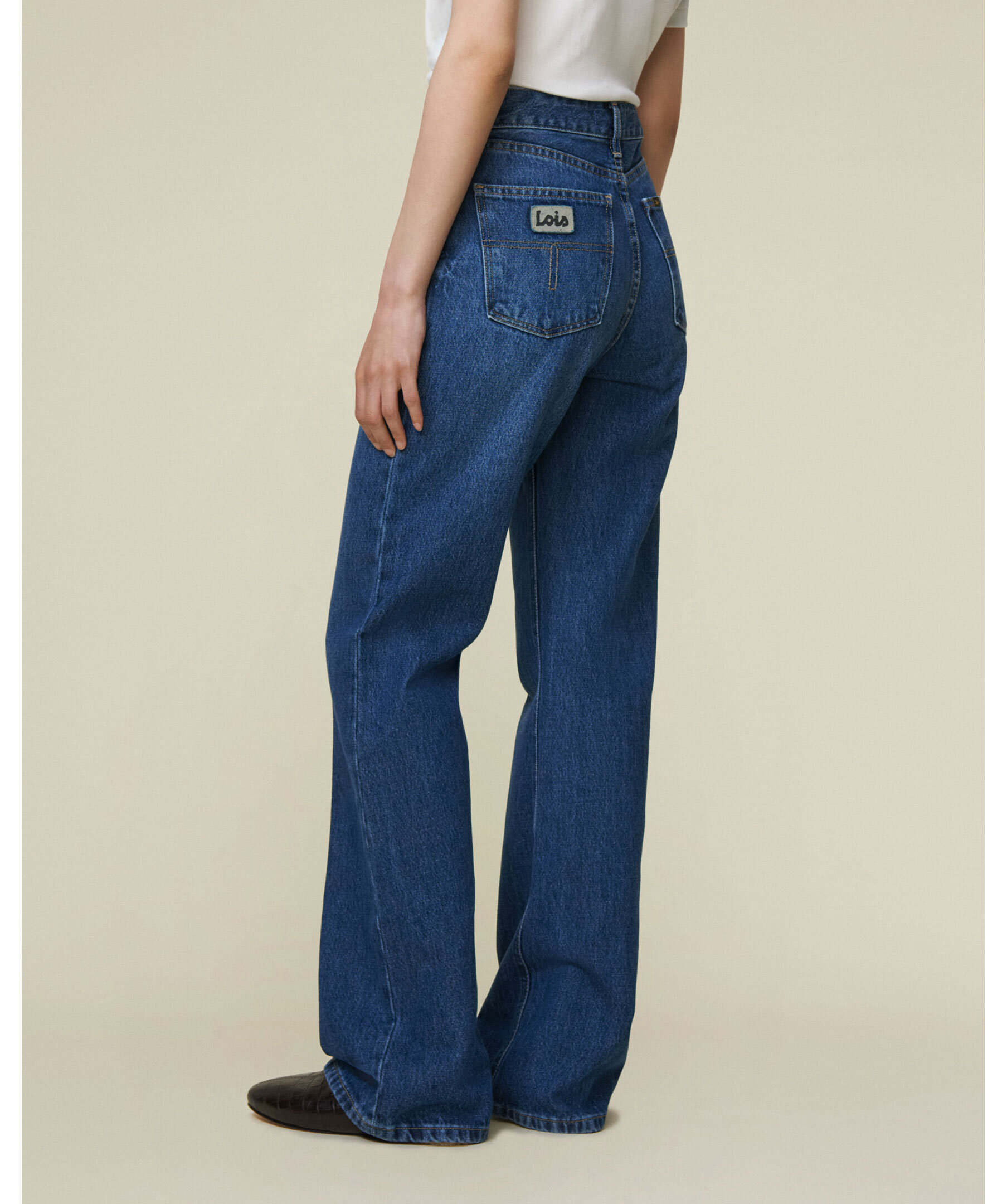 Blåa, högmidjade jeans från Lois. Jeansen har en avslappnad passform och utsvängda byxben. Gjorda i 100% bomull. För en mer avslappnad look; välj en storlek större för en längre midja och vida byxben. Modellen är 174 cm lång och har på sig strl 27/34.