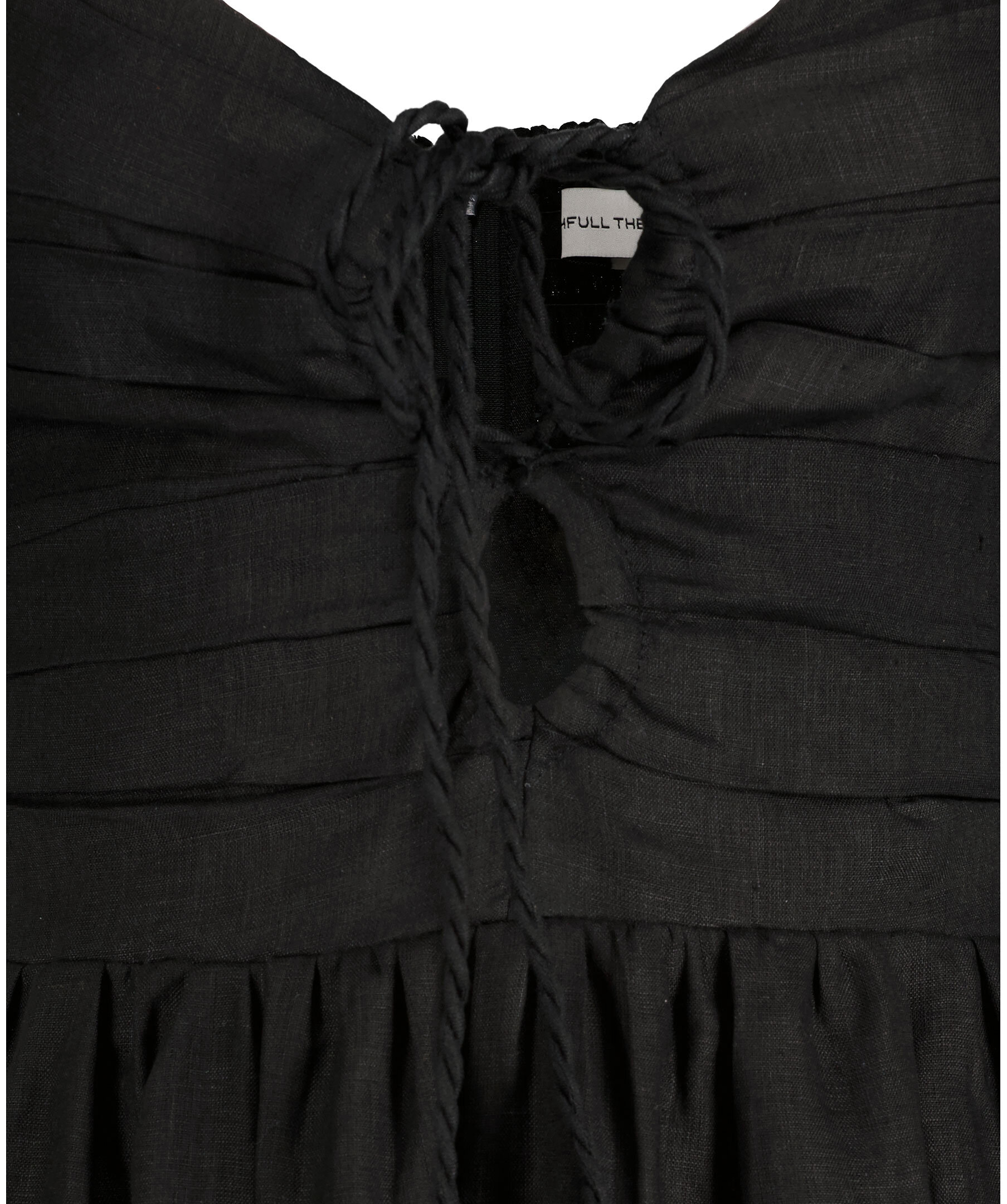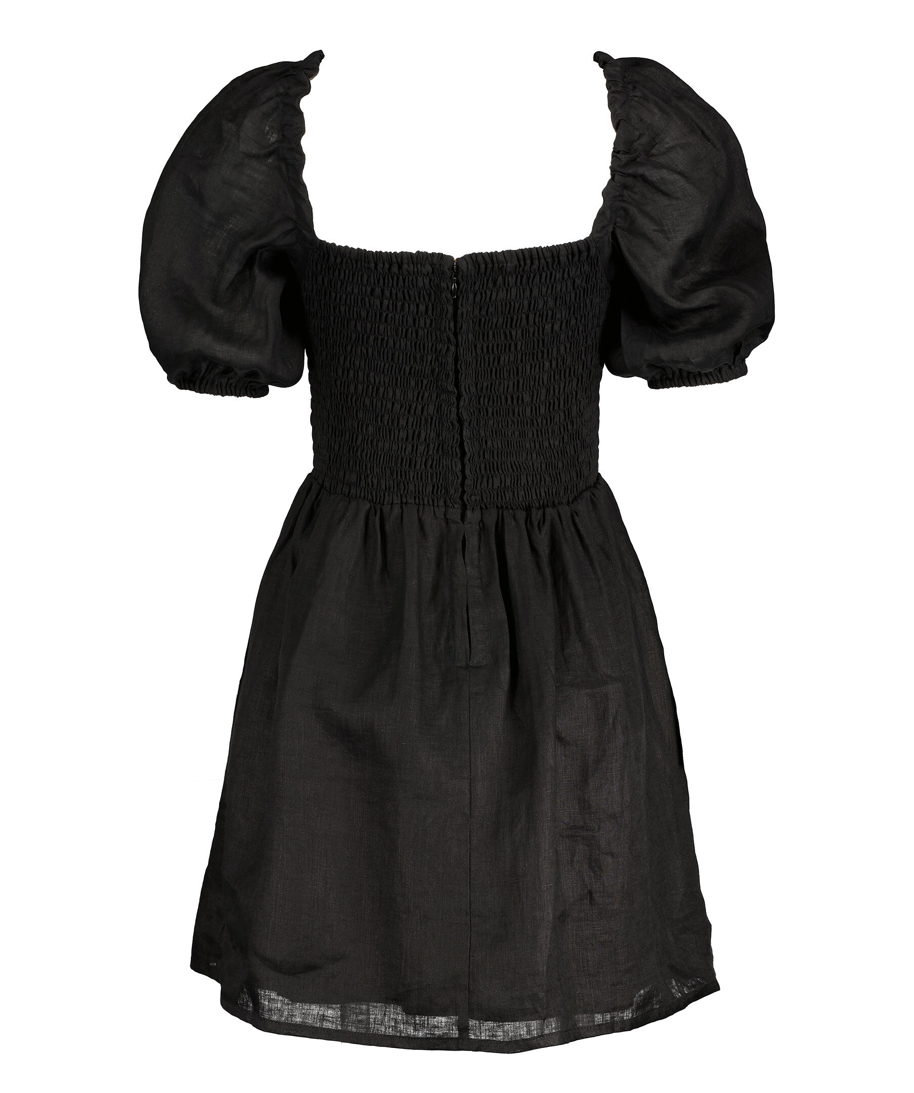 Svart känning i linne från Faithfull the brand. Korta ballongärmar med elastiskt band, draperad vid bröstet samt snörning med pärlor som kan fästas runt nacken. Fastsydd underkjol. Stängs med dragkedja baktill. Tillverkad i 100% Linne