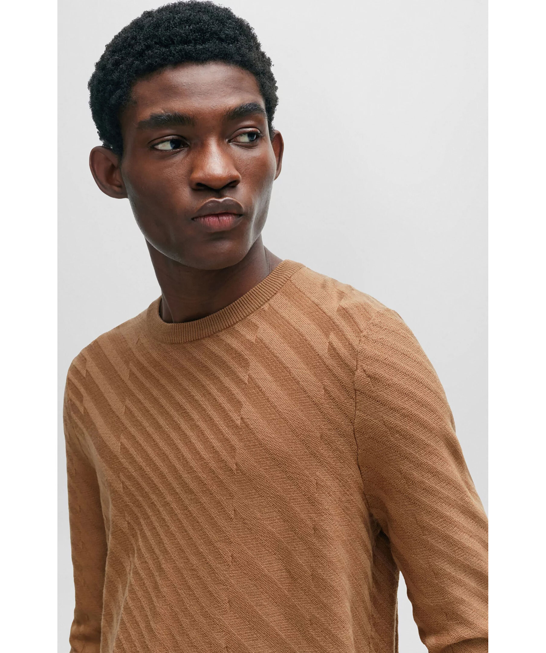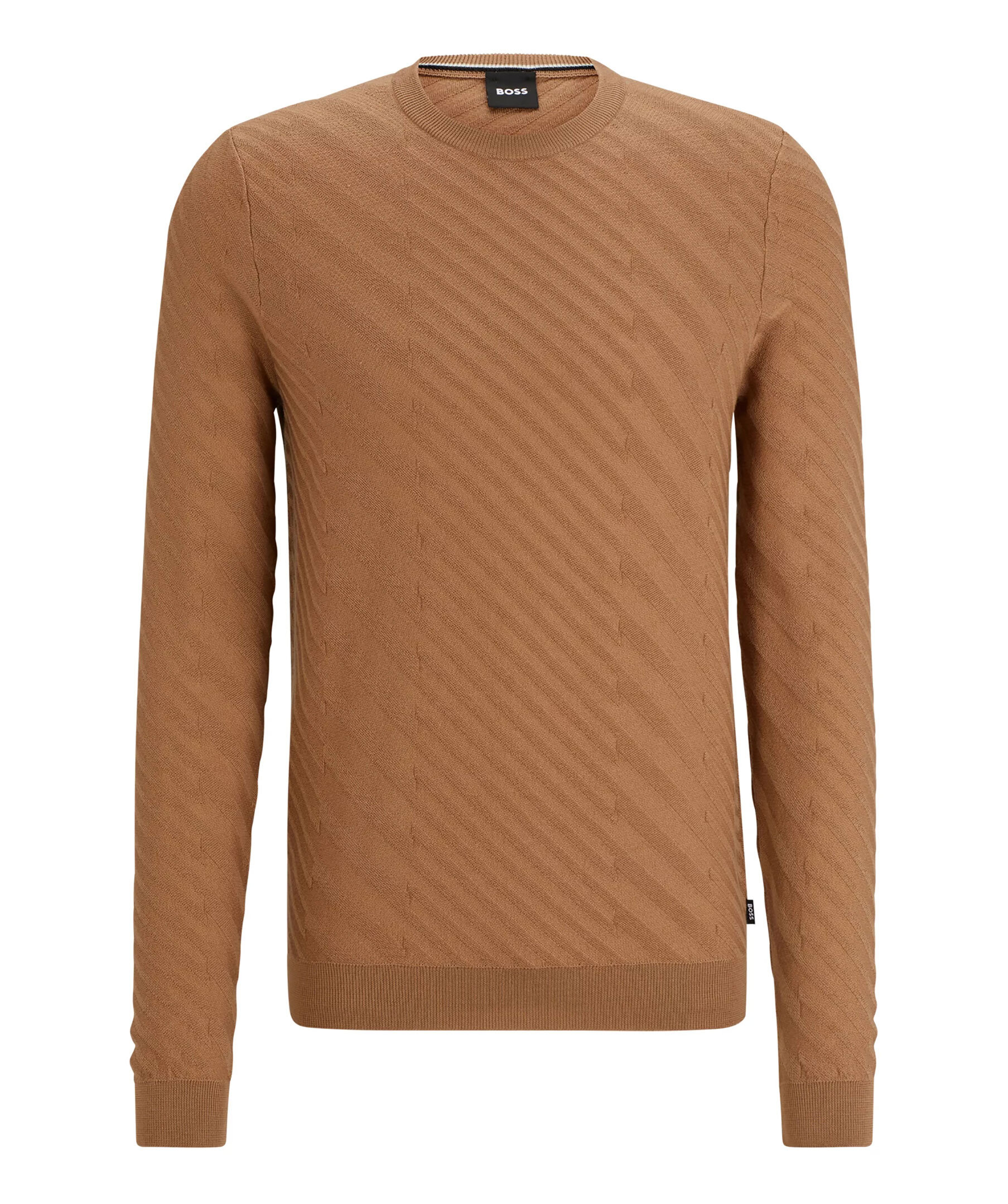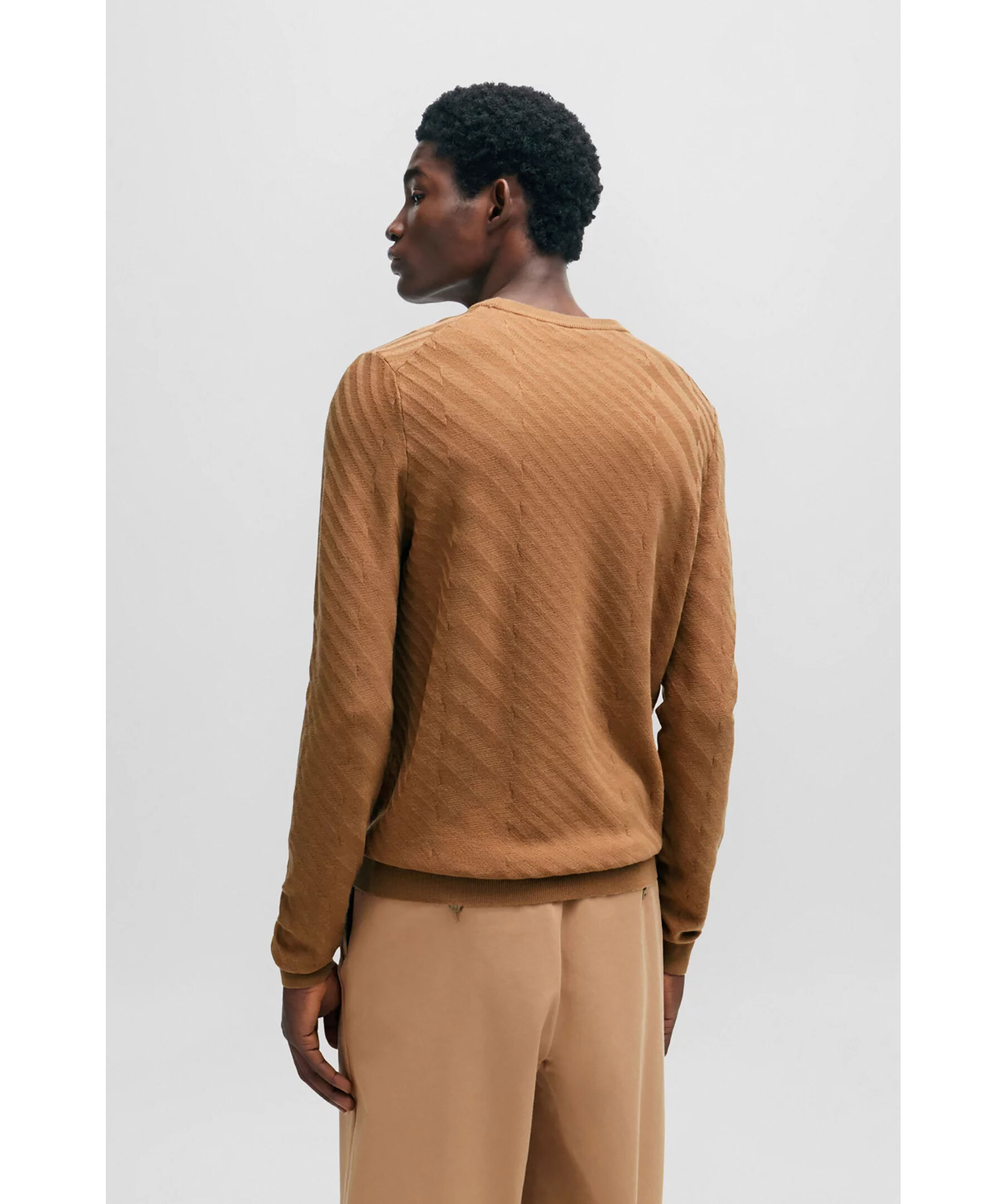 Khakifärgad stickad tröja från BOSS. Tröjan har rund och ribbstickad halsringning, ribbstickade muddar vid ärm- och plaggslut samt ett jacquard-strukturerat tryck all-over. Tillverkad i en jungfruullmix.