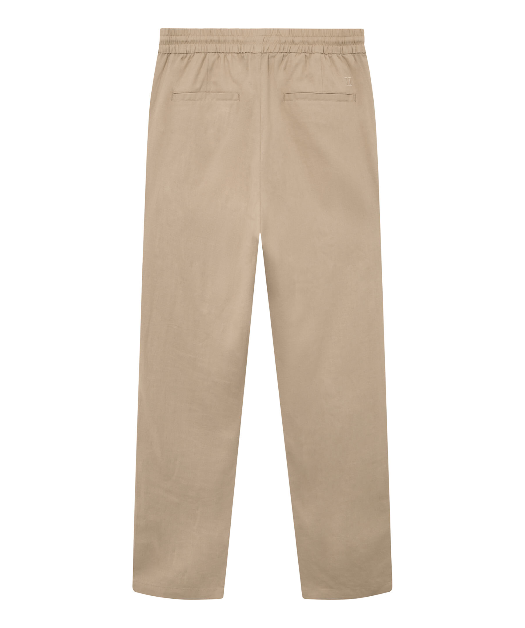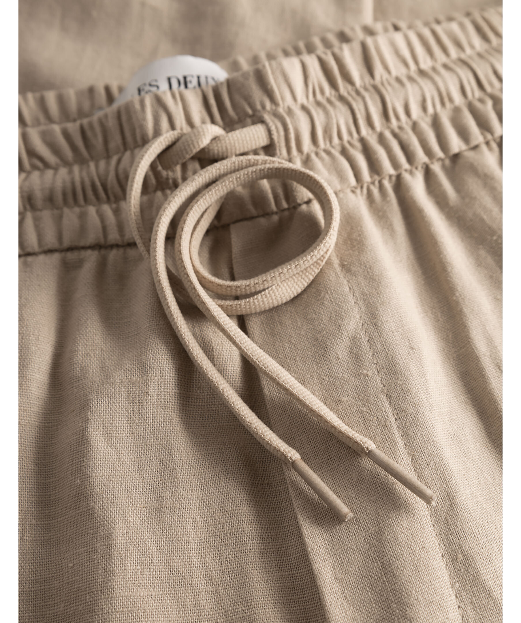 Sandfärgade linnebyxor från Les Deux. En hybrid mellan kostym och träningsbyxa: tyg i kostymstil, stretchig midja med dragsko. Två sidfickor samt två bakfickor, liten broderad logotyp ovanför ena bakfickan. Relaxed passform med vida ben.