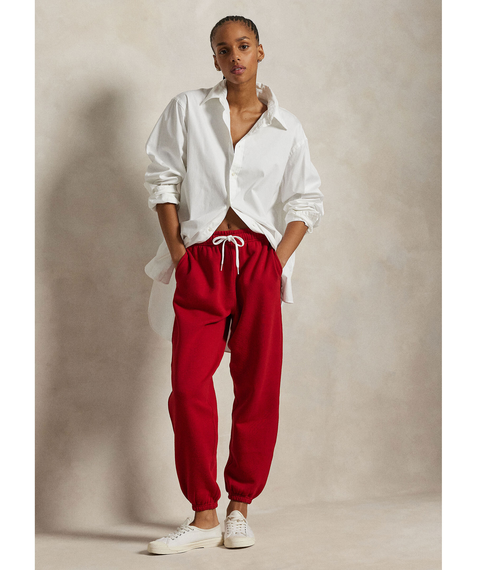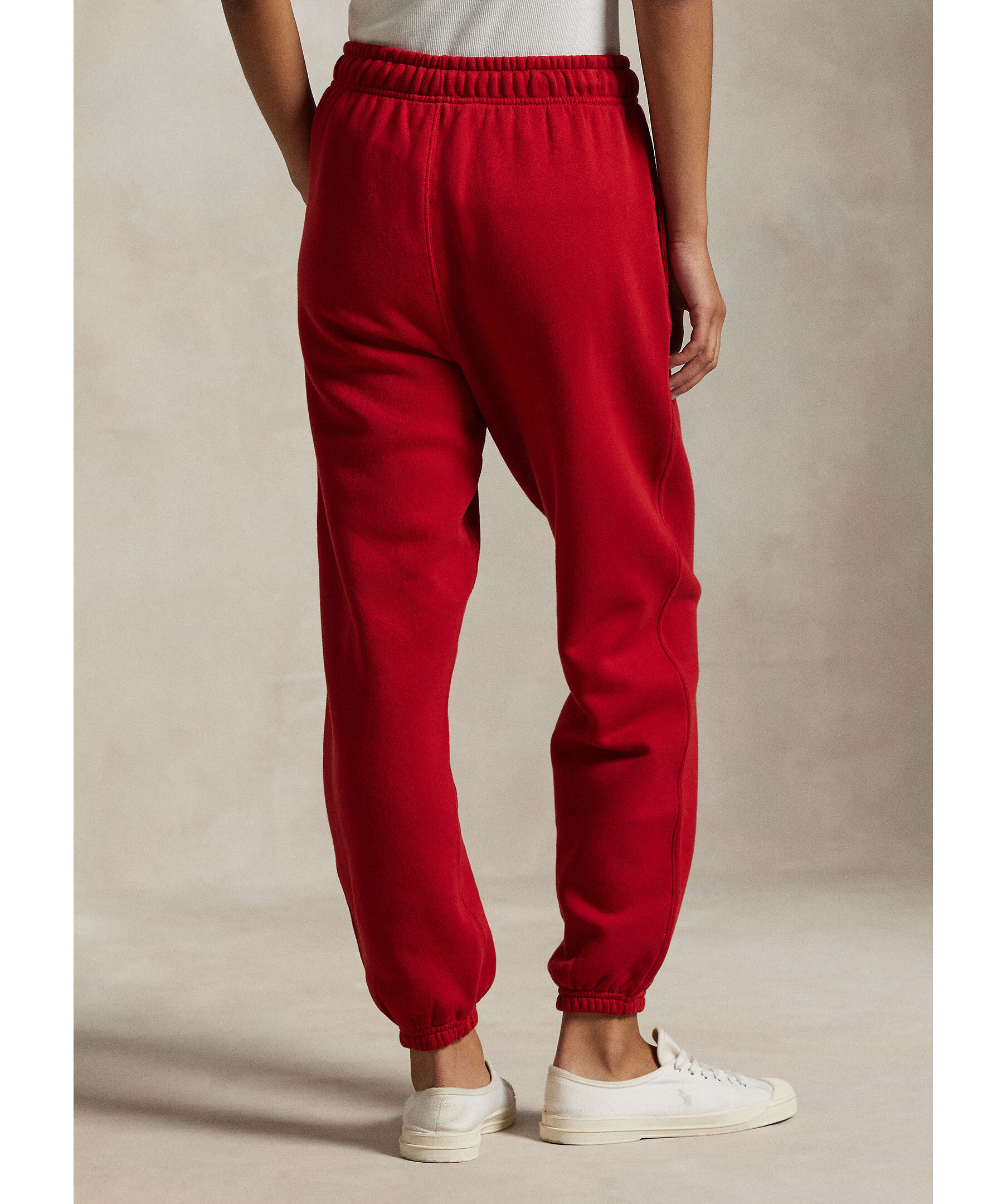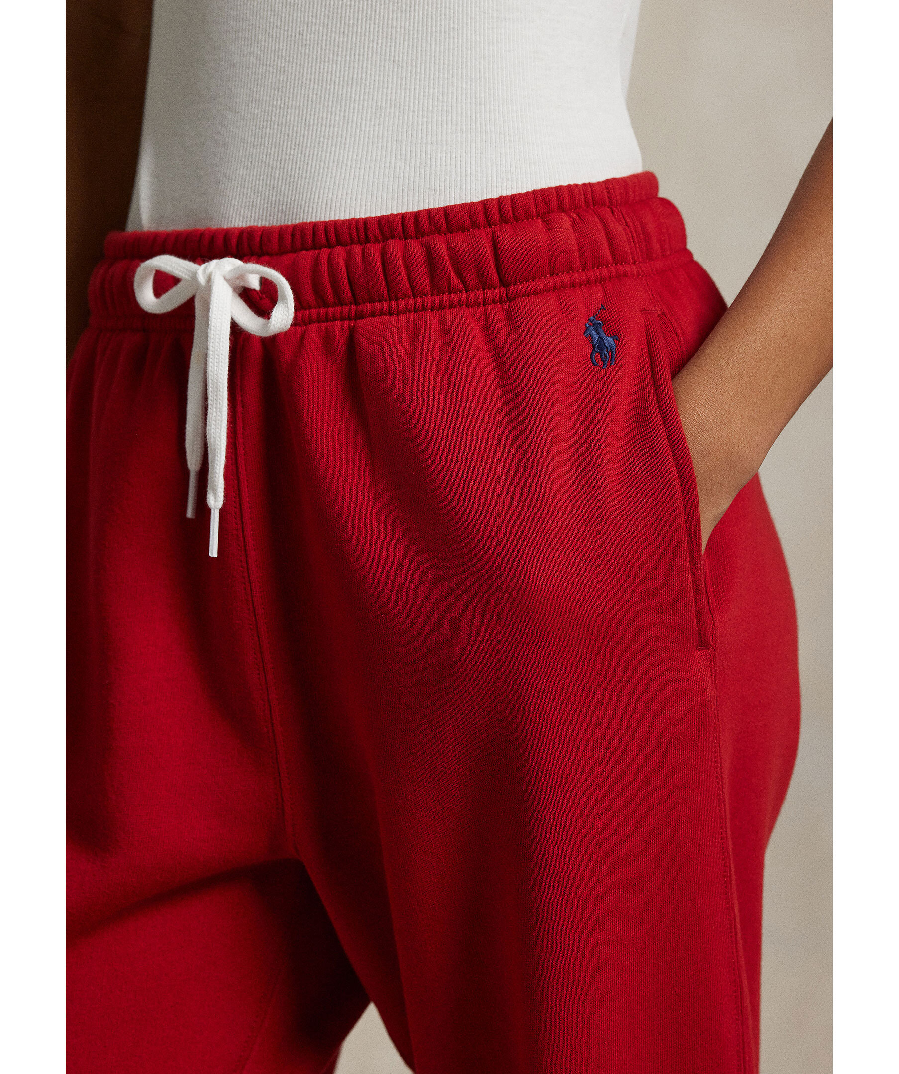 Röda mjukisbyxor från Polo Ralph Lauren. Byxorna har en elastisk midja med dragsko för justerbar passform och ribbade muddar vid anklarna. Fickor på sidorna och en broderad logotyp pryder ena benet.