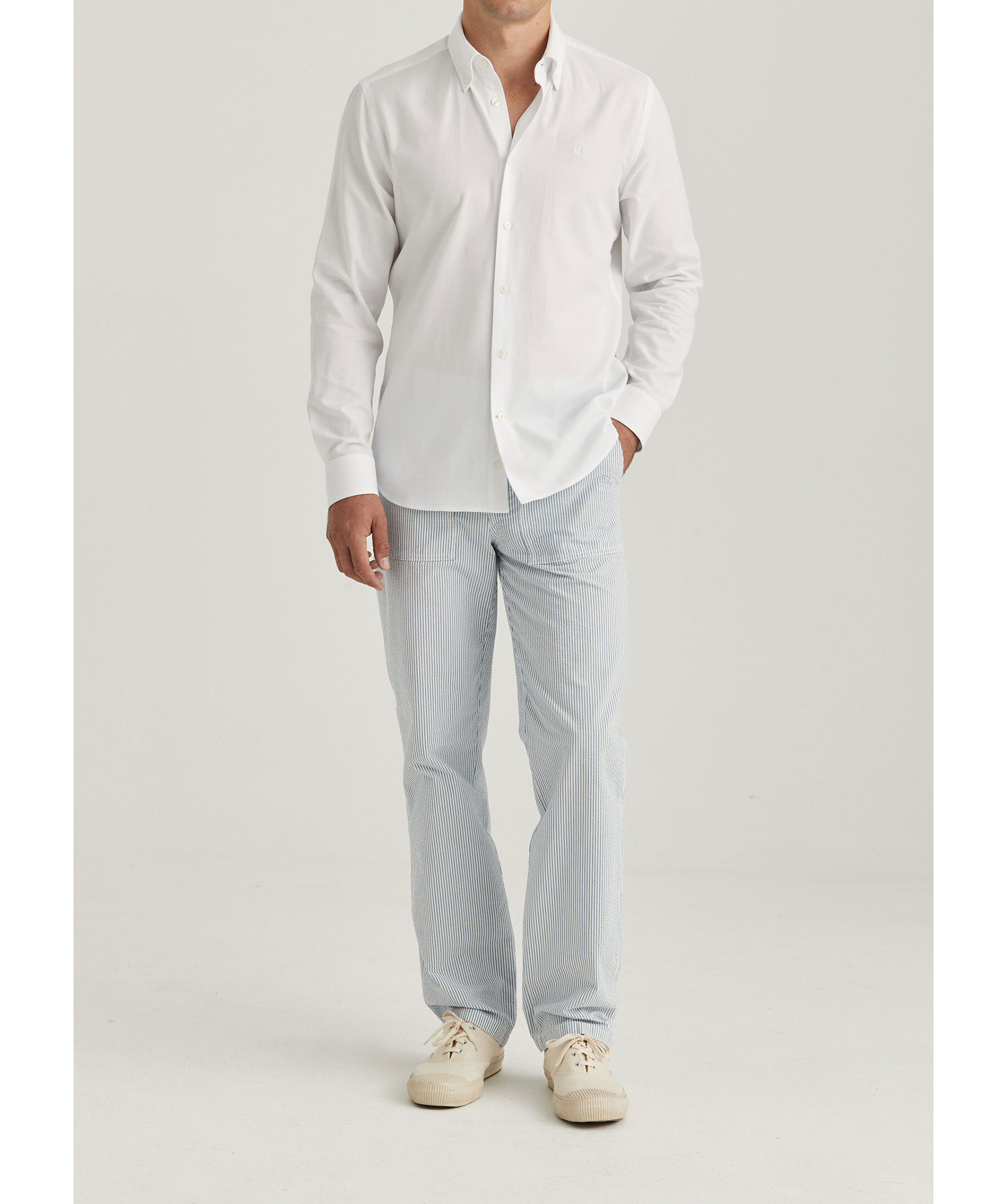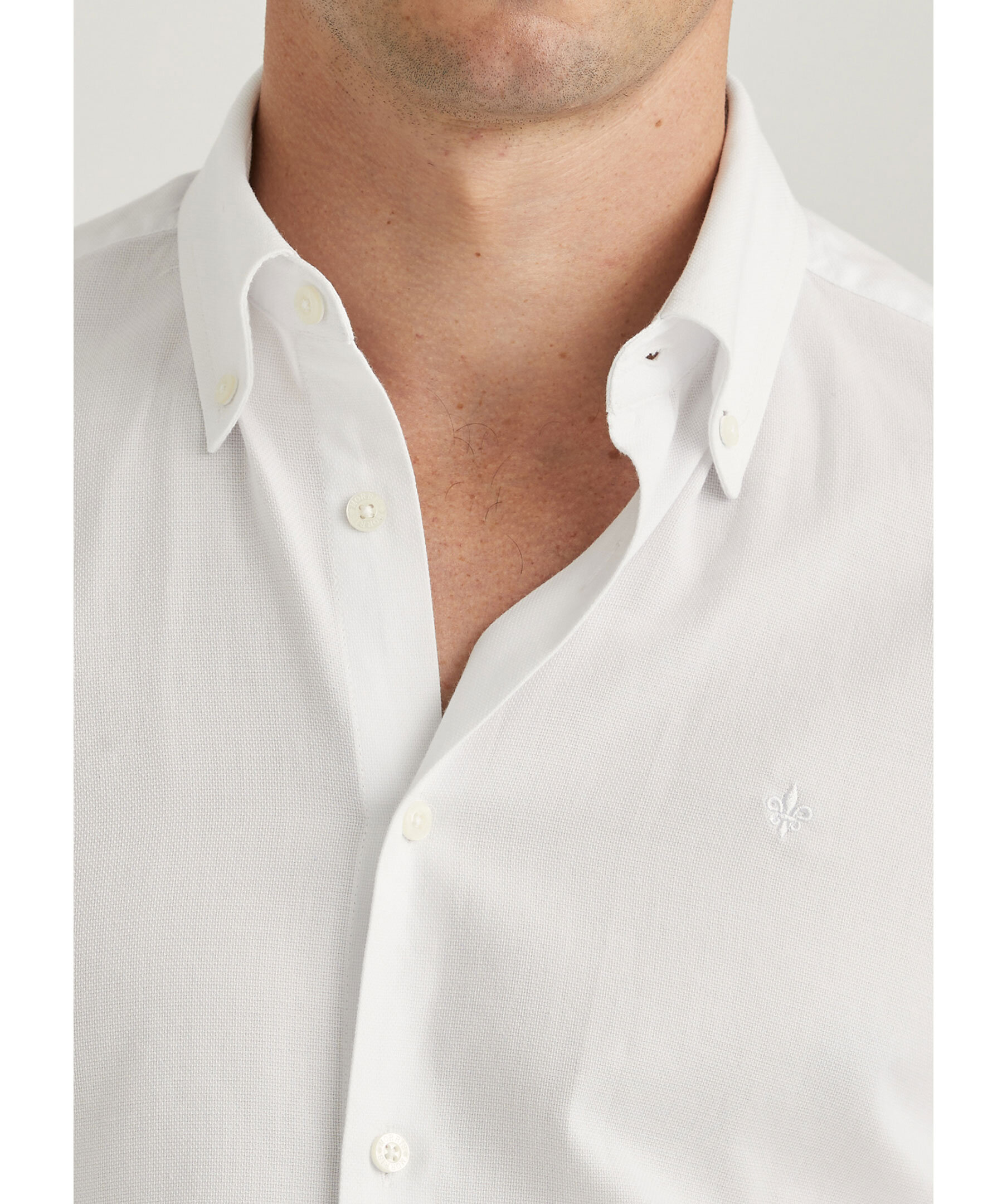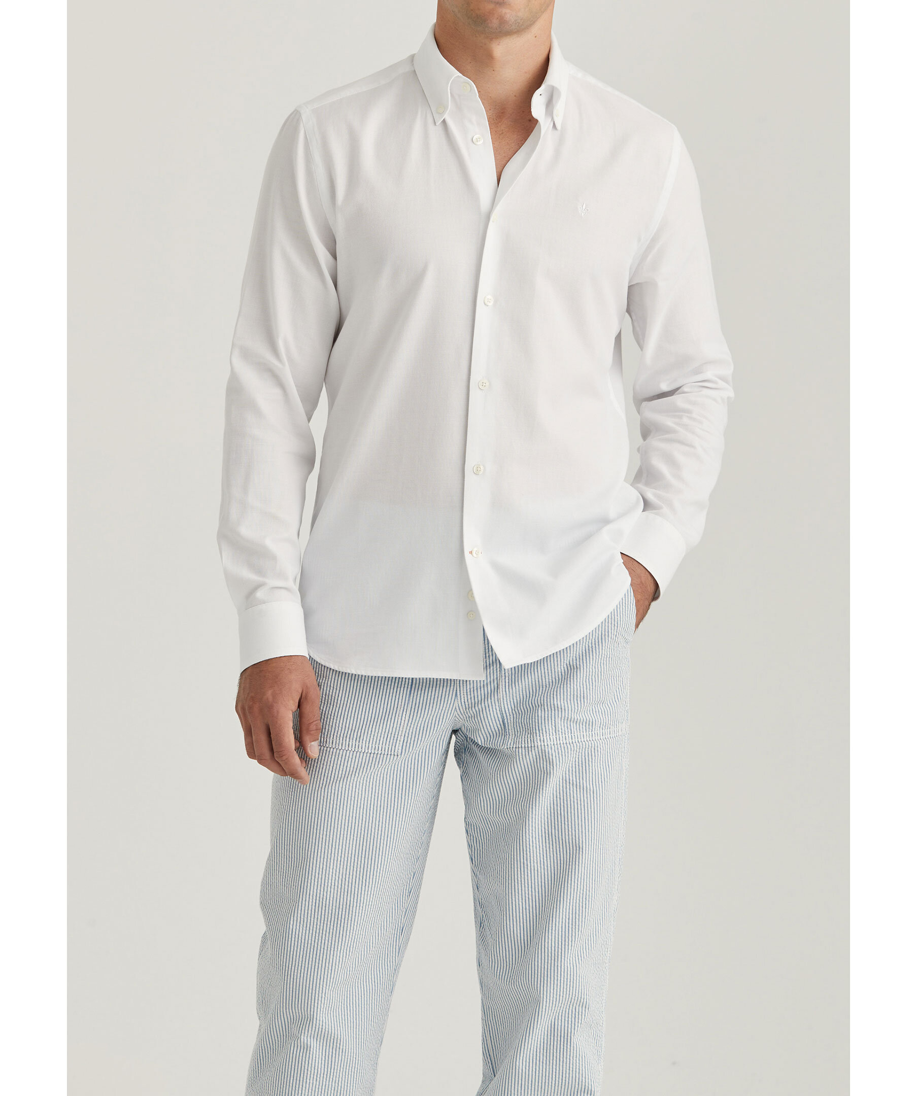 Vit skjorta från Morris. Button down krage, enkel manschett lätt rundad med två knappar samt Morris signaturlilja broderad på vänster bröst. Tyget har ett diskret jacquardmönster. Smal passform. Tillverkad i 100% bomull.