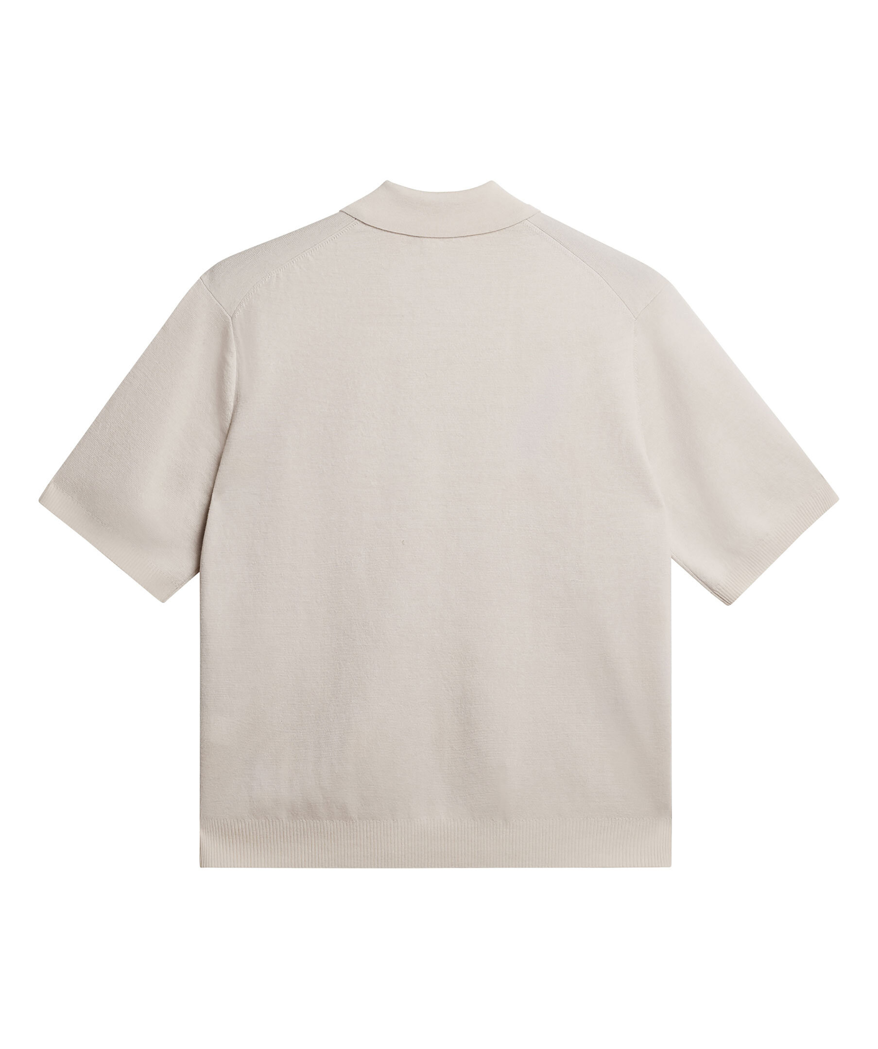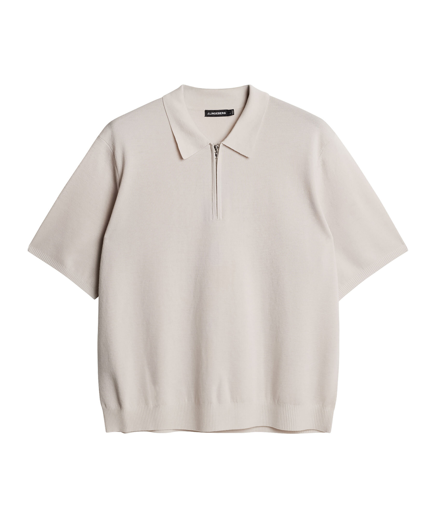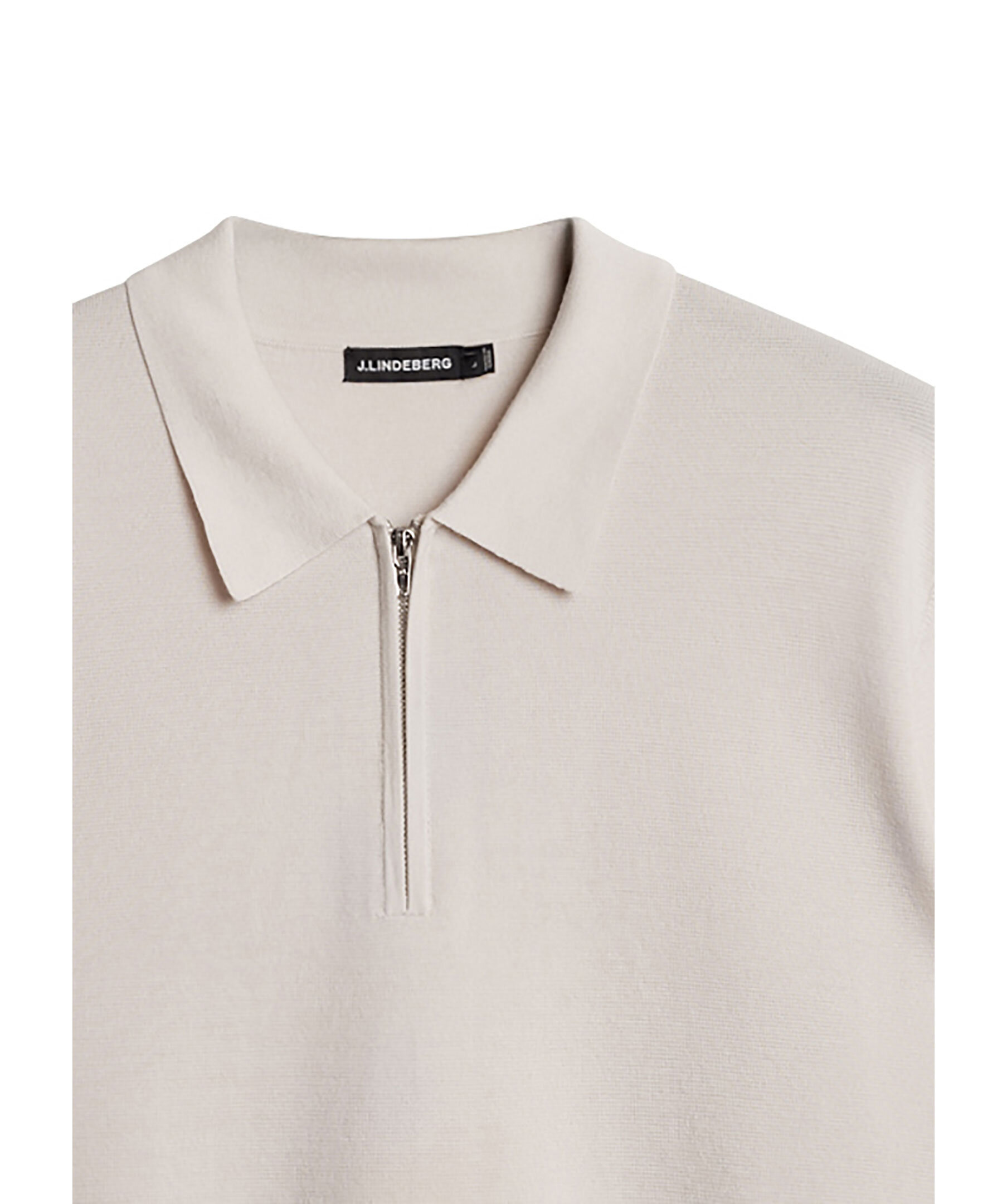 Ljusbeige half-zip med krage från J.Lindeberg. Tröjan har korta ärmar och ribbstickade ärm- och tröjavslut. Tillverkad av 100% merinoull.