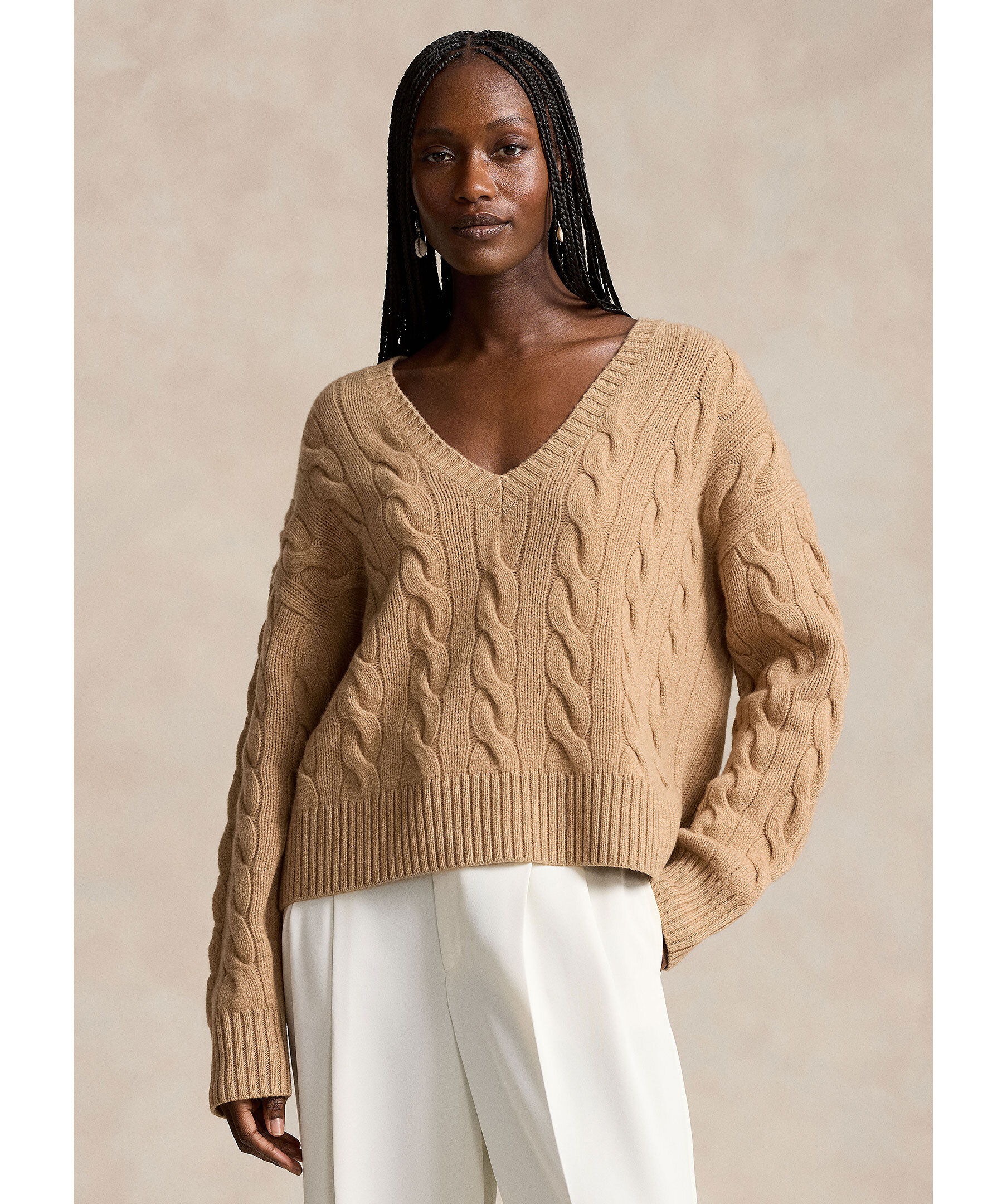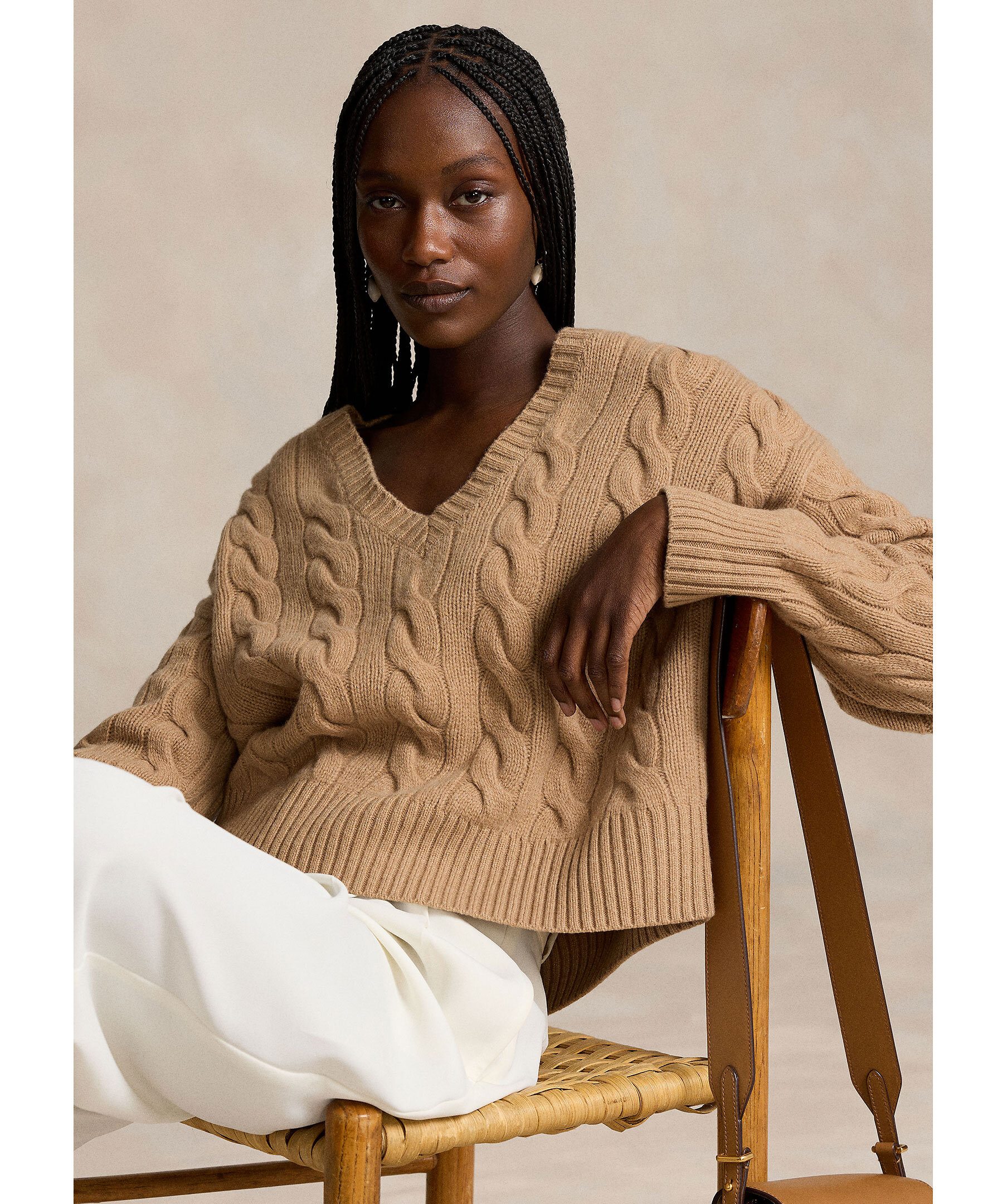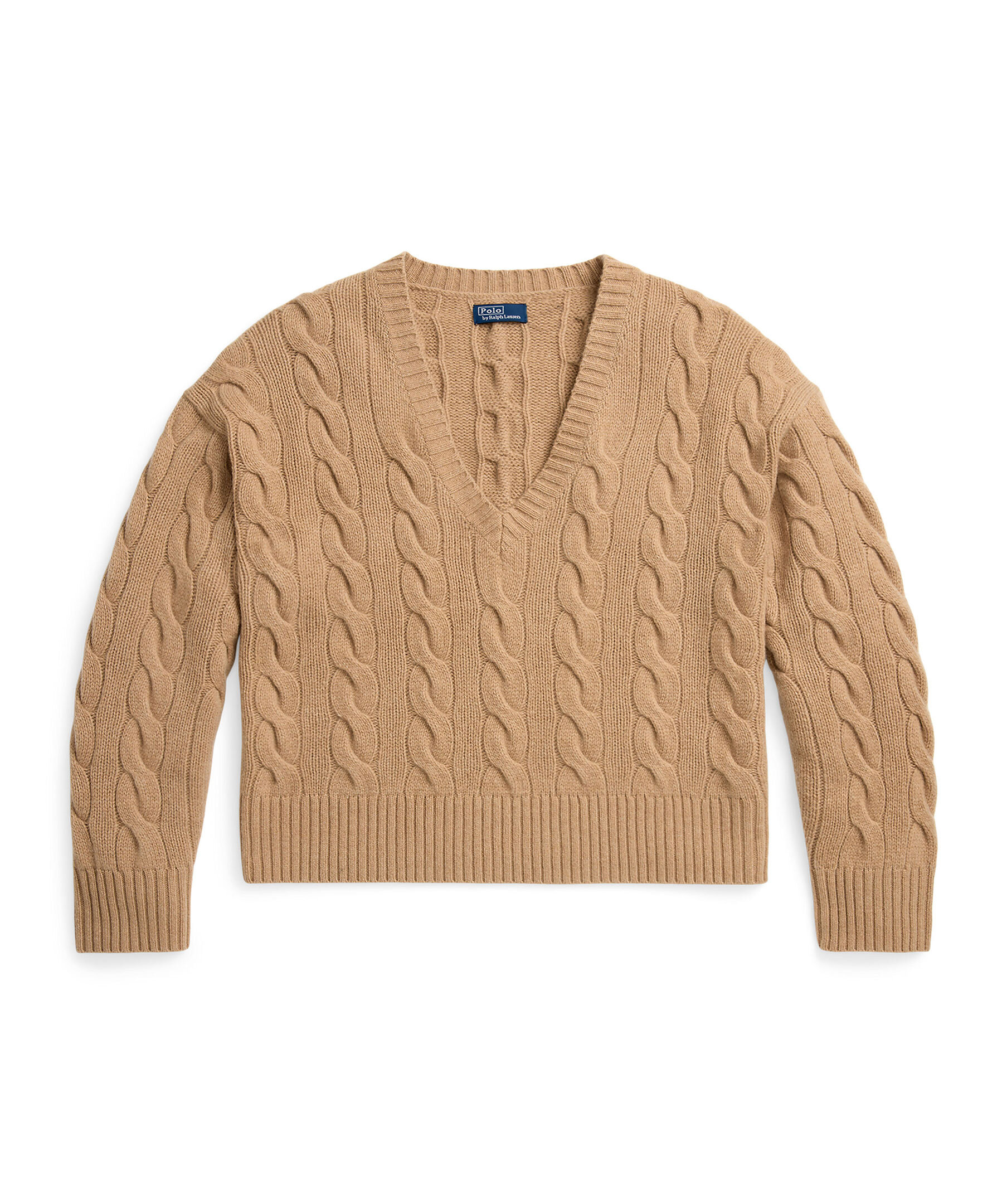 Kamelfärgad, kabelstickad tröja från Polo Ralph Lauren. Tröjan har v-ringad, ribbstickad hals samt ribbstickade muddar. Tillverkad i en ull- och kashmirblandning.