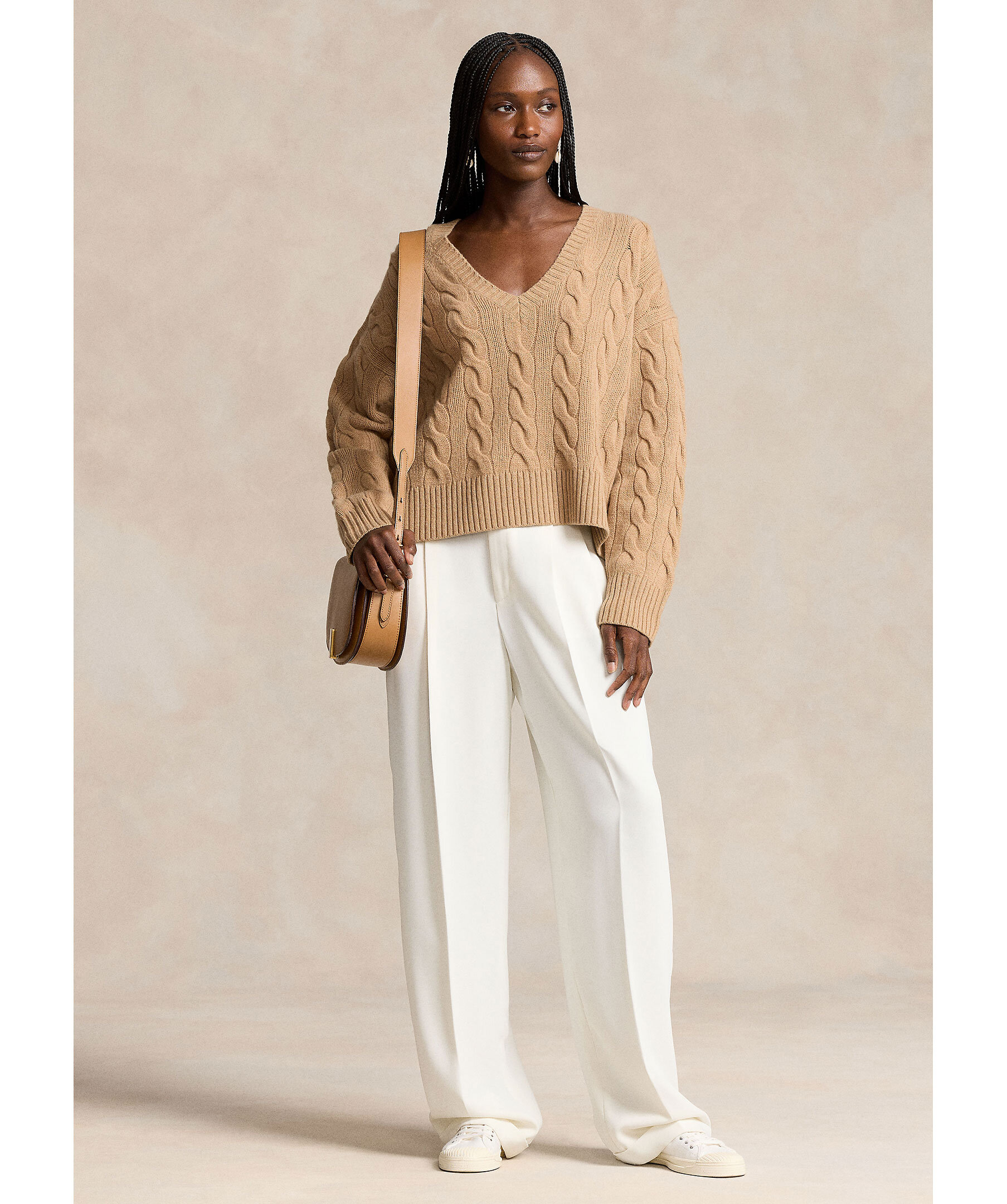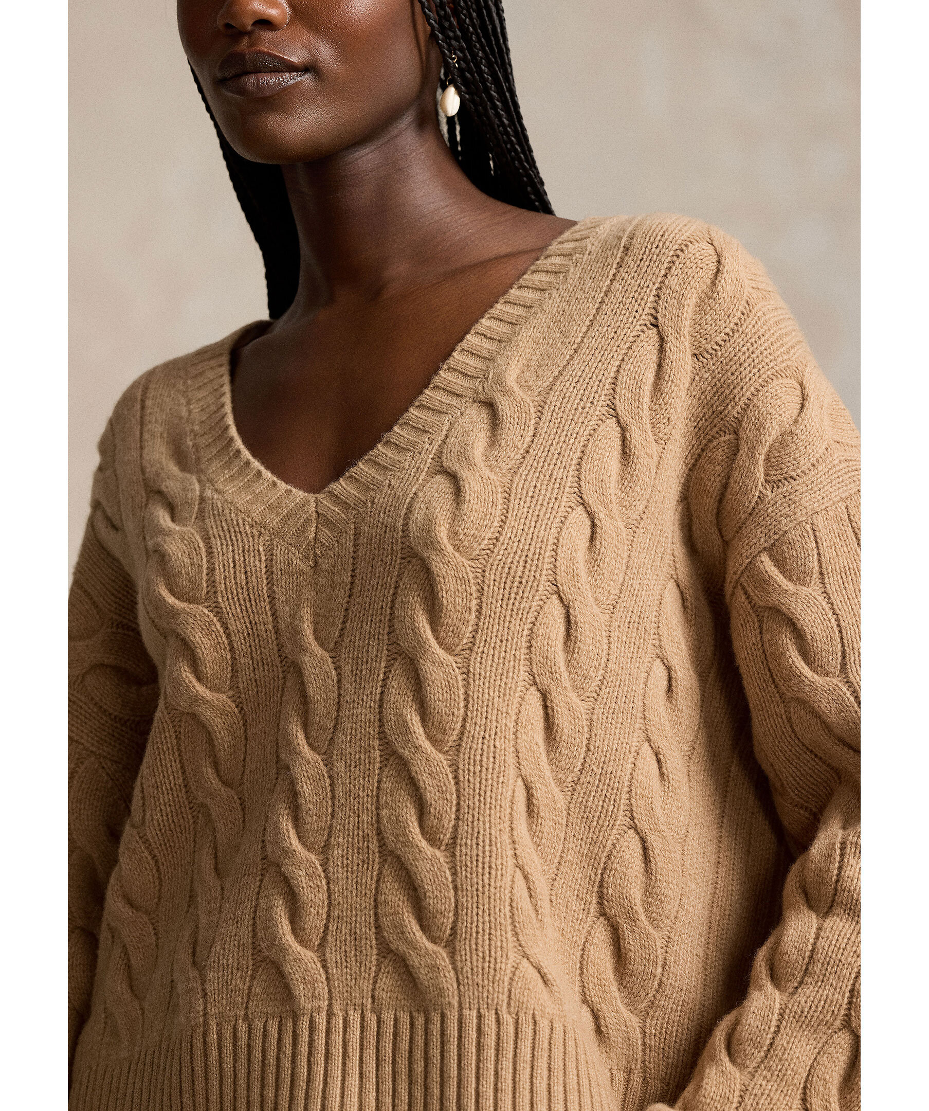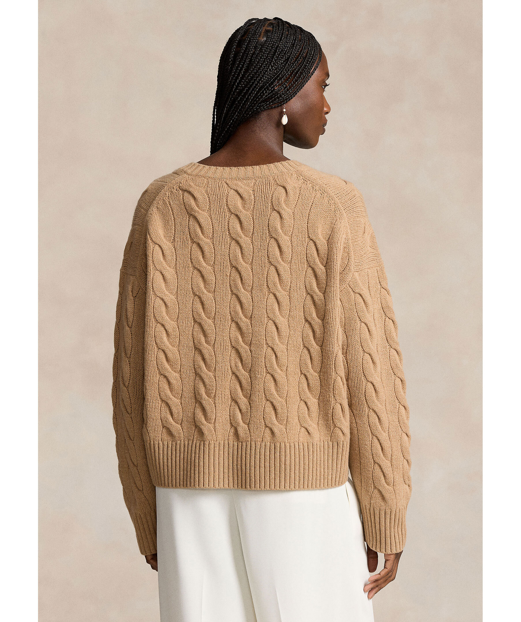 Kamelfärgad, kabelstickad tröja från Polo Ralph Lauren. Tröjan har v-ringad, ribbstickad hals samt ribbstickade muddar. Tillverkad i en ull- och kashmirblandning.