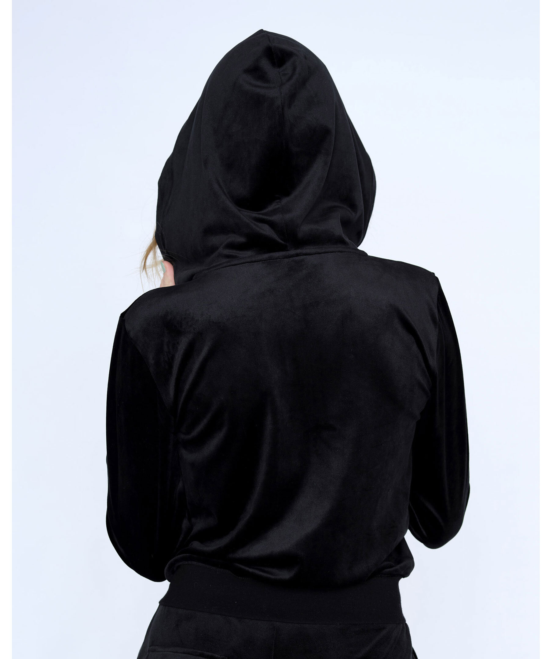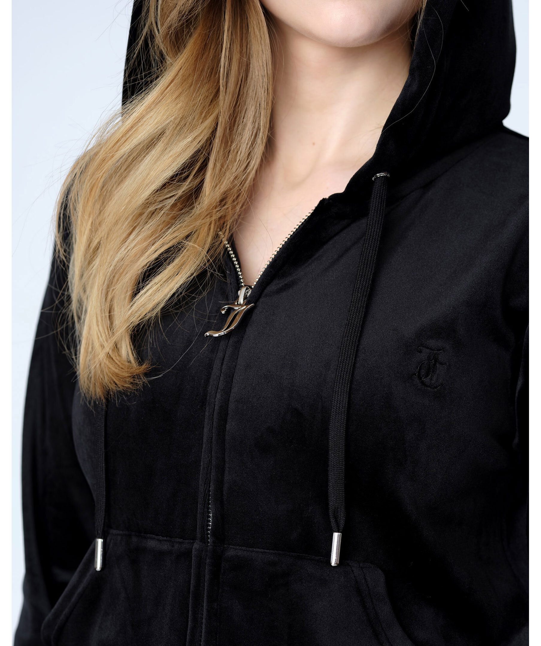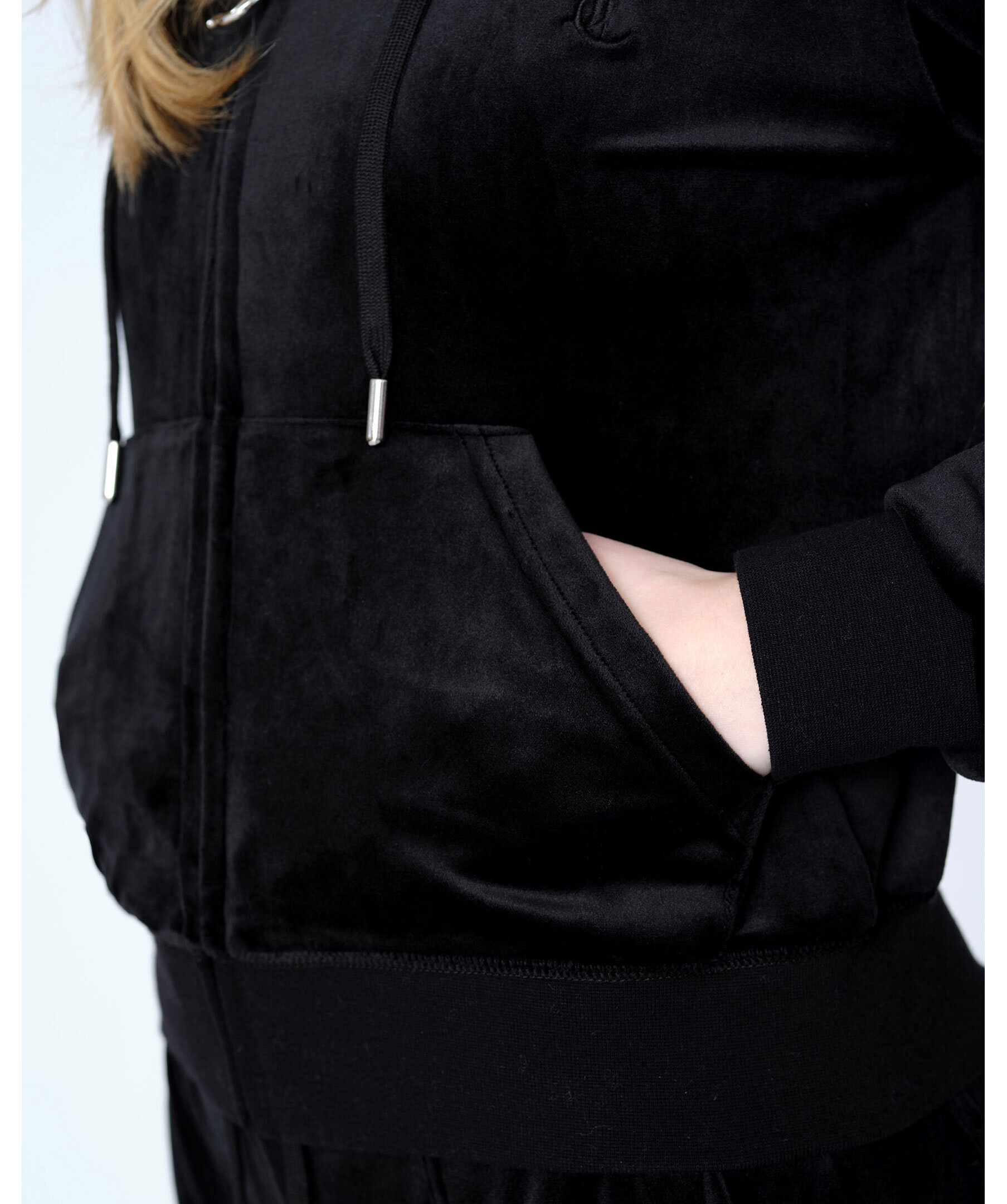 Velour hoodie med dragkedja fram i färgen Black från Juicy Couture. Bred mudd i plaggslut och i ärmslut, broderad logotyp i ton-i-ton på bröstet på vänster sida. Snörning i luvan och fickor fram.