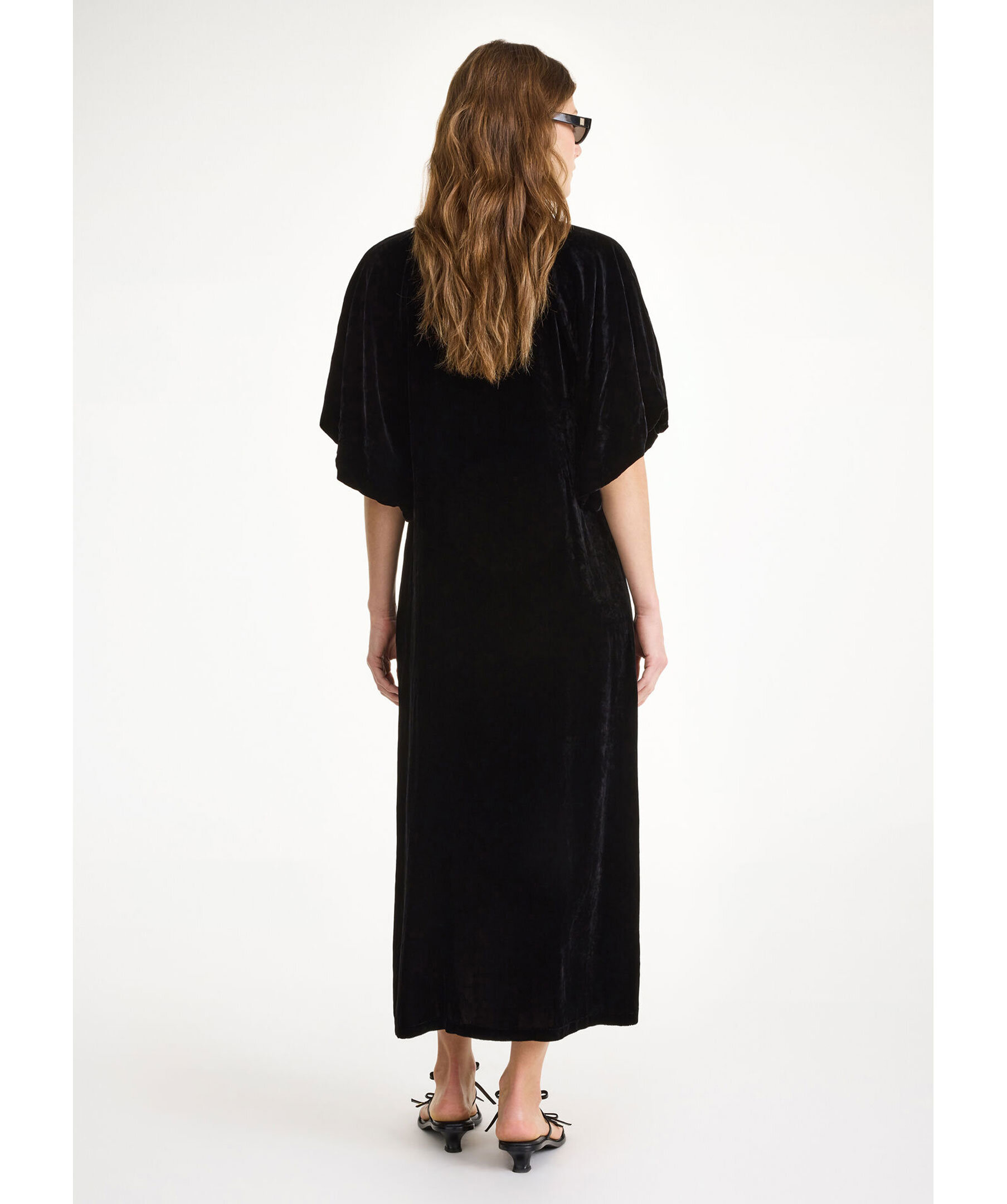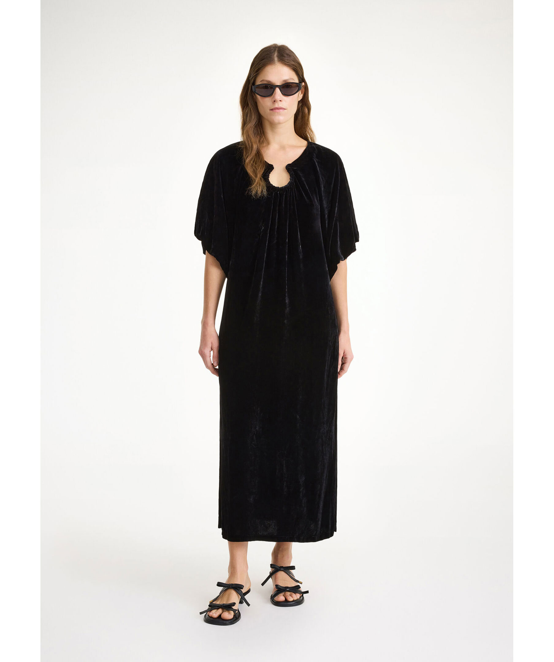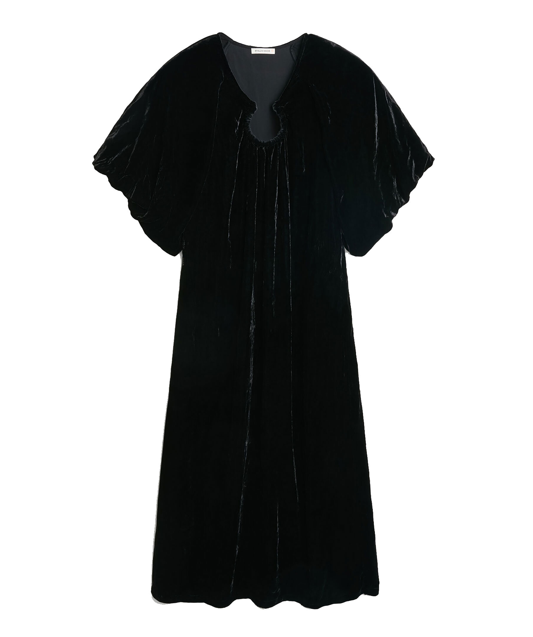 Svart maxiklänning i sammet från By Malene Birger. Klänningen har voluminösa ballongärmar och en justerbar halsringning. Tillverkad i en visko- och sidenblandning.