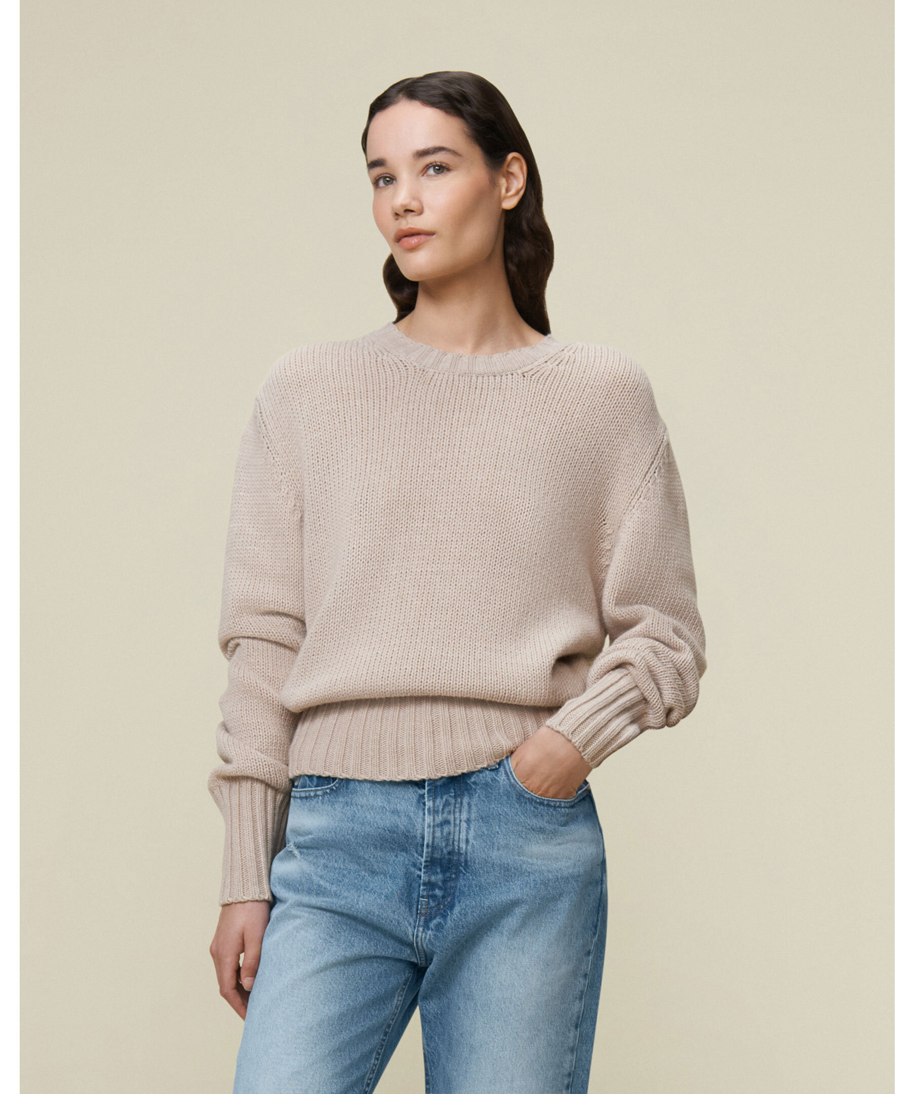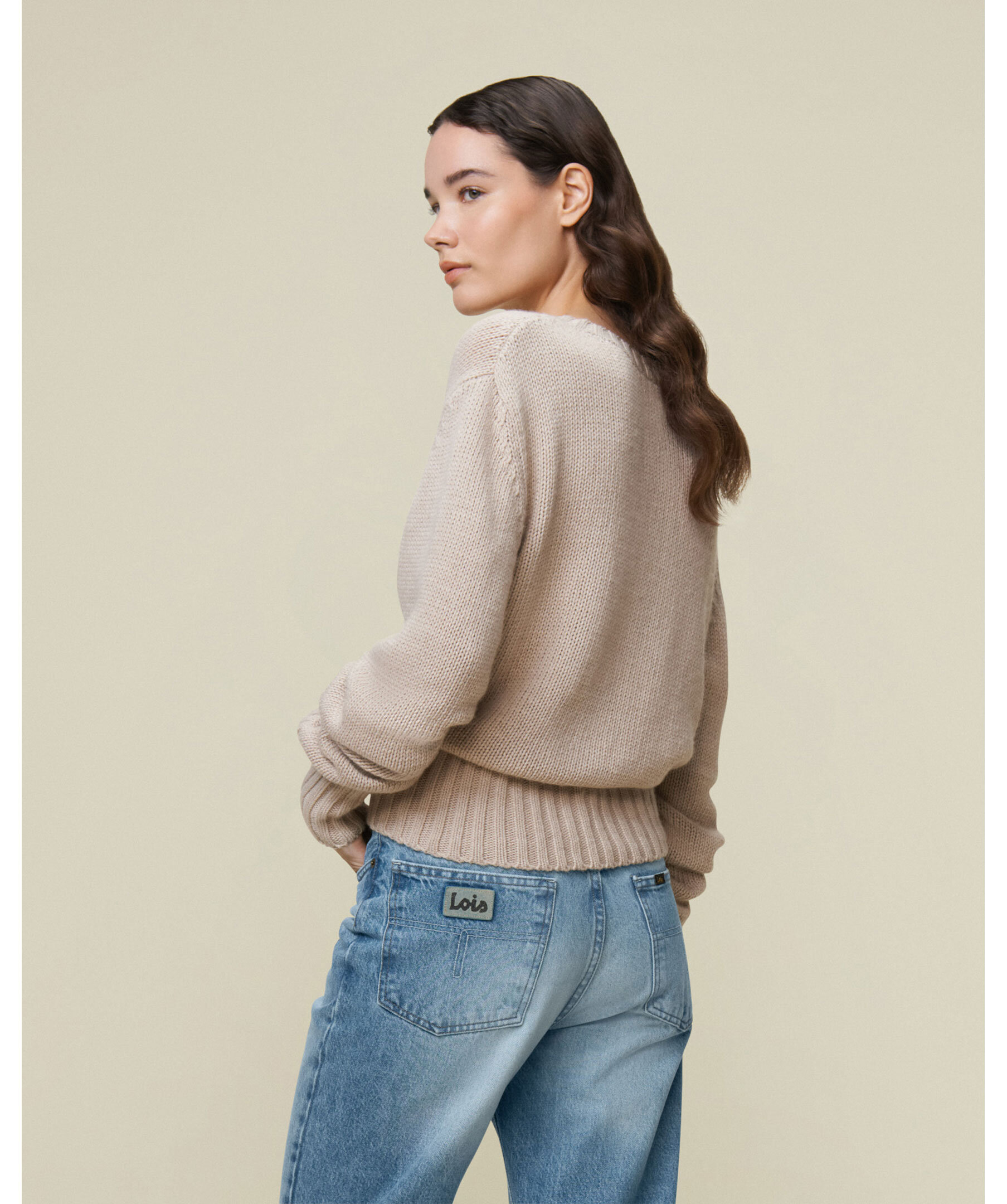 Beige, stickad tröja från Lois. Avslappnad passform och gjord i en ullblandning. Modellen är 174 cm lång och har på sig storlek S.