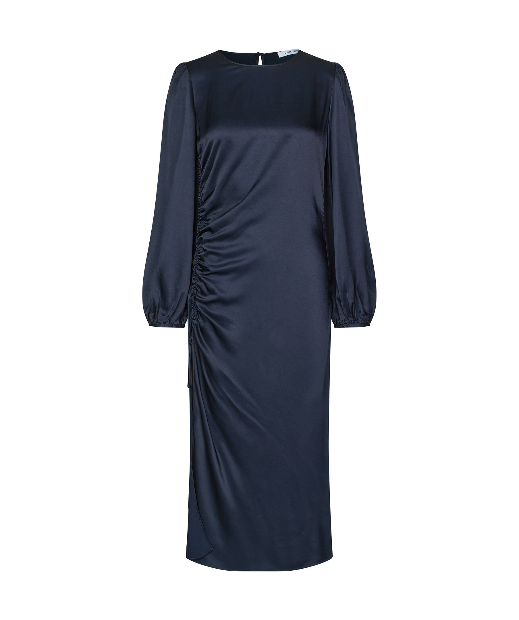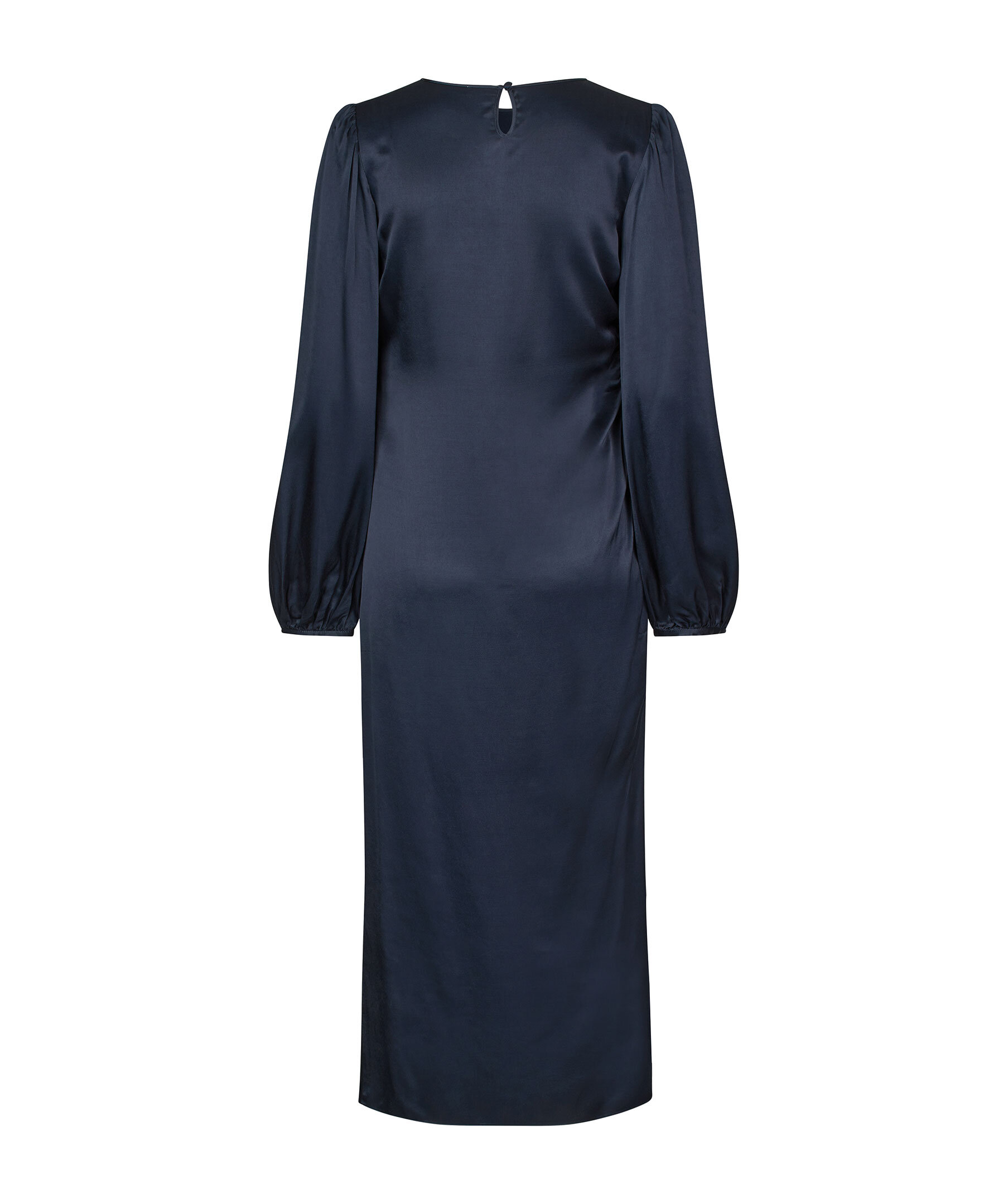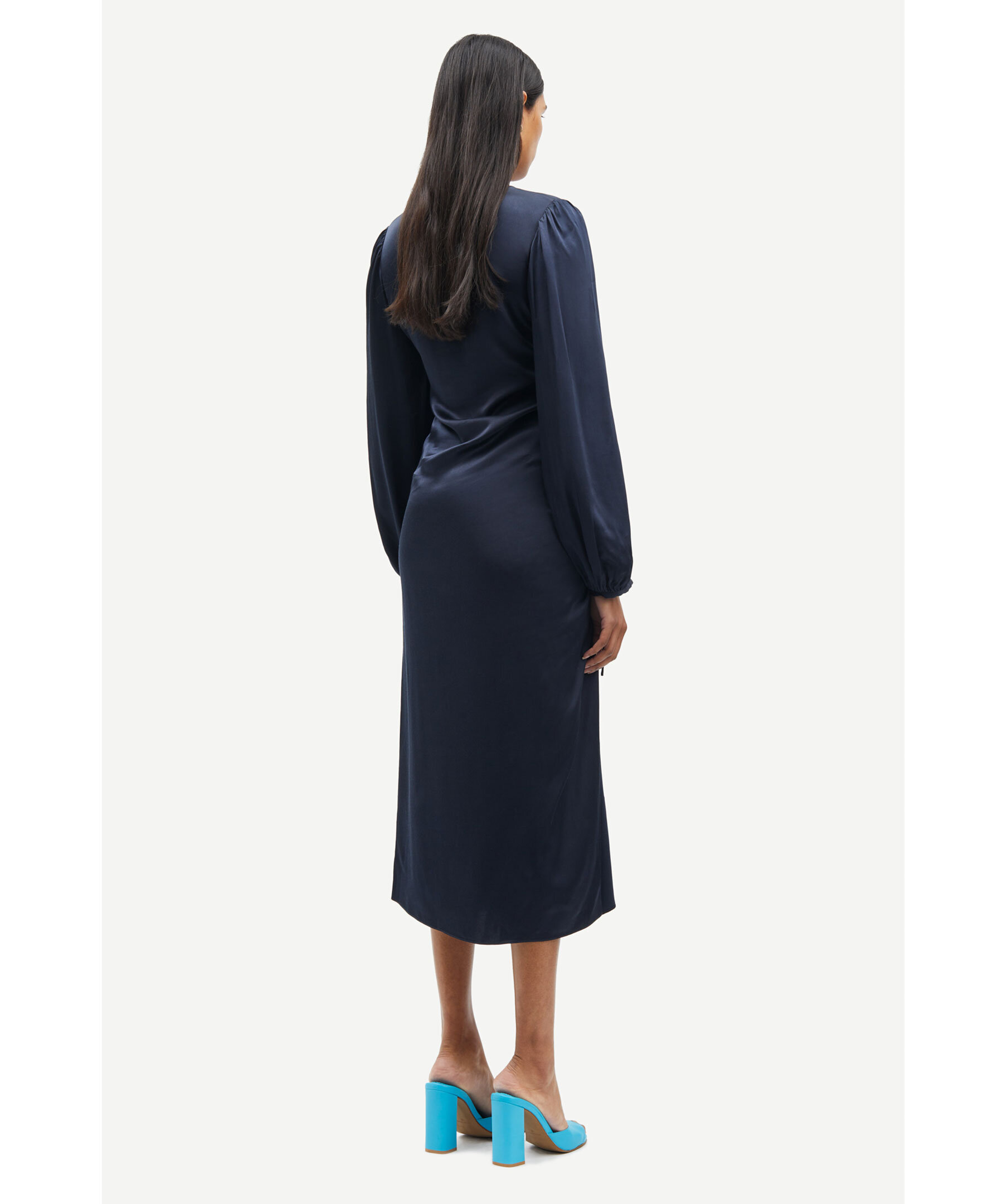 Mörkblå, långärmad midiklänning i satin från Samsoe Samsoe. Normal passform och snedskuren. Ögla och knappstängning bak. Slits och dragsko i sidan för rynkade detaljer. Huvudmaterial tillverkat av en LENZING™ ECOVERO™ viskosblandning. Längd från High Point Shoulder på storlek small är 101,8 cm.