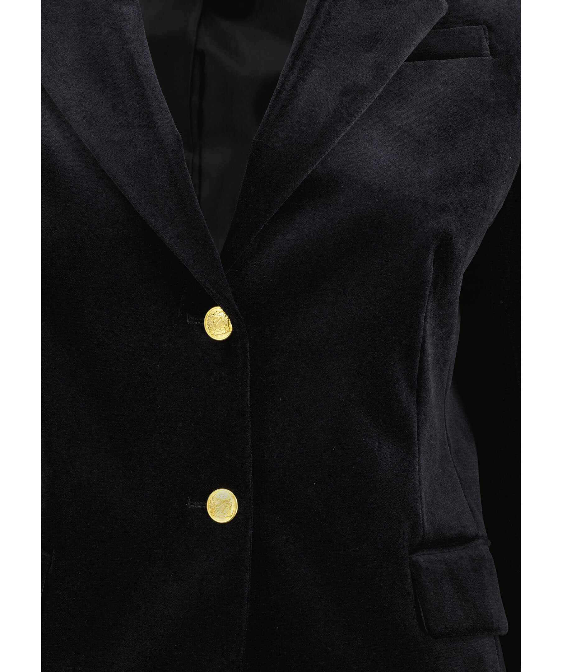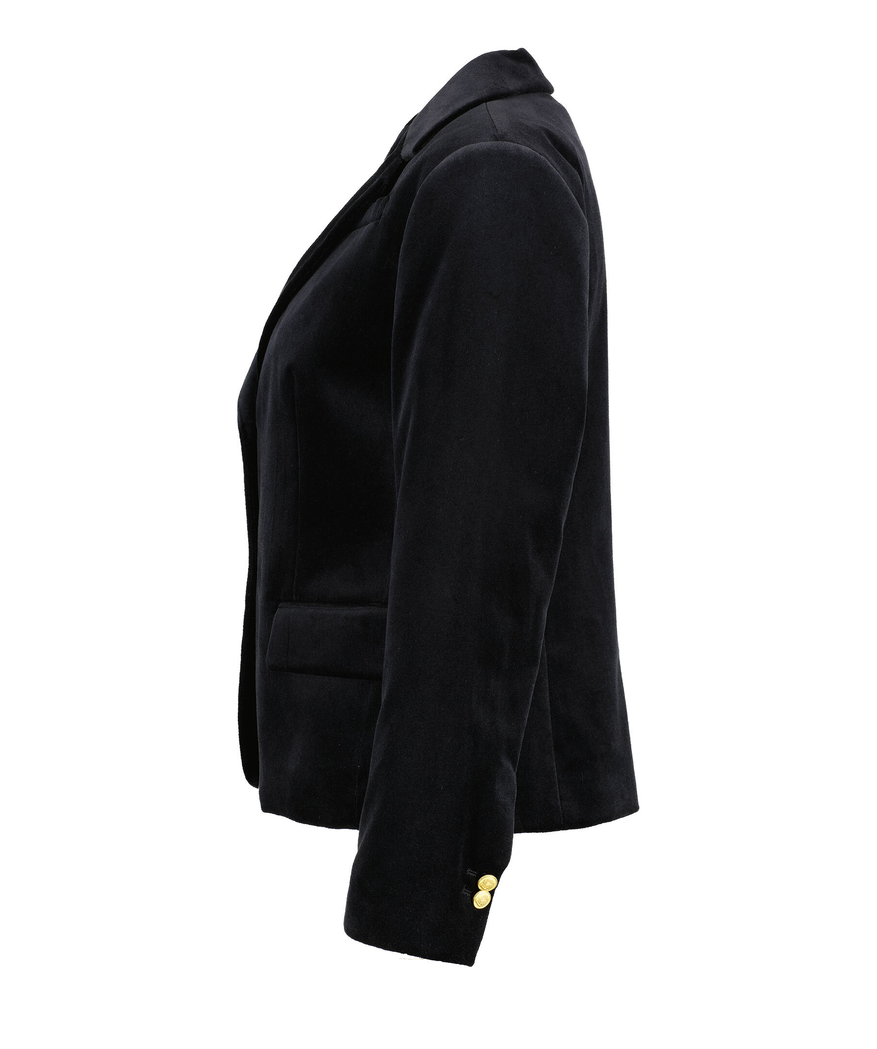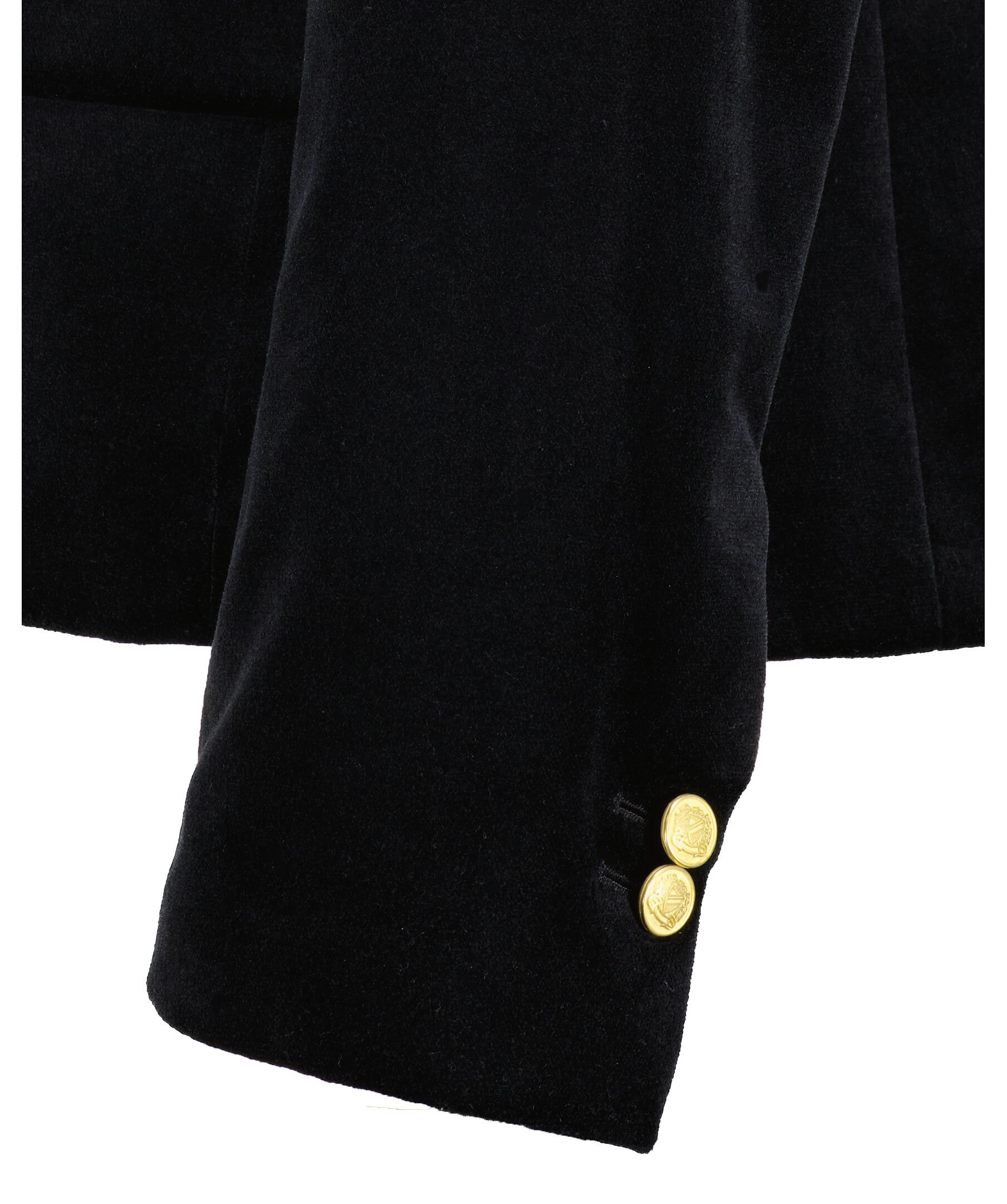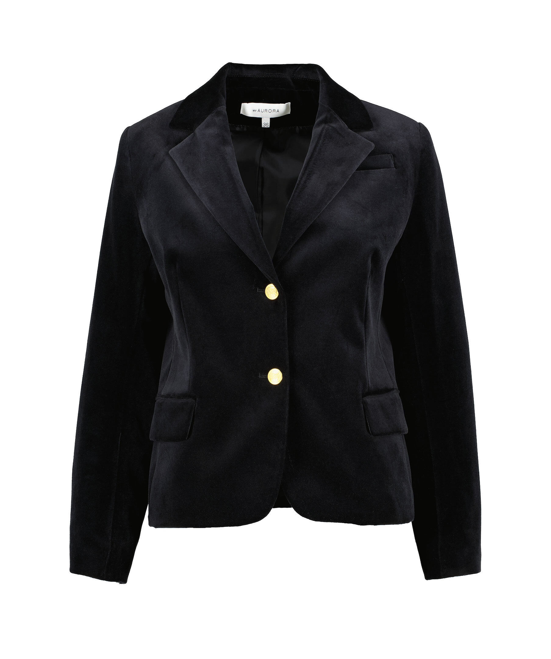 Svart kort sammets kavaj från My Aurora. Kavajen stängs framtill med två knappar. På framsidan finns två fickor framtill med lock samt en bröstficka. Manschetter knappar vid ärmslut. Alla knappar är guldpläterade med präglad logotyp. Tillverkad av 100% bomull med ett innertyg i polyester.