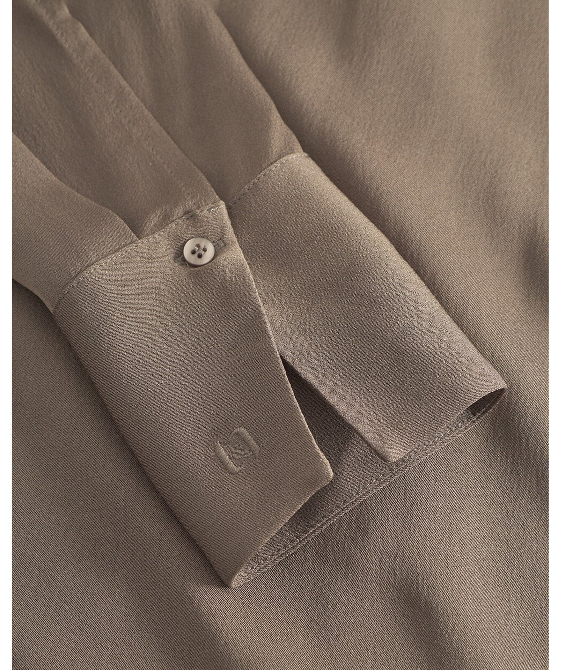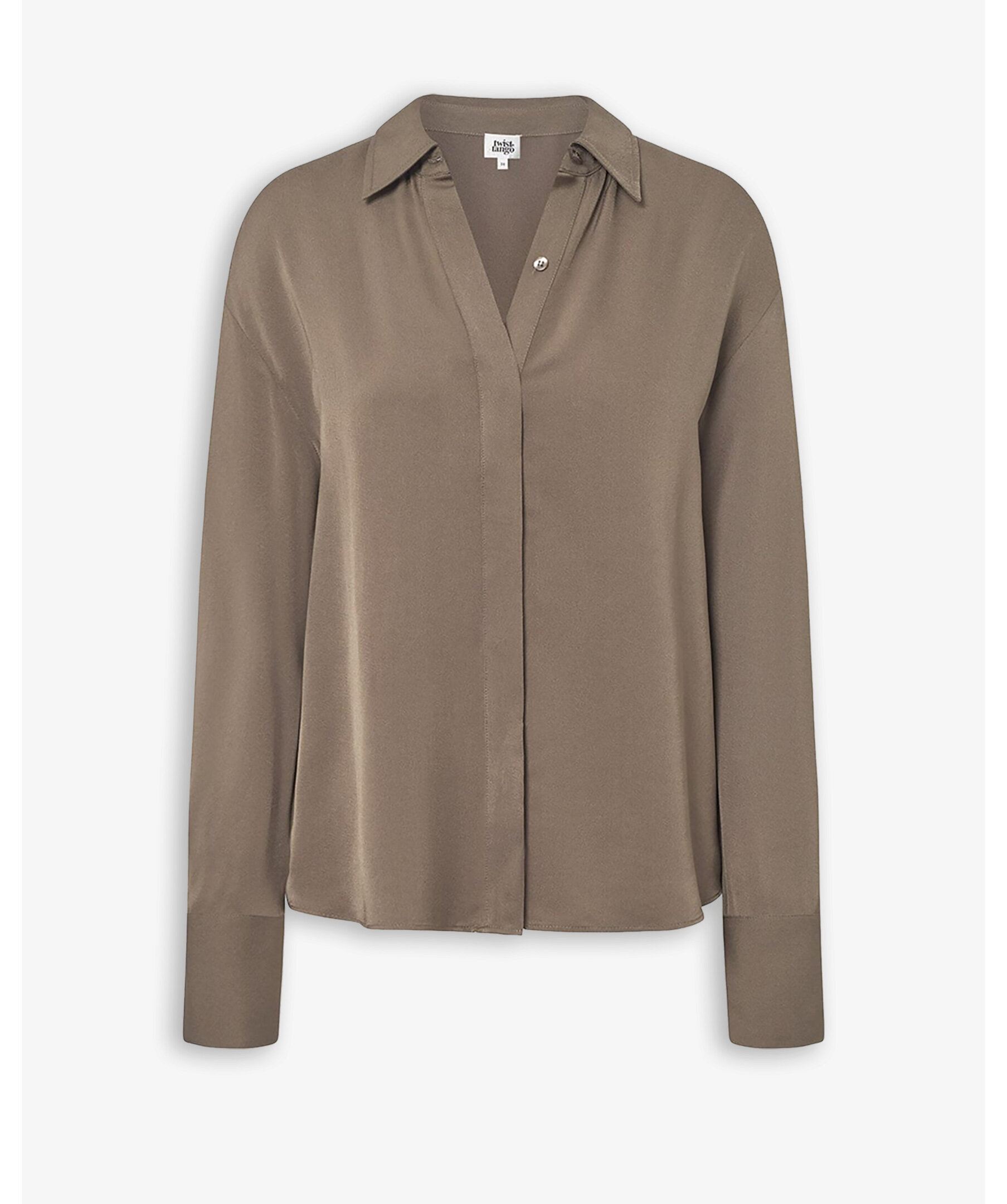 Långärmad brun satinblus från Twist & Tango i mjuk och flytande viscose som draperar elegant. Blusen har klassisk krage och långa ärmar med knäppta manschetter — perfekt att bära både till vardags och till fest.