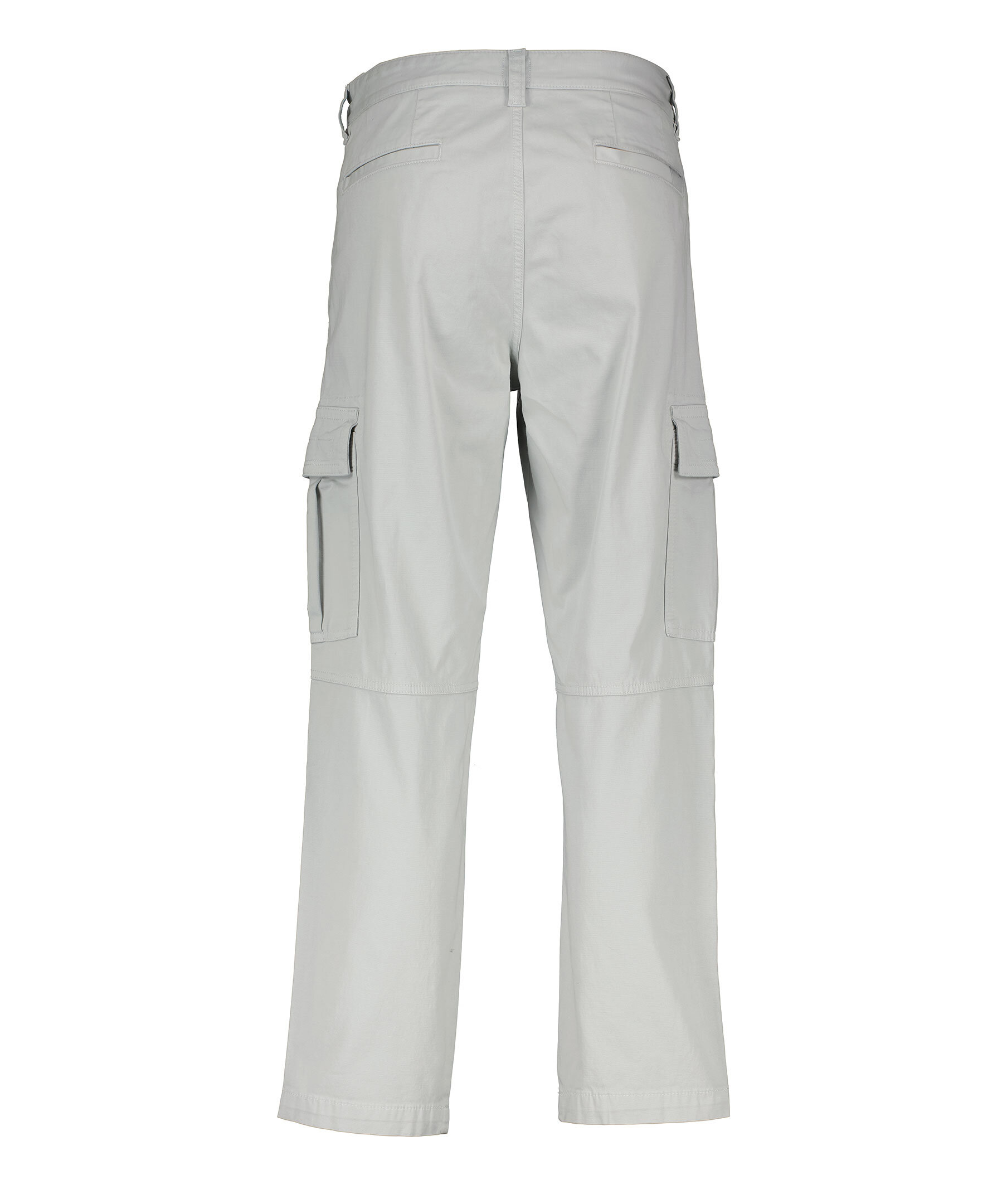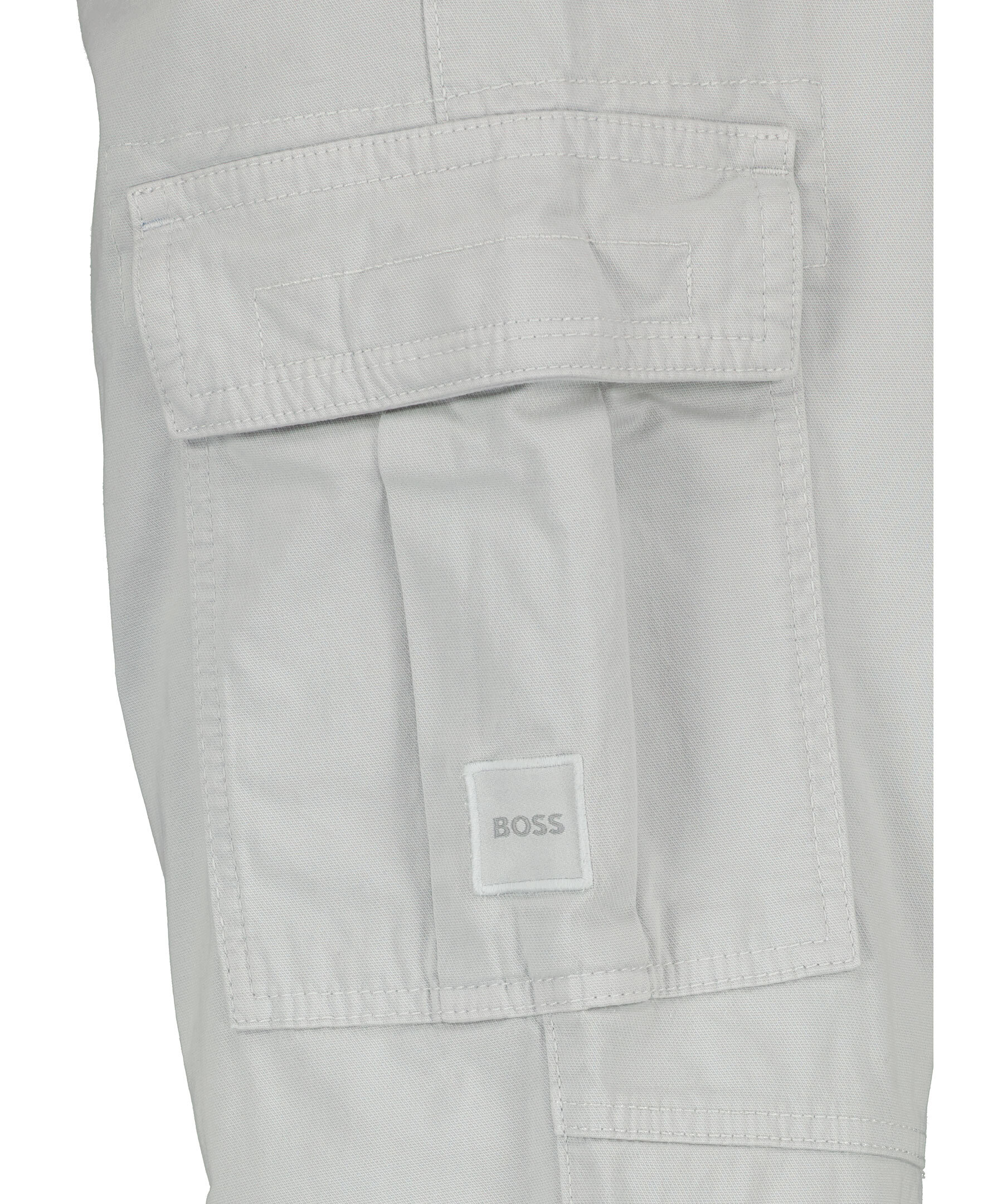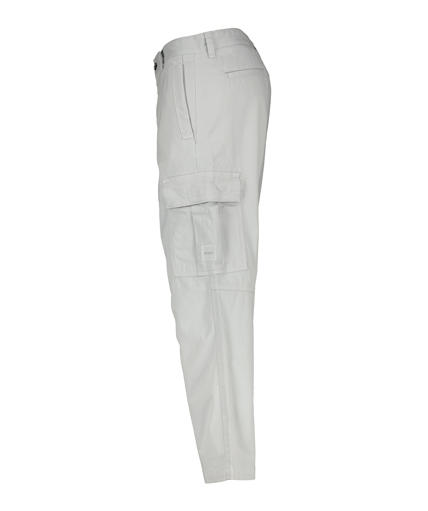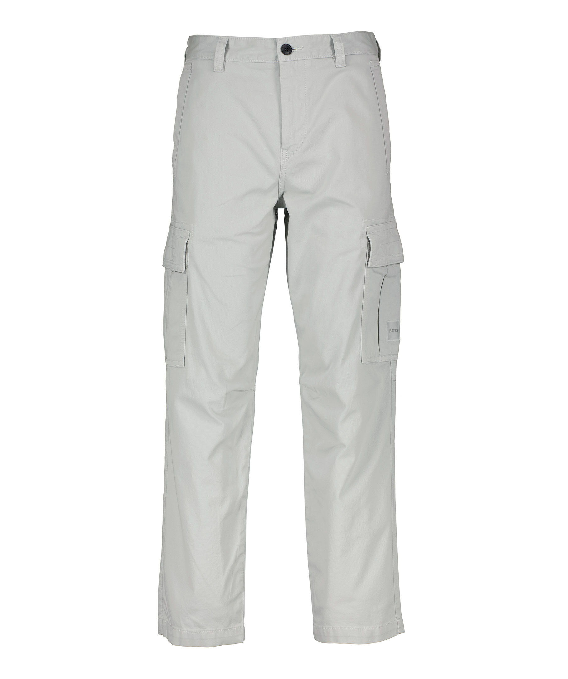 Gråa cargobyxor från BOSS Orange. Byxorna har medlehög midja med bälteshällor, avsmalnande ben, sex fickor varav två har lock. Liten logotyp på ena patch-fickan. Tillverkade i stretchbomull.
