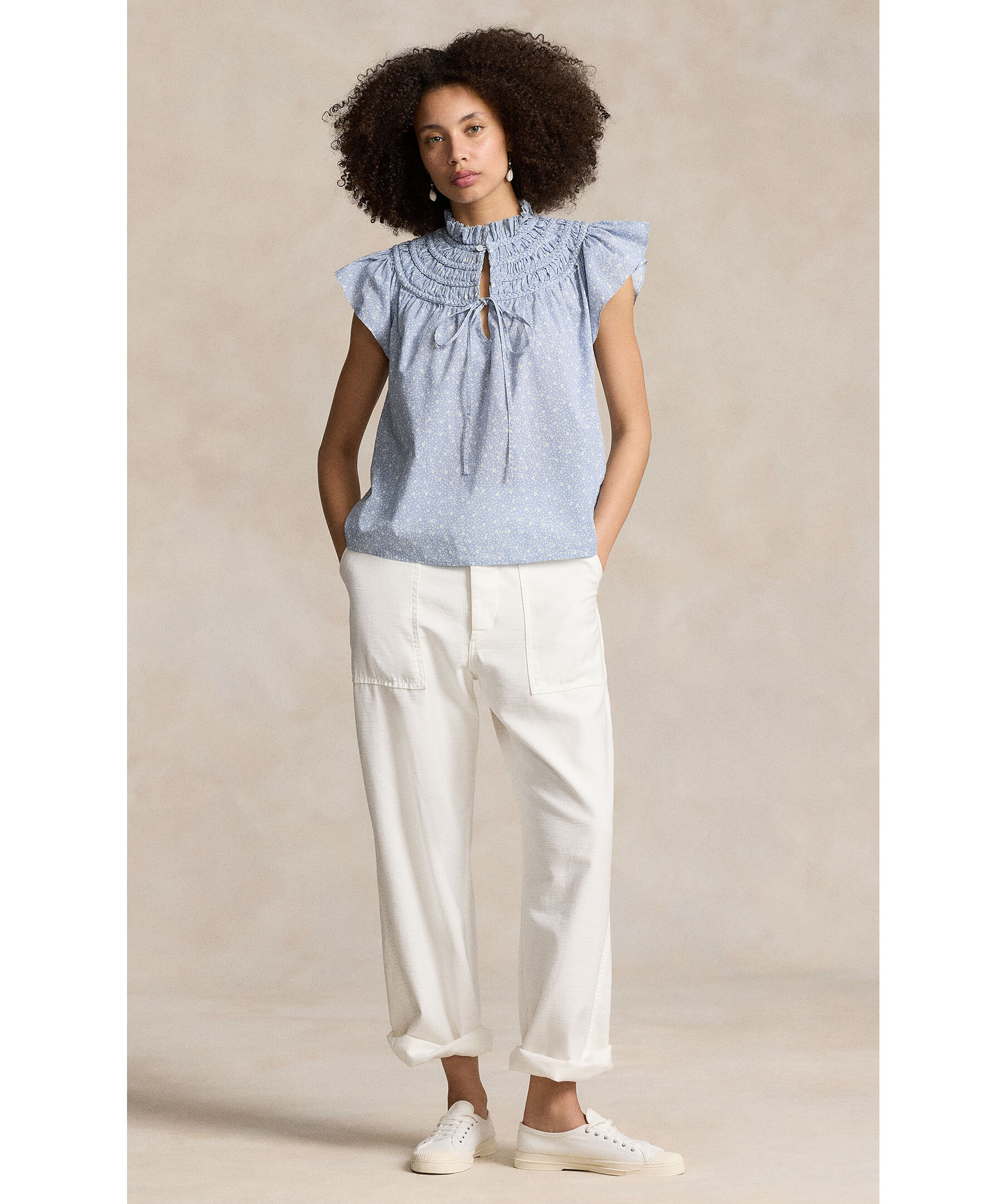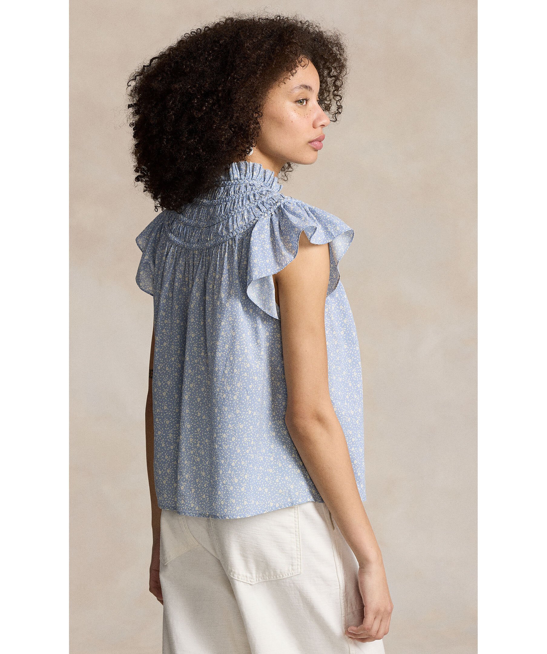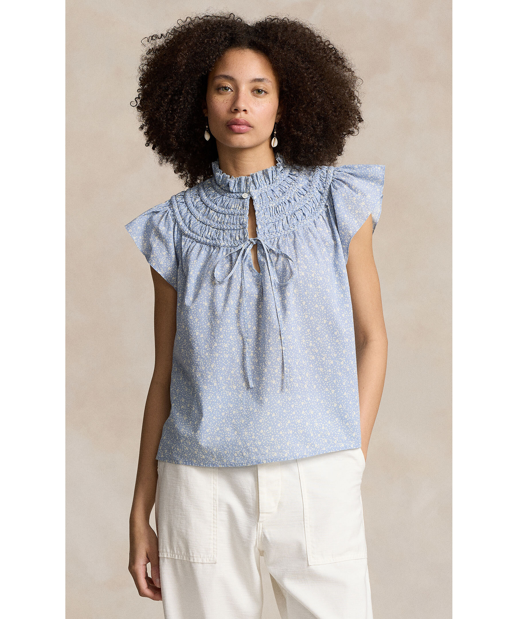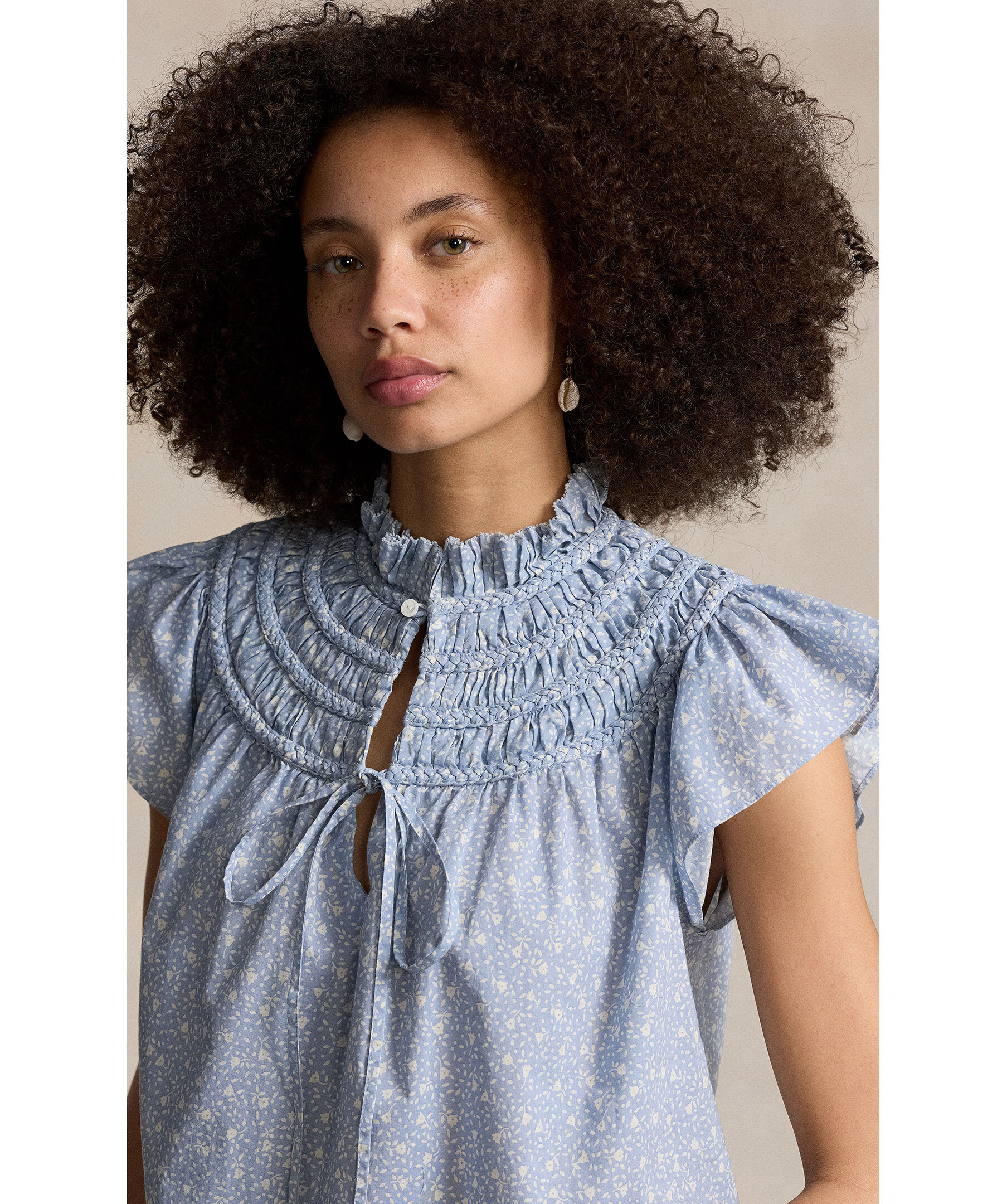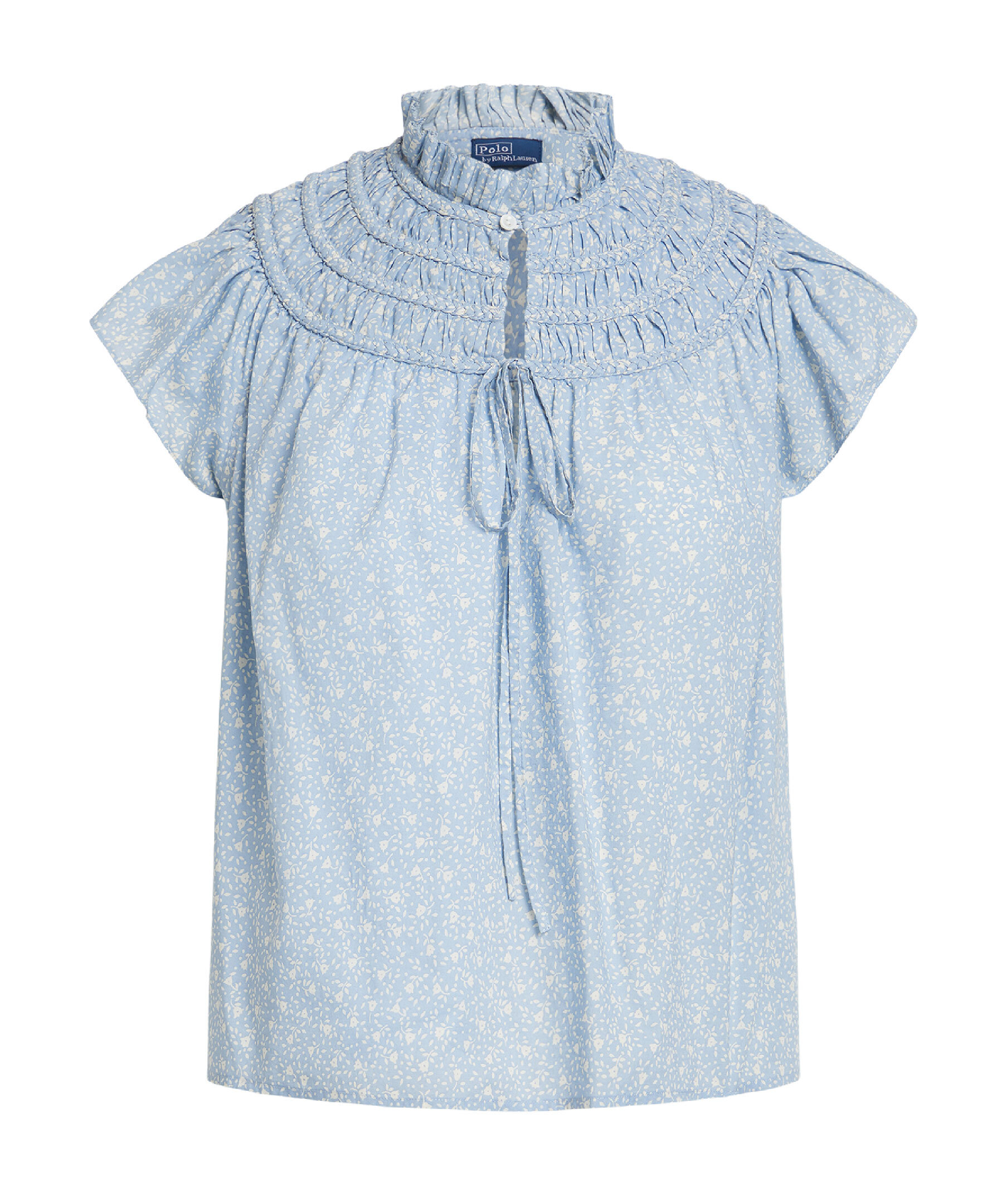 Ljusblå kortärmad blus med vitt blommönster från Polo Ralph Lauren. Blusen har en klassisk design med en ståkrage och en knappslå fram. korta ärmar med volang detaljer. Den är dekorerad med broderade detaljer och knytband.