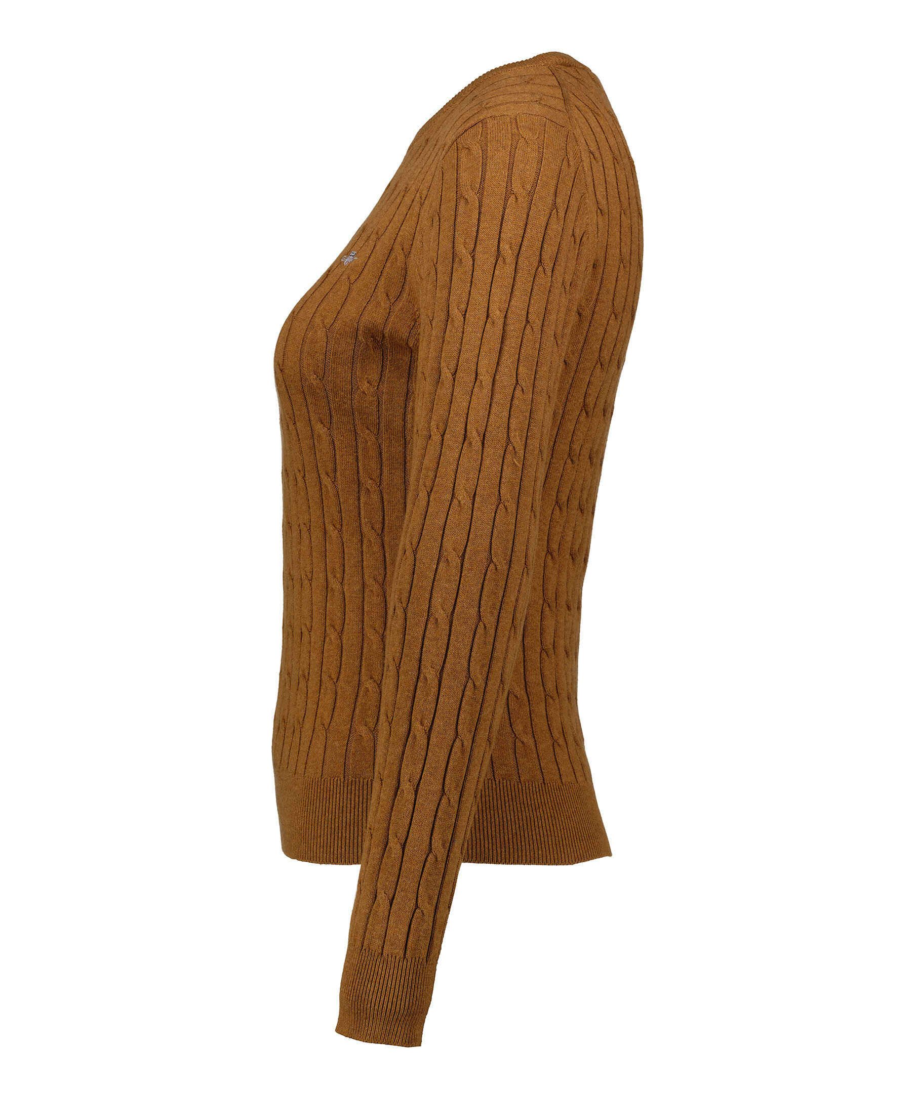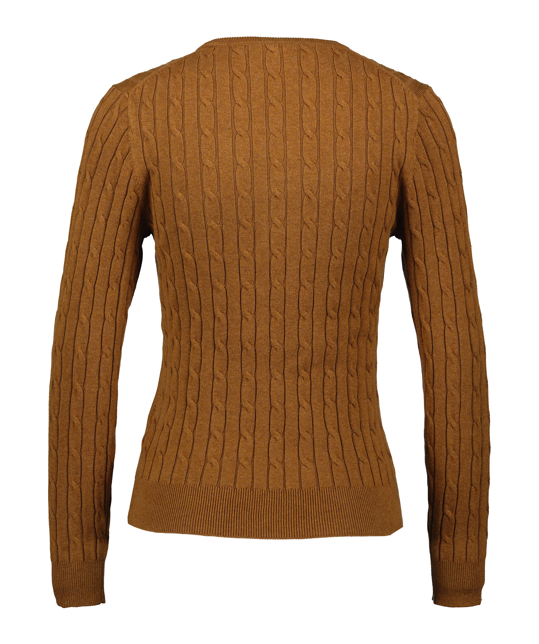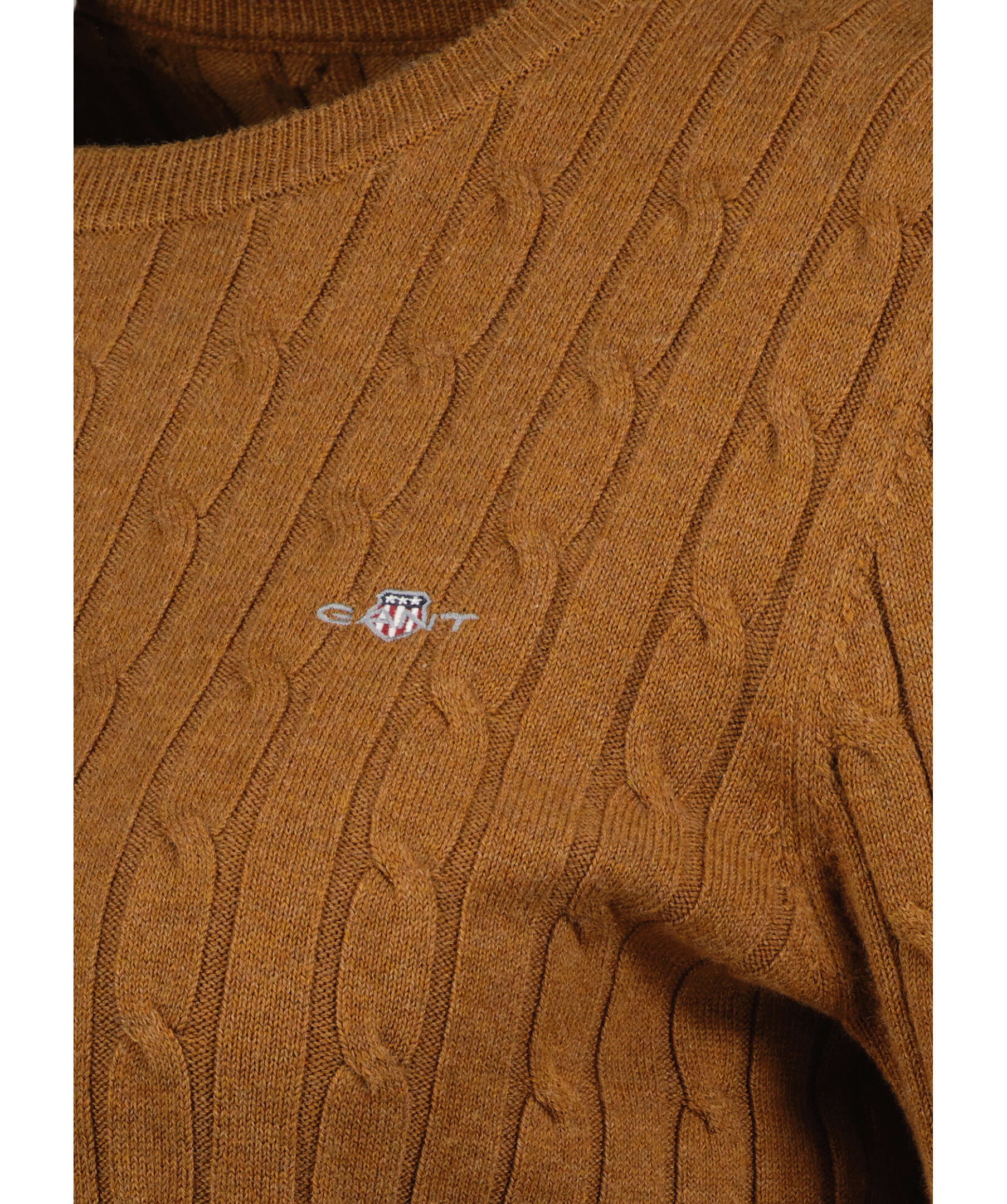 Brun klassisk kabelstickad tröja från Gant. Tillverkad i en mjuk bomullsblandning och har en klassisk rund halsringning, ribbstickade detaljer samt deras klassiska sköld broderad på bröstet.