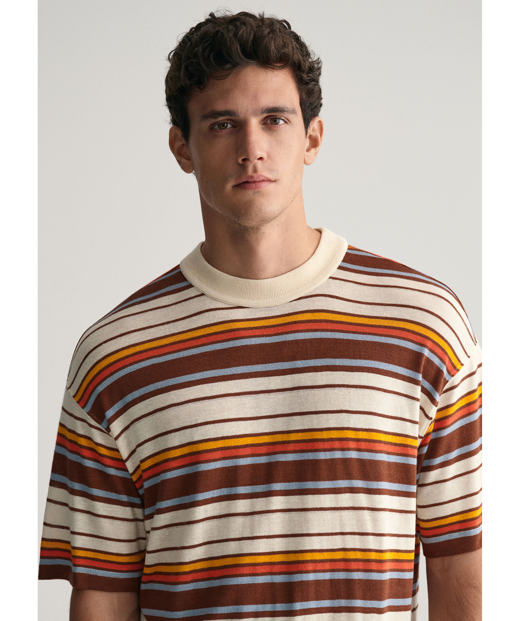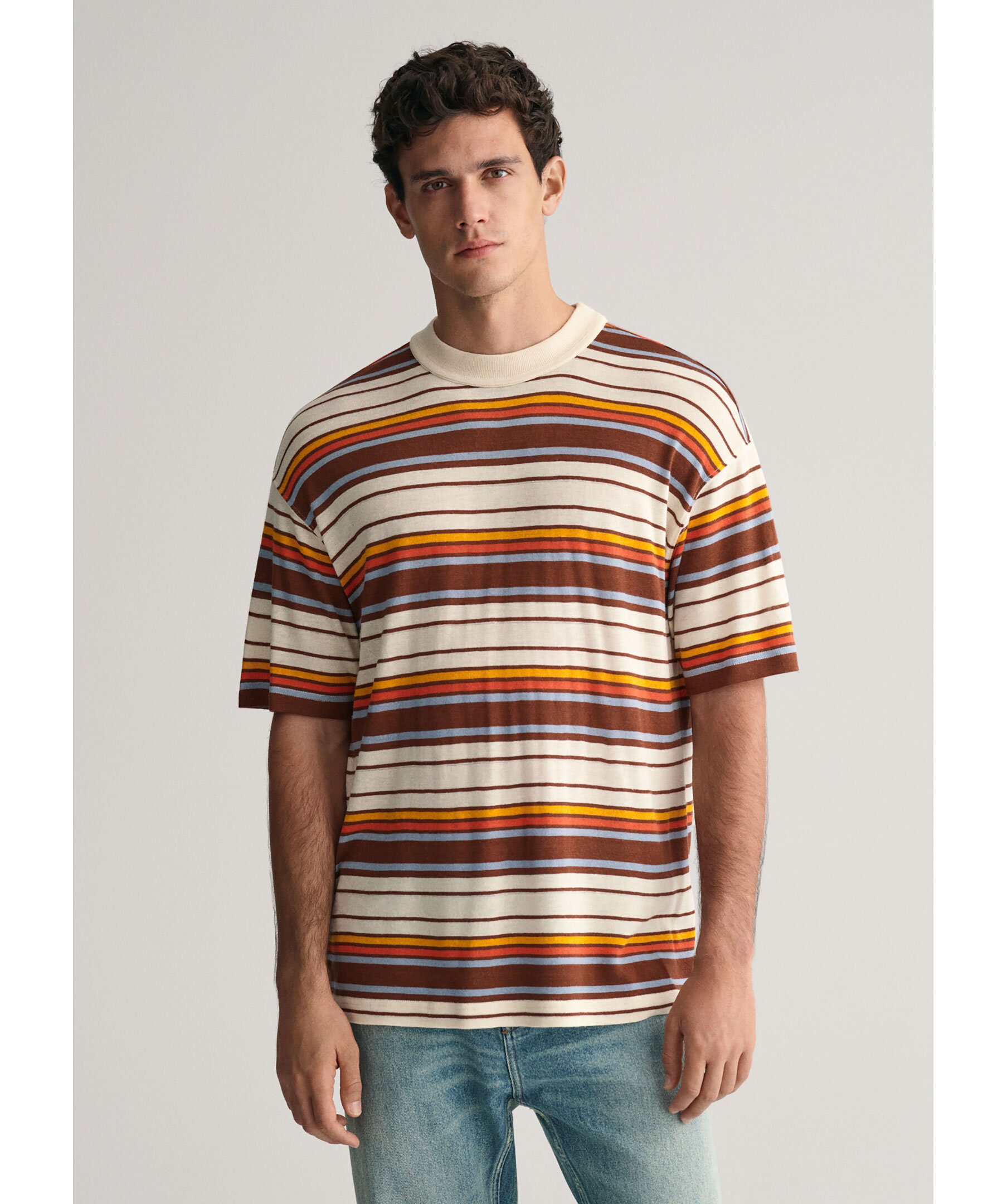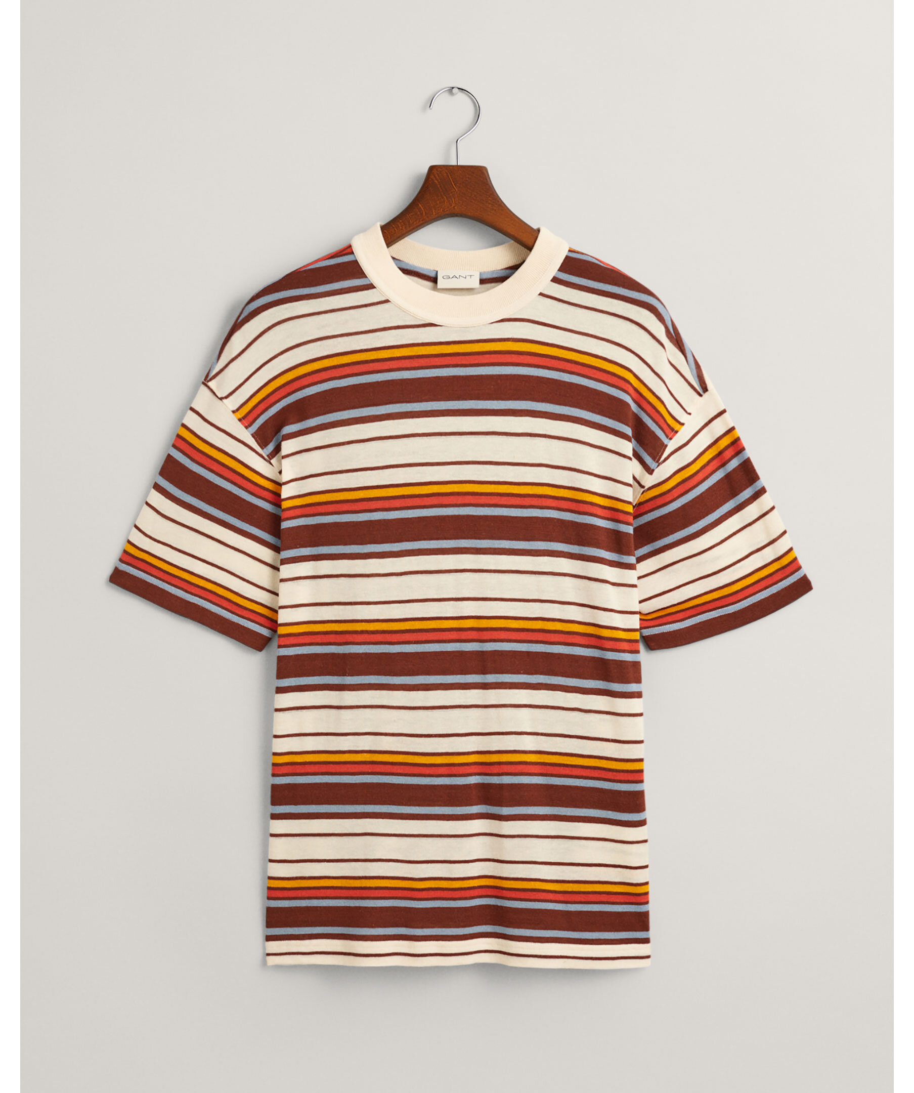 Multifärgad, randig t-shirt från Gant. T-shirten har rund halsringning, korta ärmar samt garnfärgade ränder. Tillverkad i en linne- och viskosblandning.