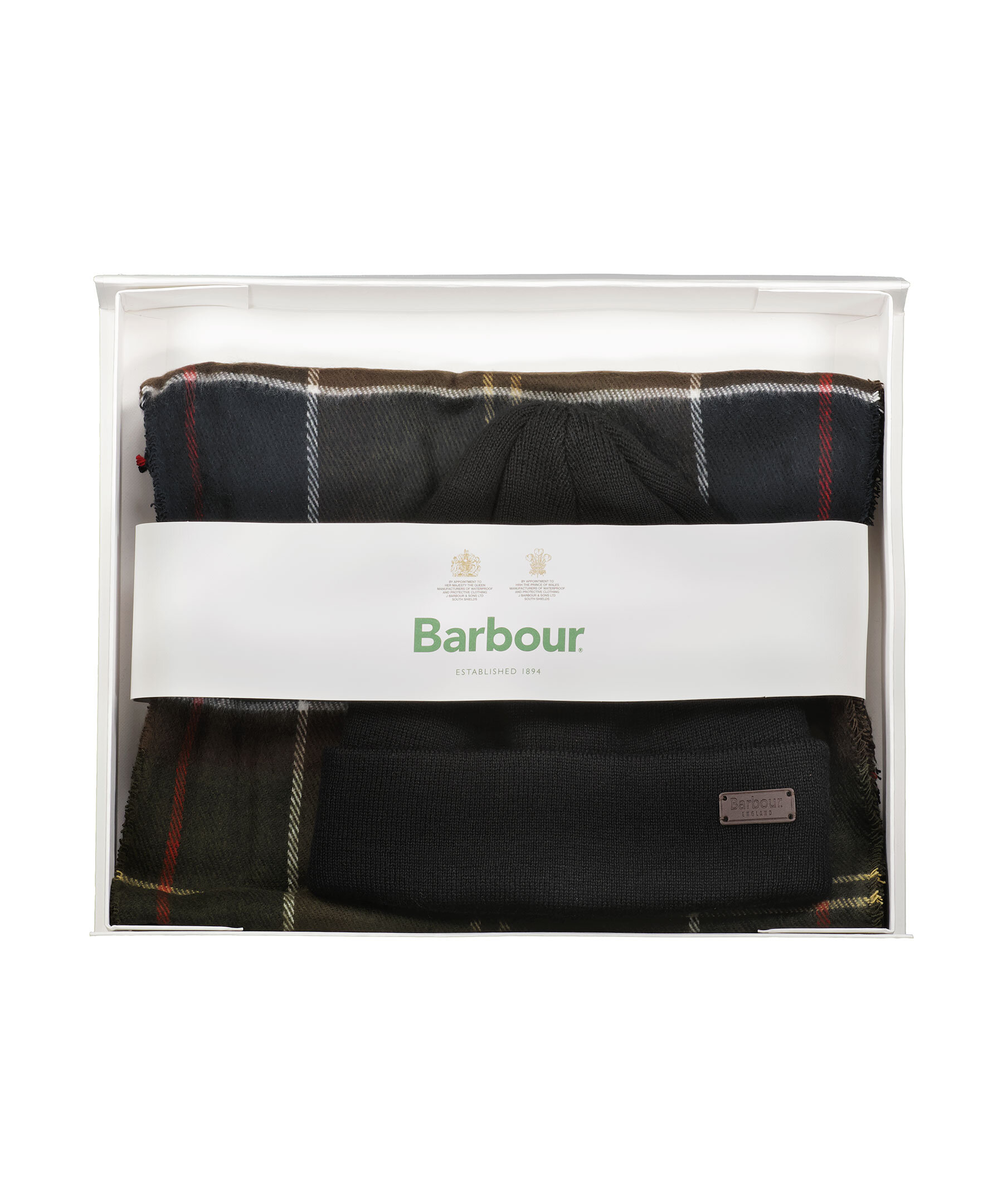 Perfekt presentkit med halsduk och mössa från Barbour. Halsduken har fransar och Barbours klassiska tartantryck medan den ribbade mössan har ett enkelt logotypmärke på den uppvikta kanten. Halsduken är tillverkad i akryl och mössan i en bomullsblandning.