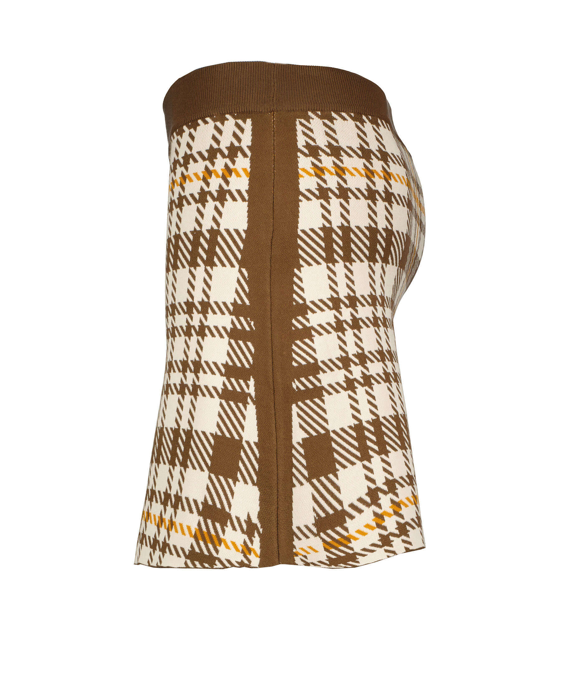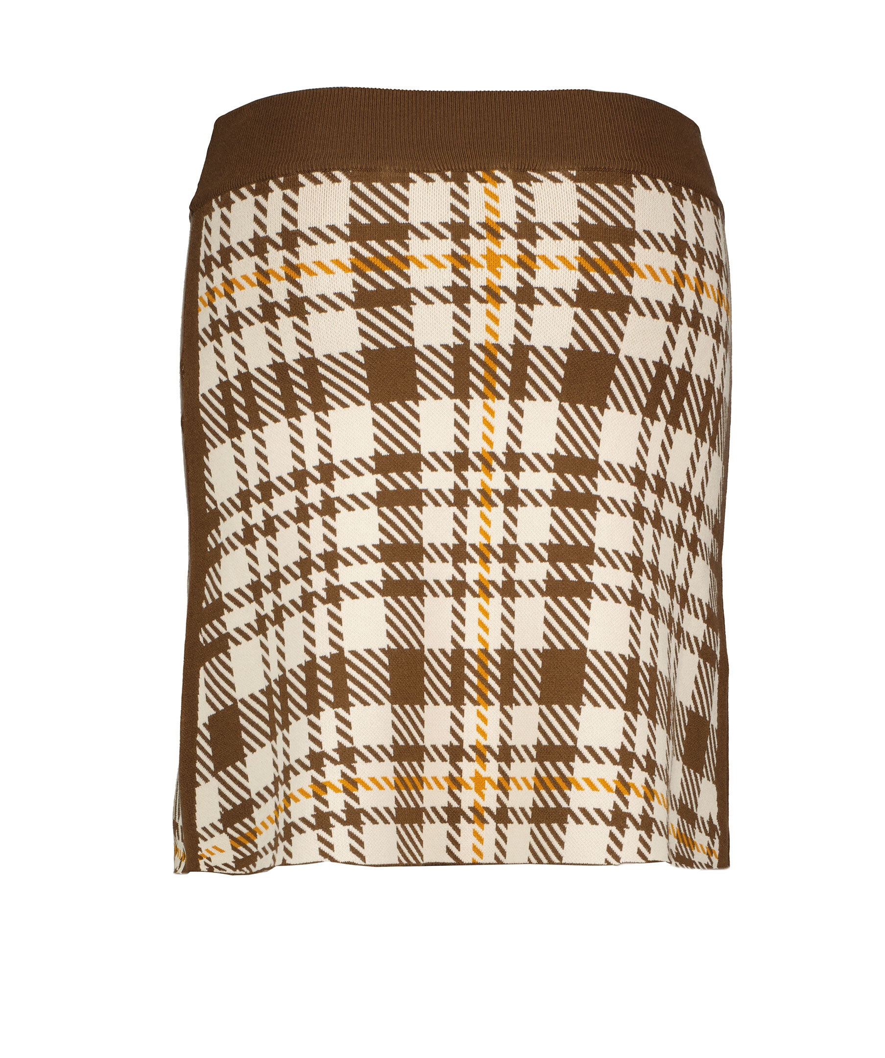 Beige kjol med brunt och orange rutmönster från Rodebjer. Kjolen har bruna kanter och brun, ribbad mudd i midjan. Tillverkad av en viskosblandning.