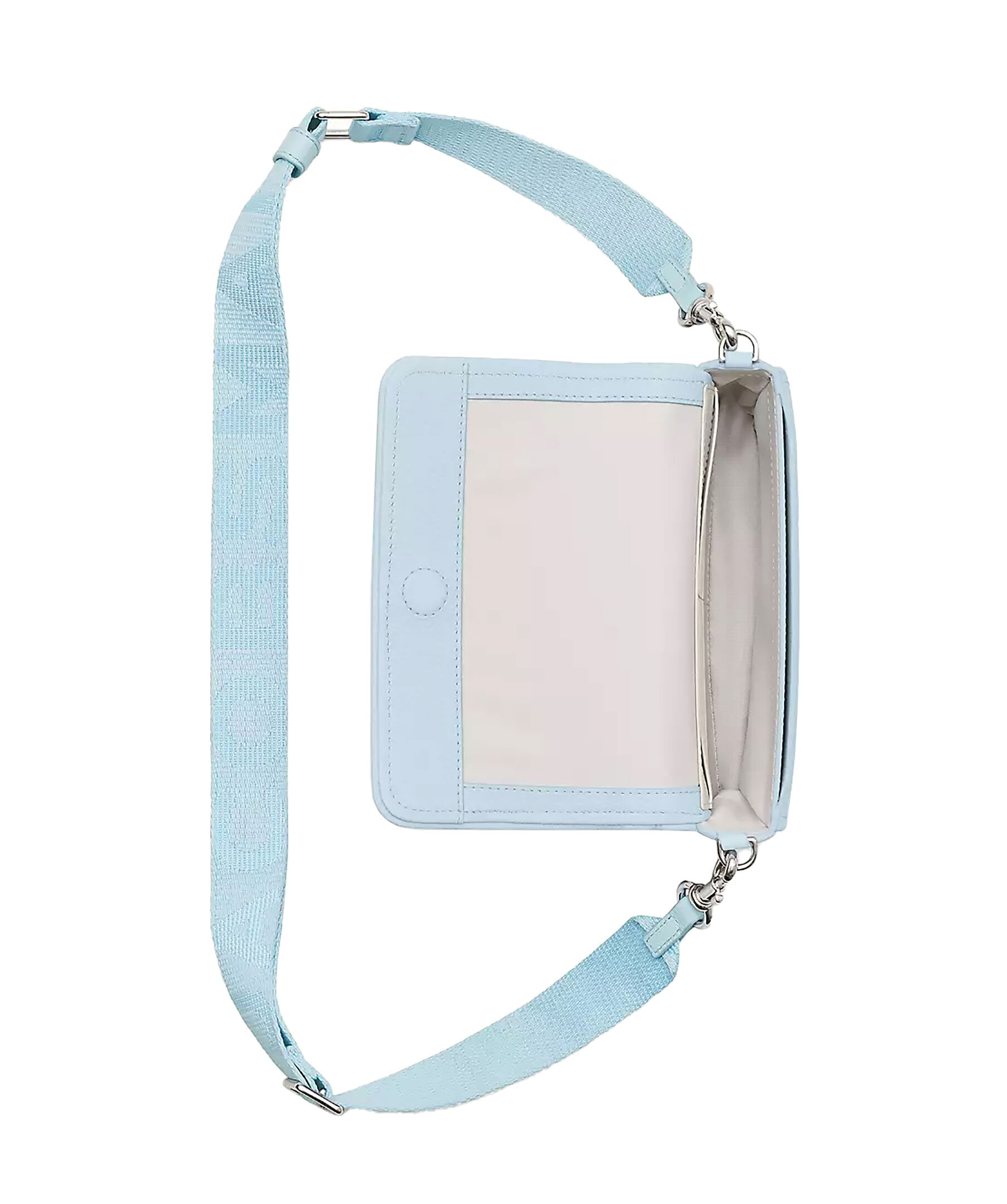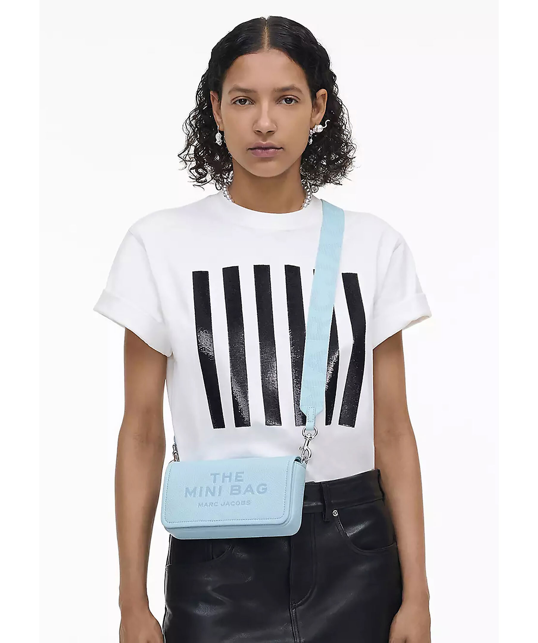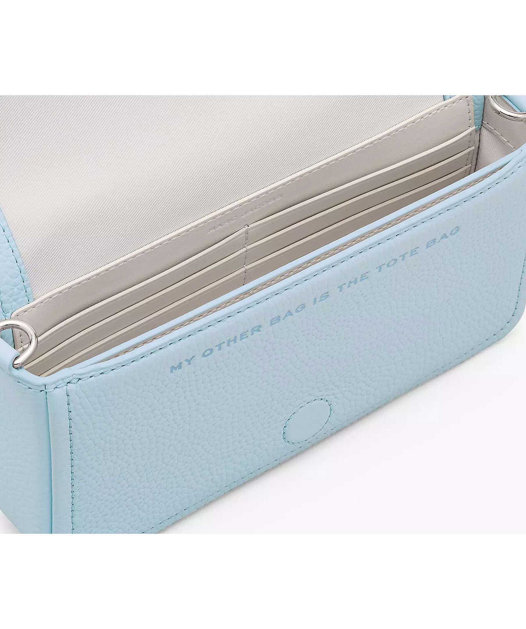 Ljusblå mini crossbodyväska från Marc Jacobs. Tillverkad i fullnarvsläder. Väskan har en ficka och åtta kortplatser. Går att bära som en clutch eller fäst med den justerbara, avtagbara logobandsremmen för handsfree-styling. Väskan har "my other bag is the tote bag" präglat på insidan och "The mini bag Marc Jacobs" Präglad på utsidan. Magnetisk stängning. Mått: L: 20cm, D: 4cm, H: 12cm.