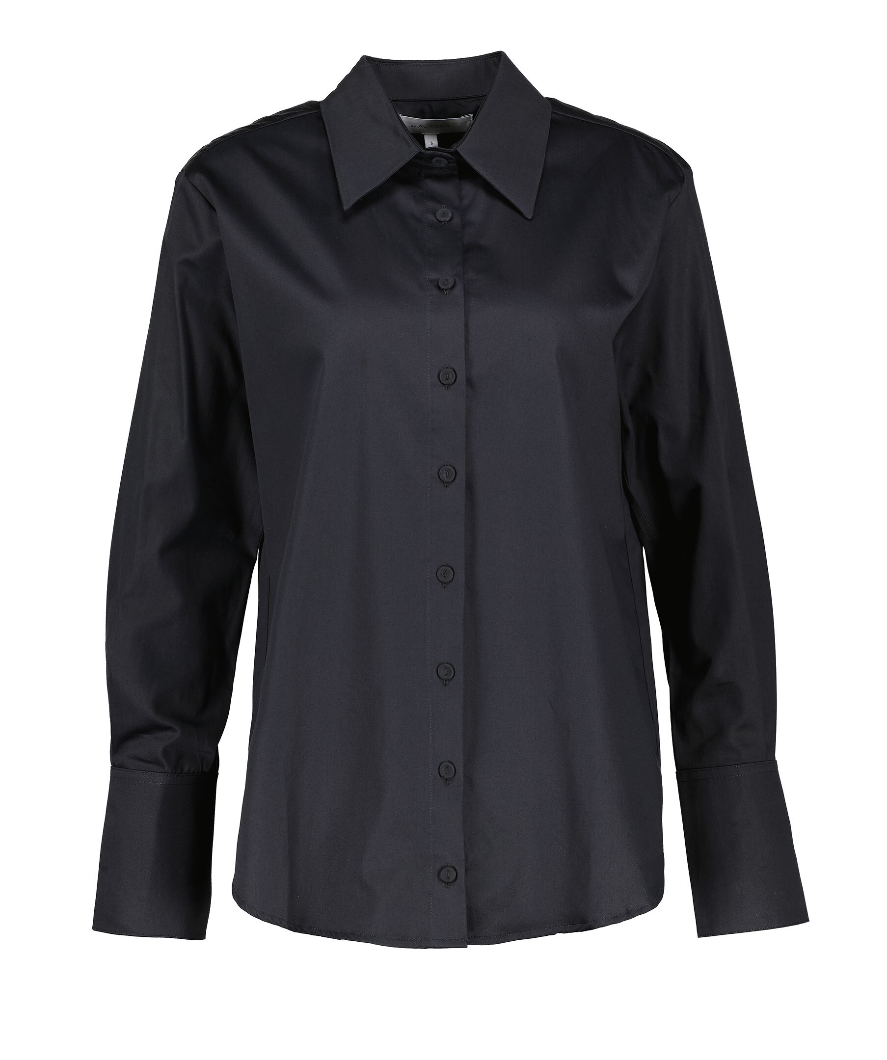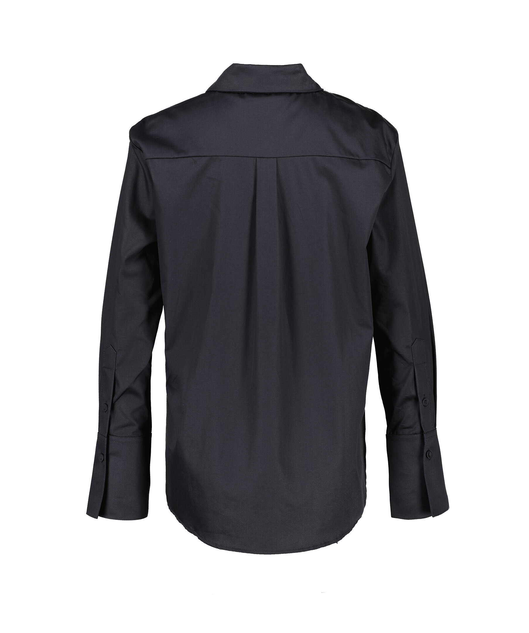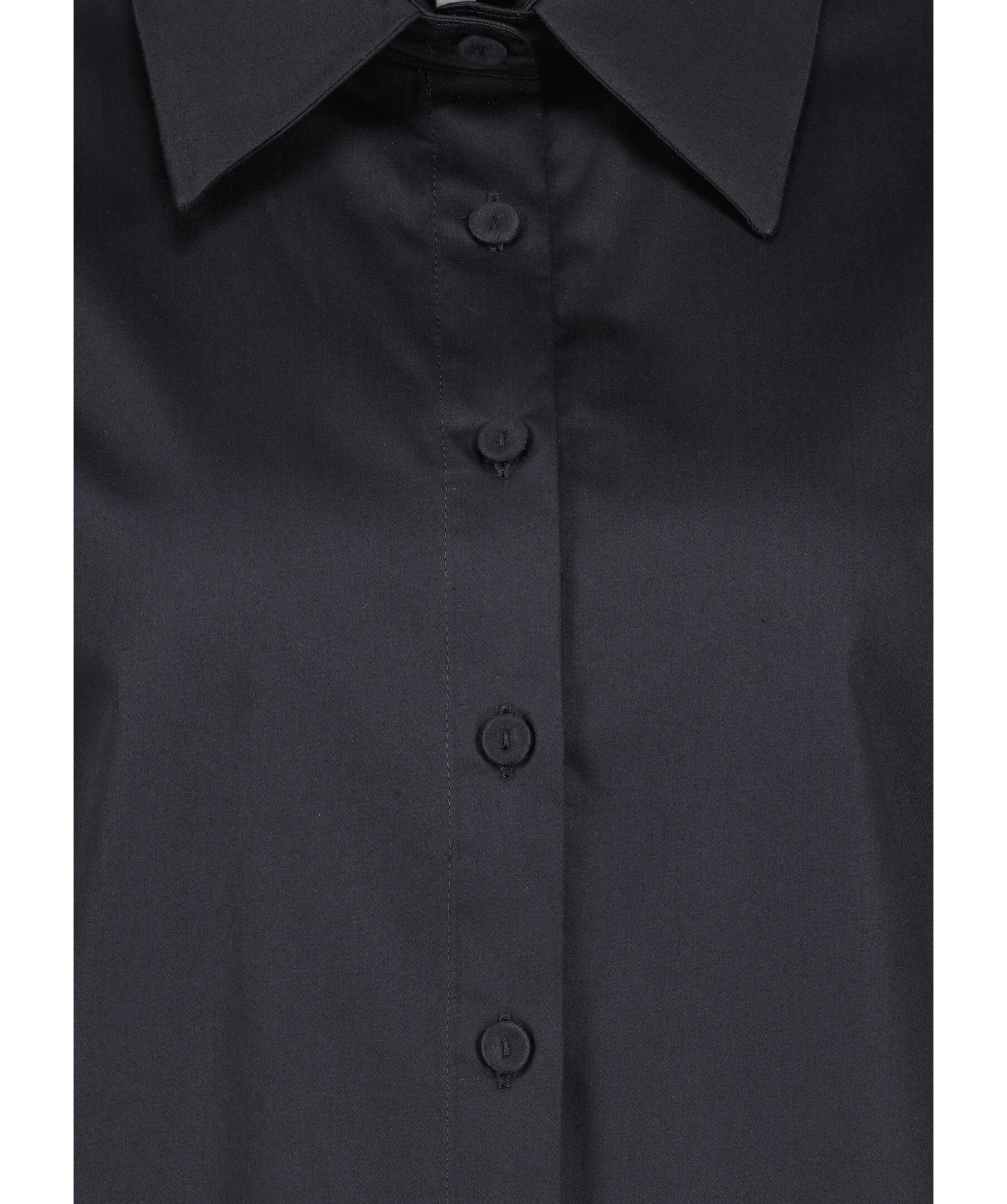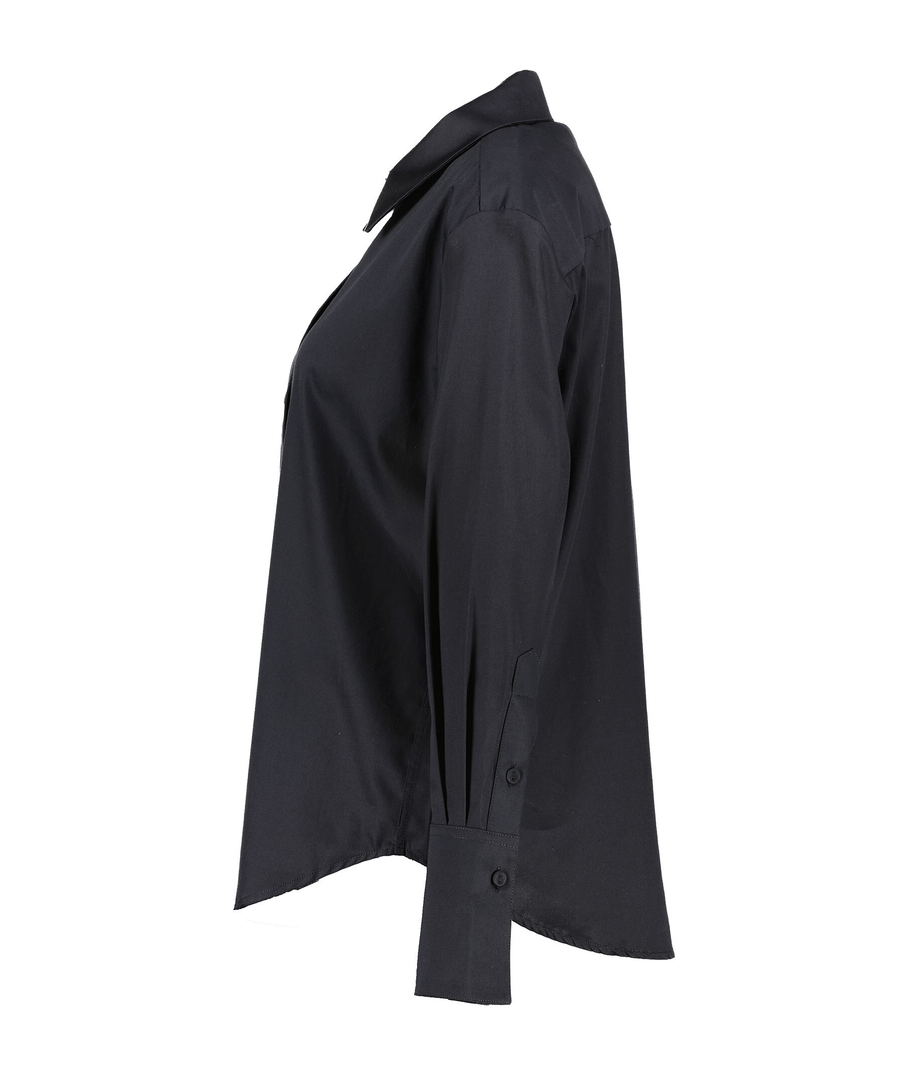Svart skjorta från My Aurora. Skjortan stängs med klädda knappar, har breda ärmavslut med klädda manschetter och rundat avslut. Tillverkad av 100% bomull.