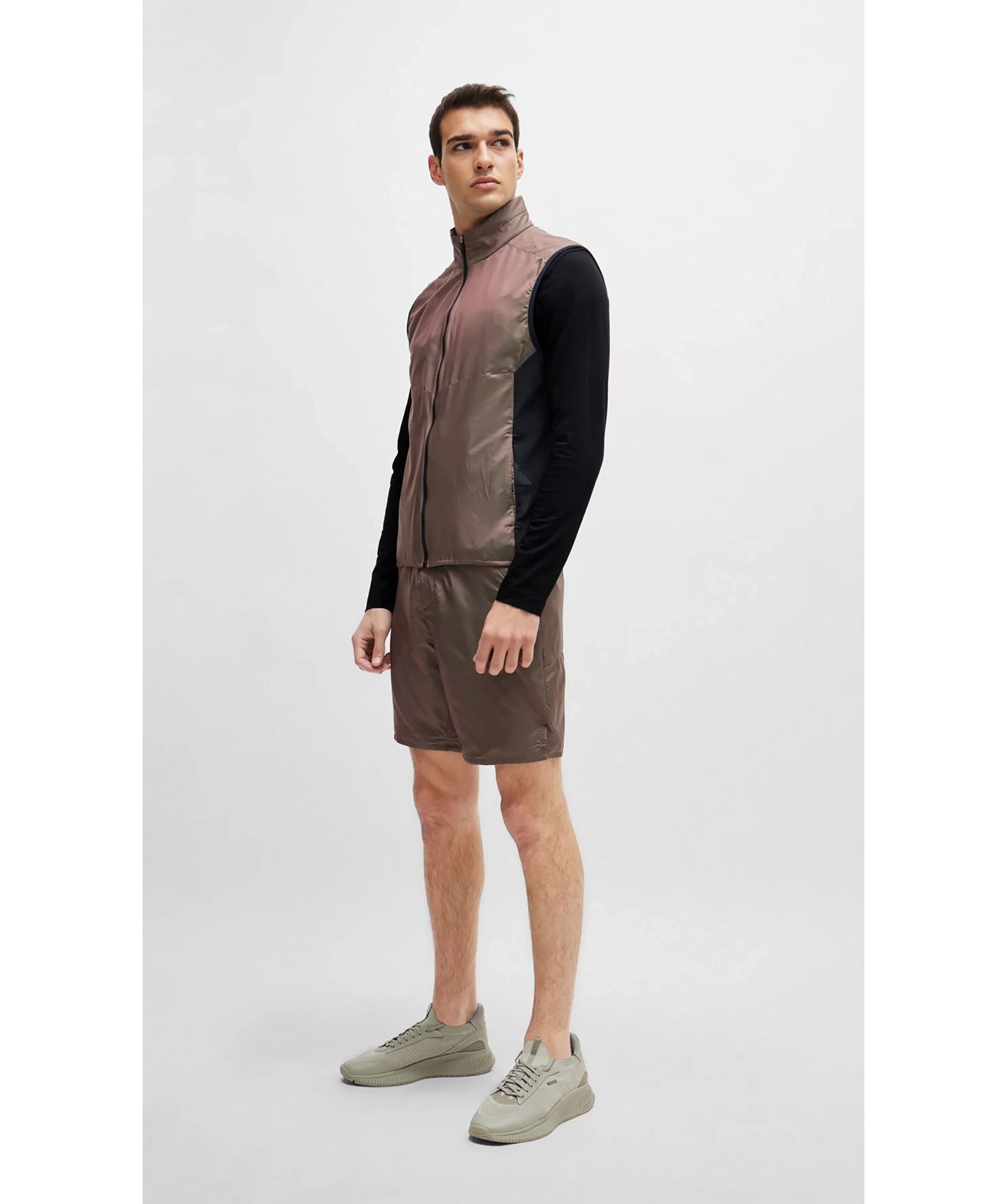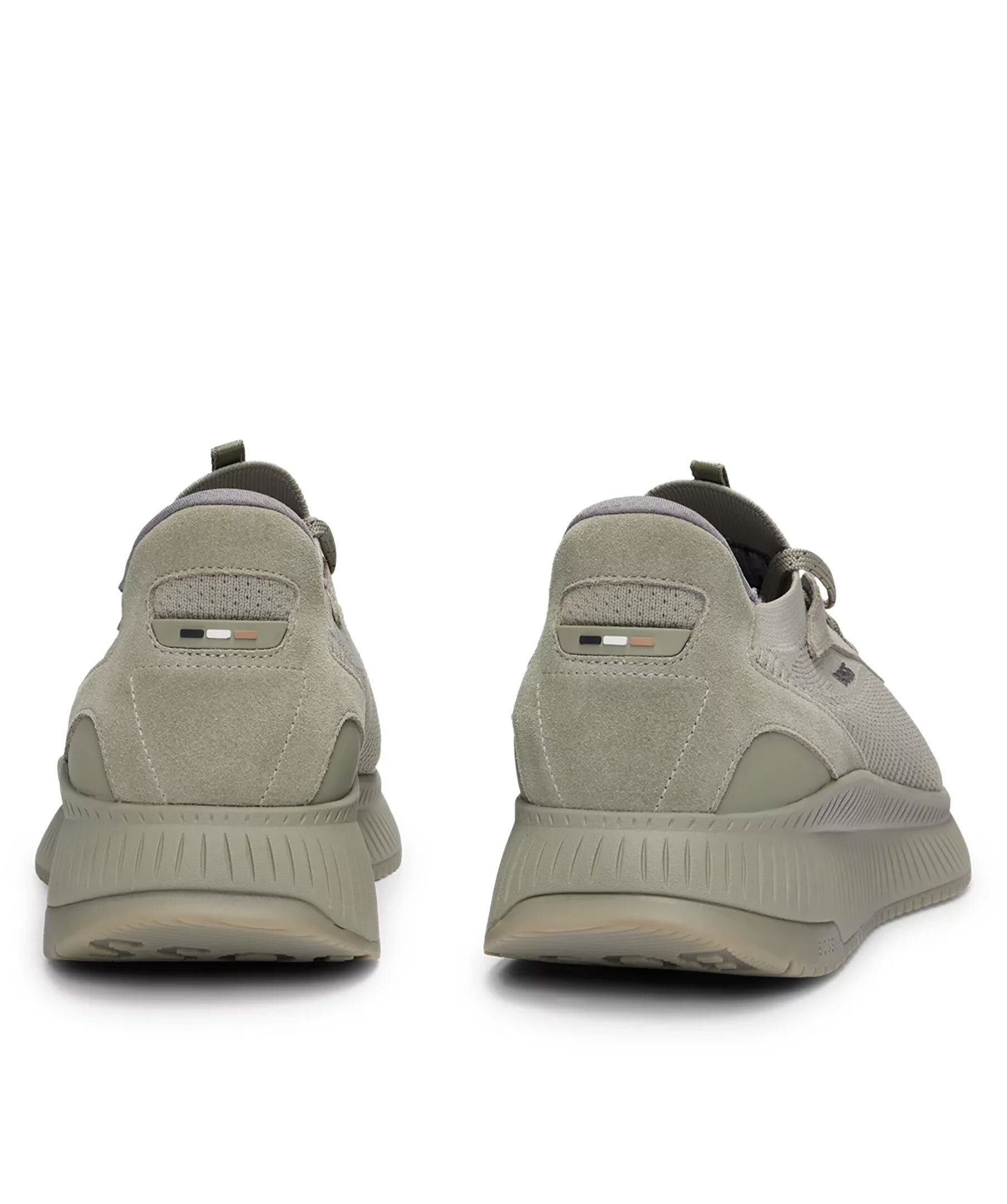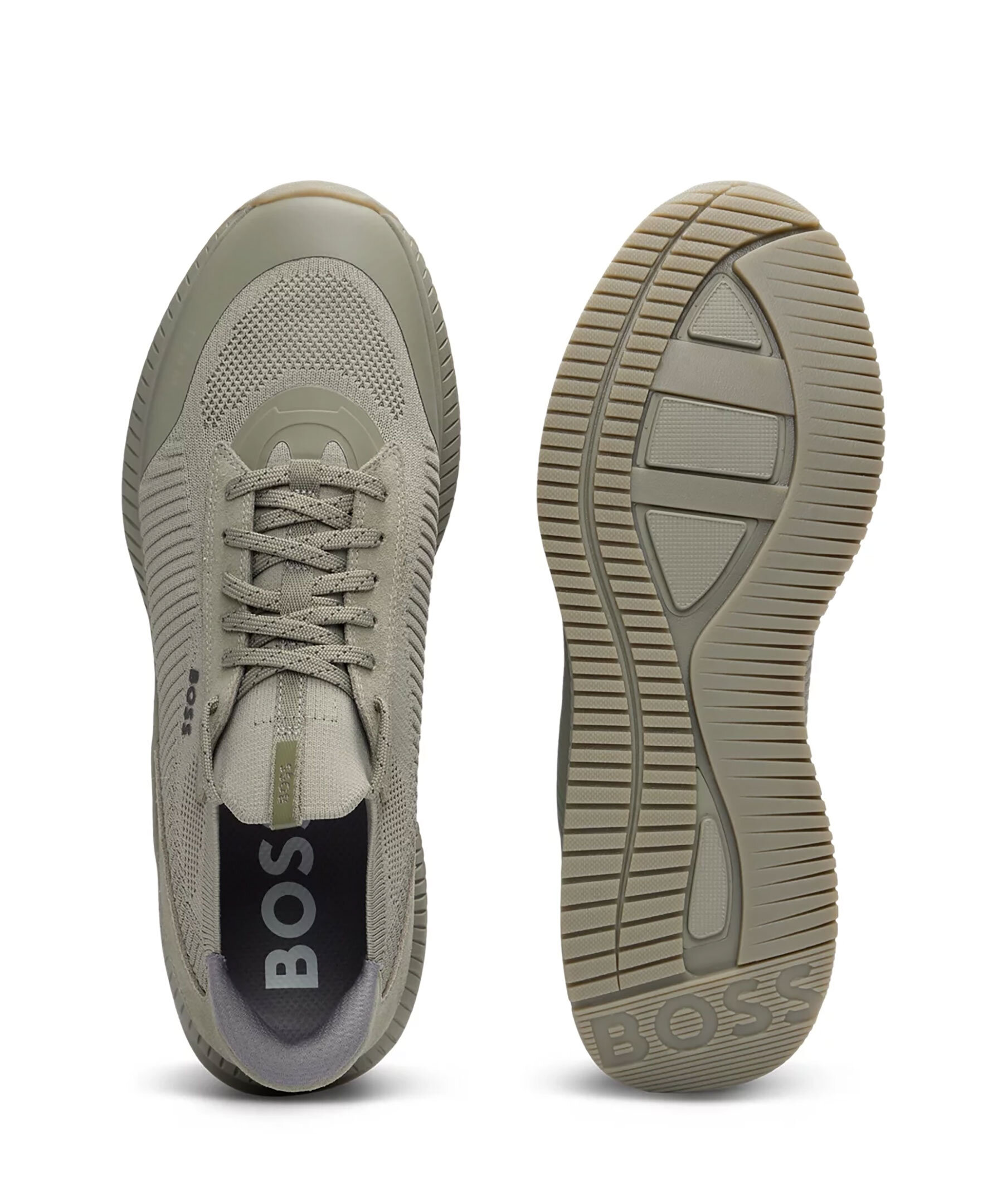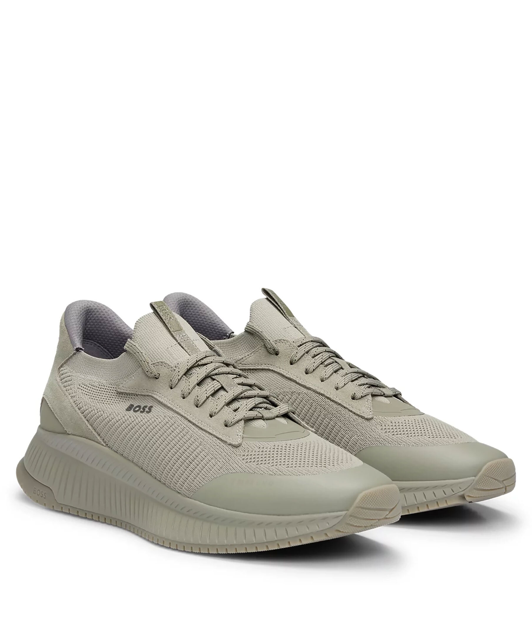 Salviagröna sneakers från BOSS Black. Stickade ovansida, sneakers i sockstil. Platta skosnören. Ögla med tryckt logotyp på plösen. detaljer i mocka. Hög sula i gummi. Tryckt logotyp i silverfärg.