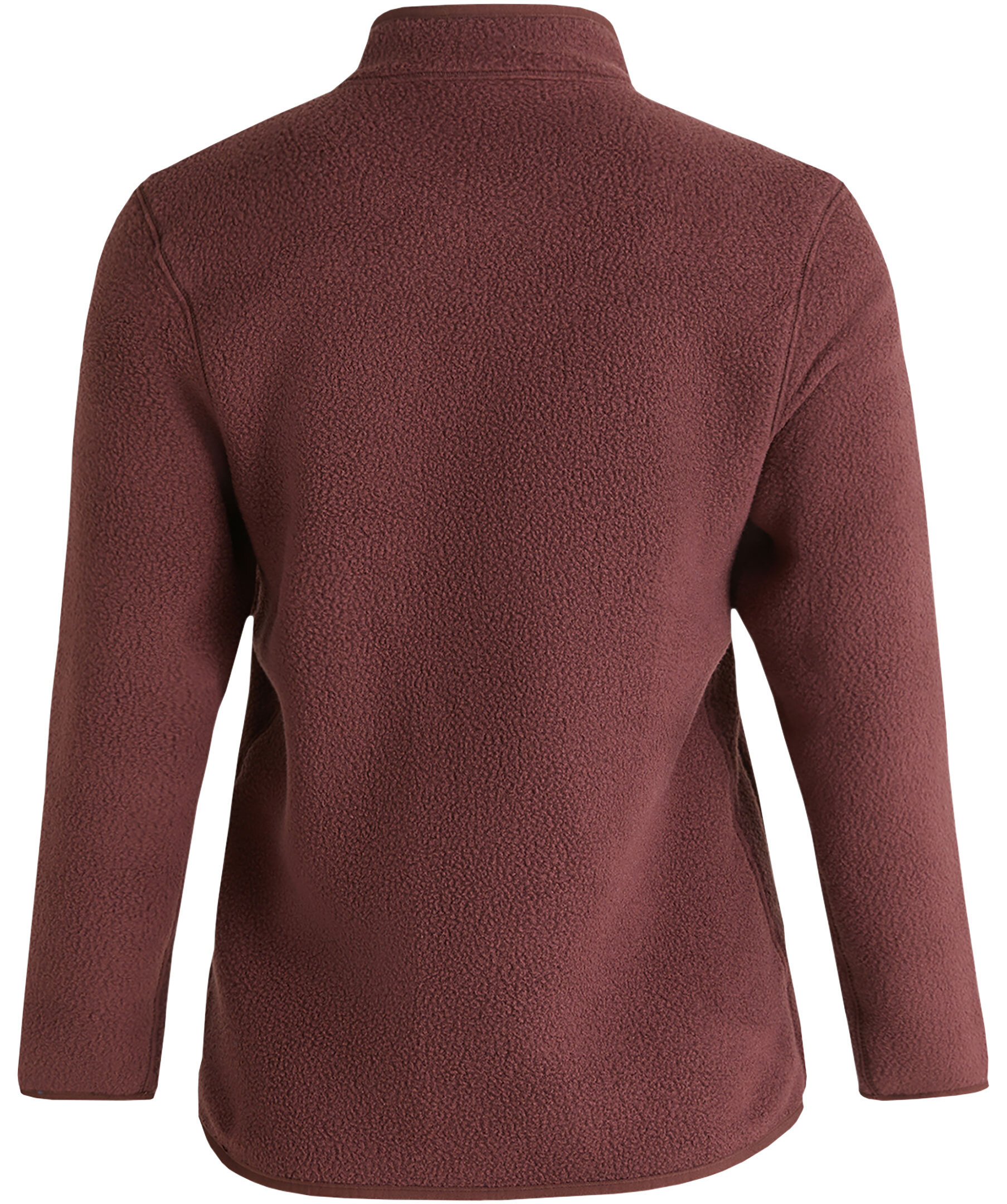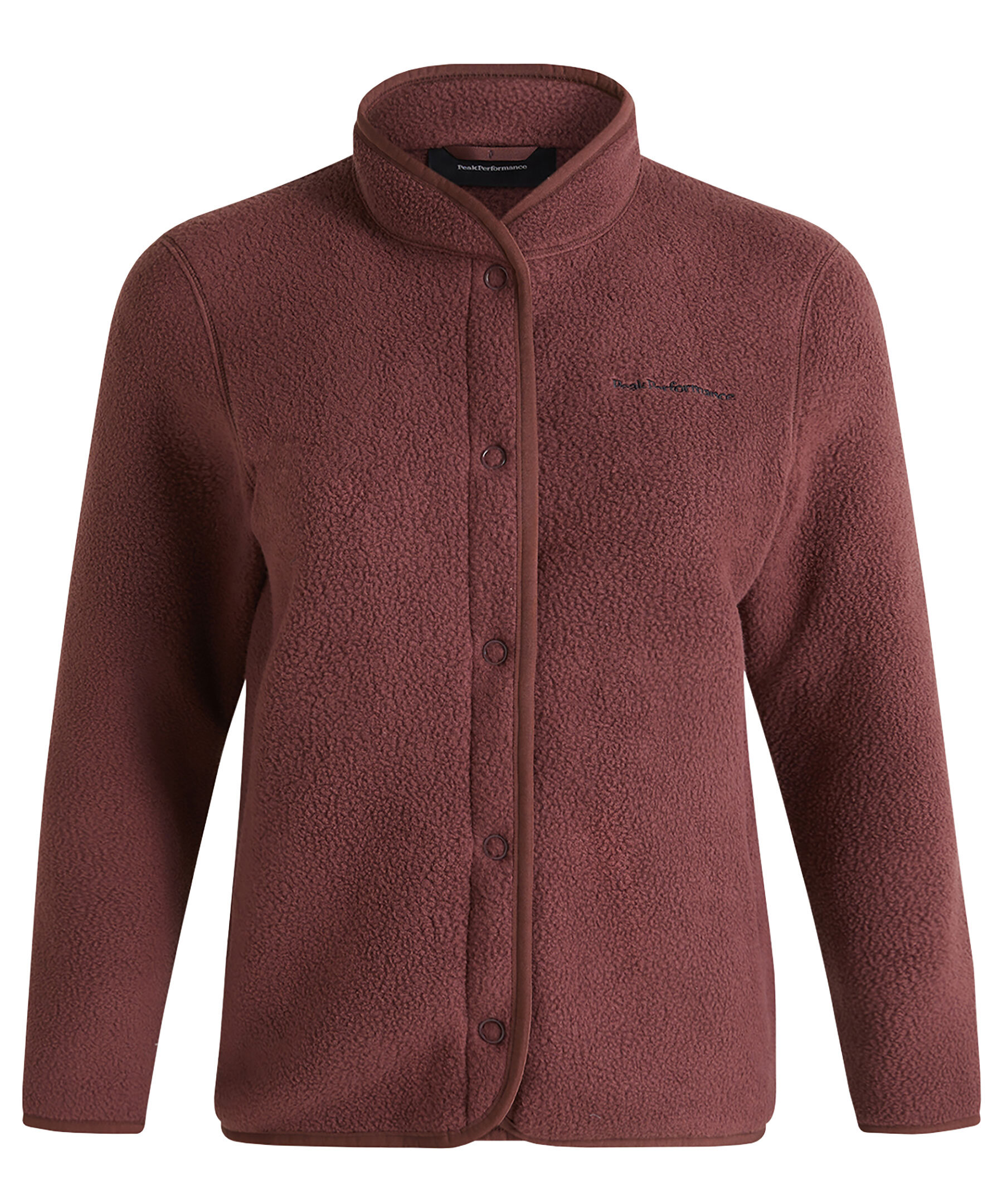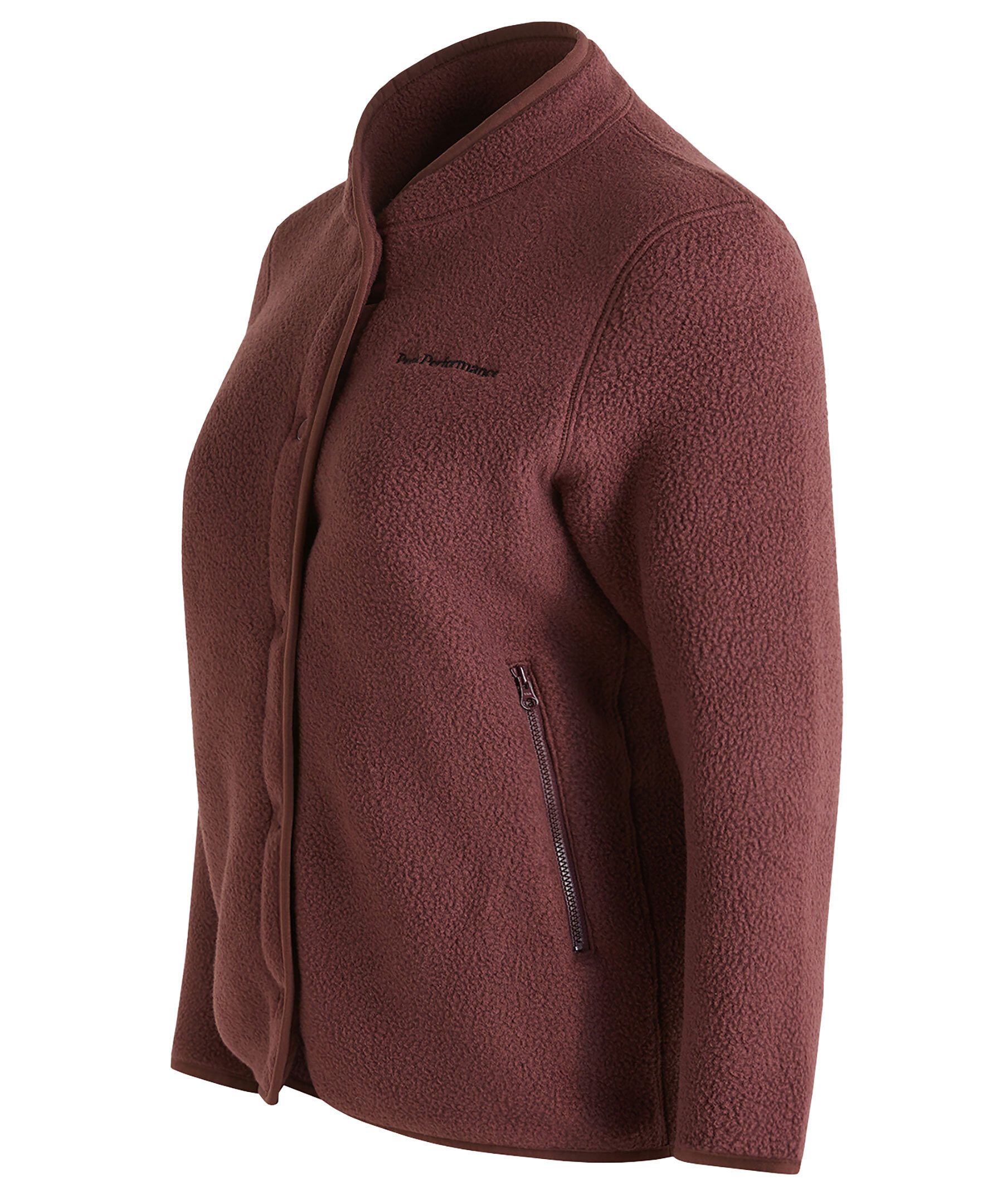 Mörkrosa fleecekofta från Peak Performance. Tillverkad av ett mjukt och slitstarkt återvunnet tyg. Stängs med diskreta tryckknappar hela vägen fram. Peak Performance-brodyr på bröstet, elastisk bindning i nederkant och ärmslut samt handfickor med dragkedja.