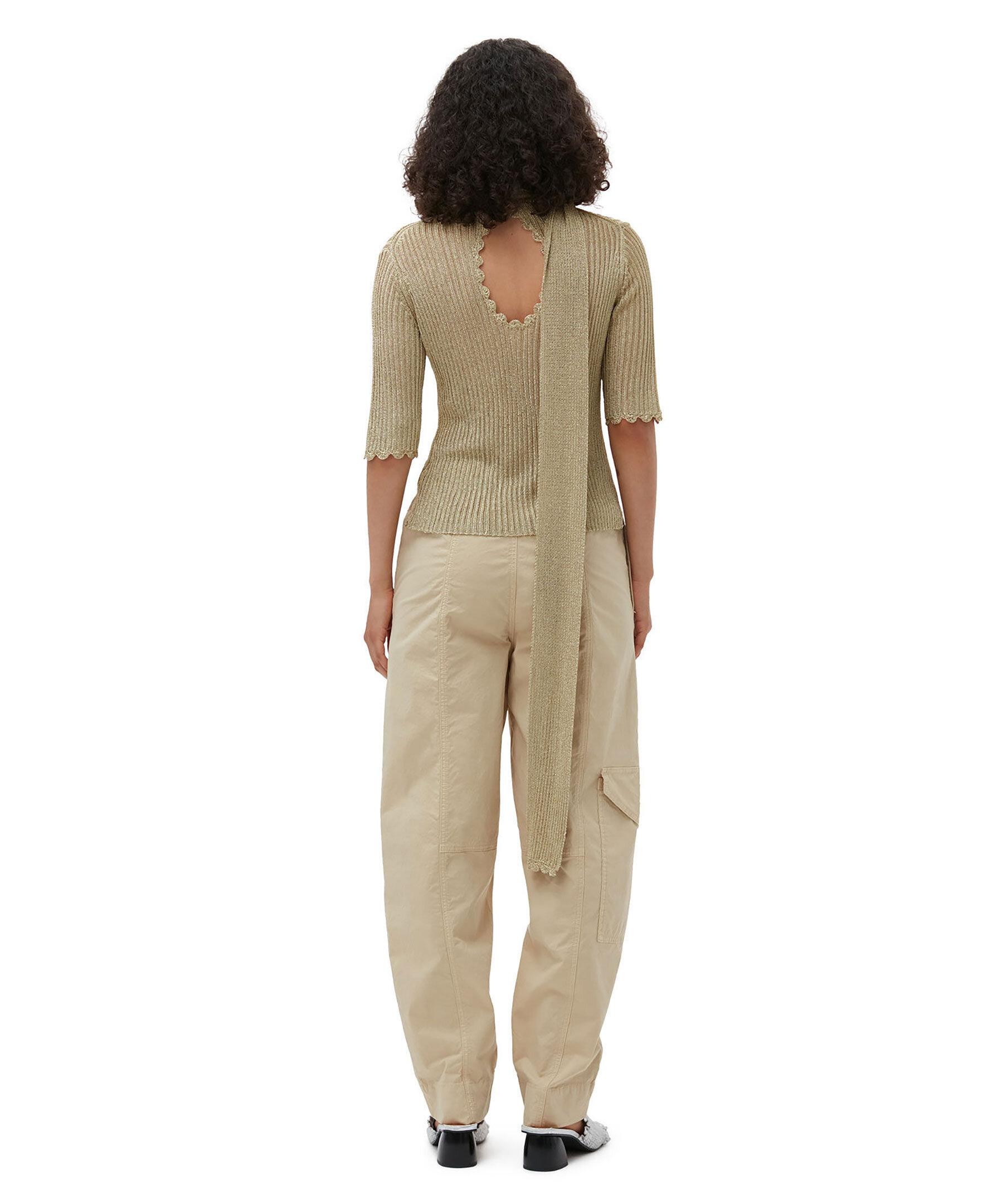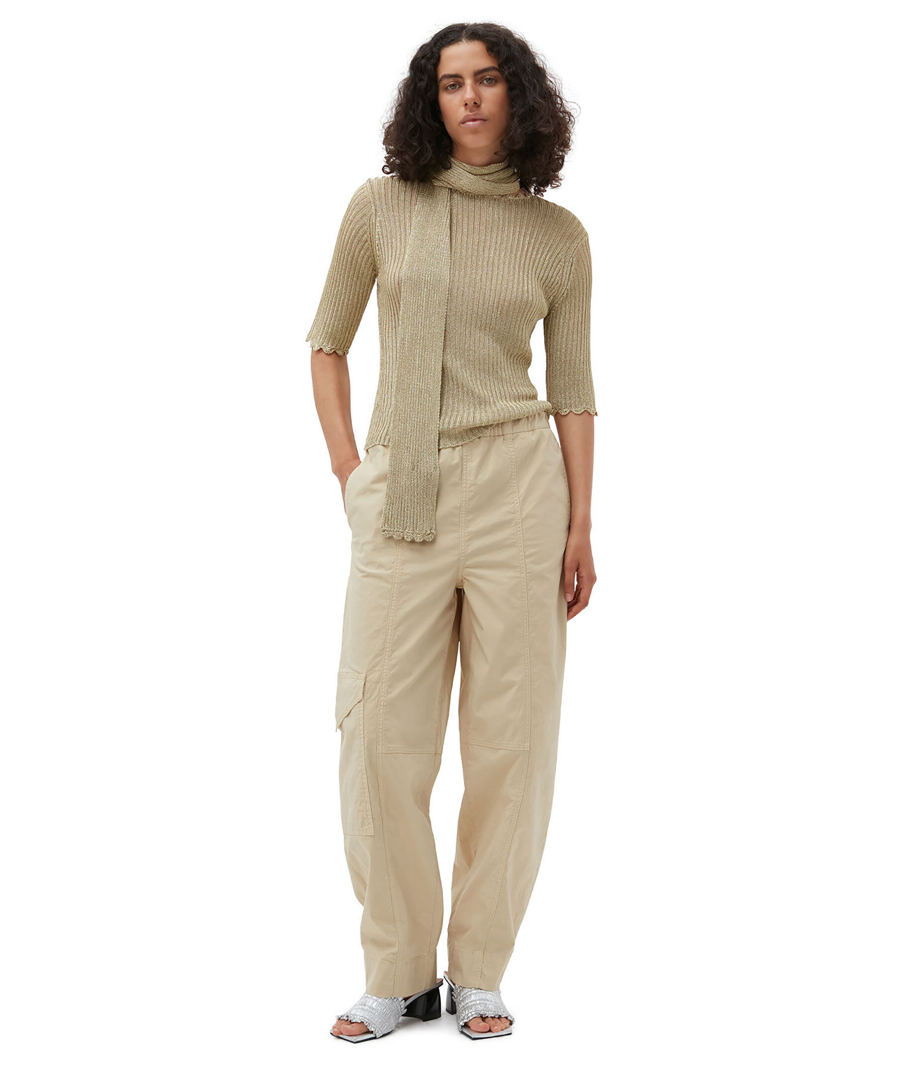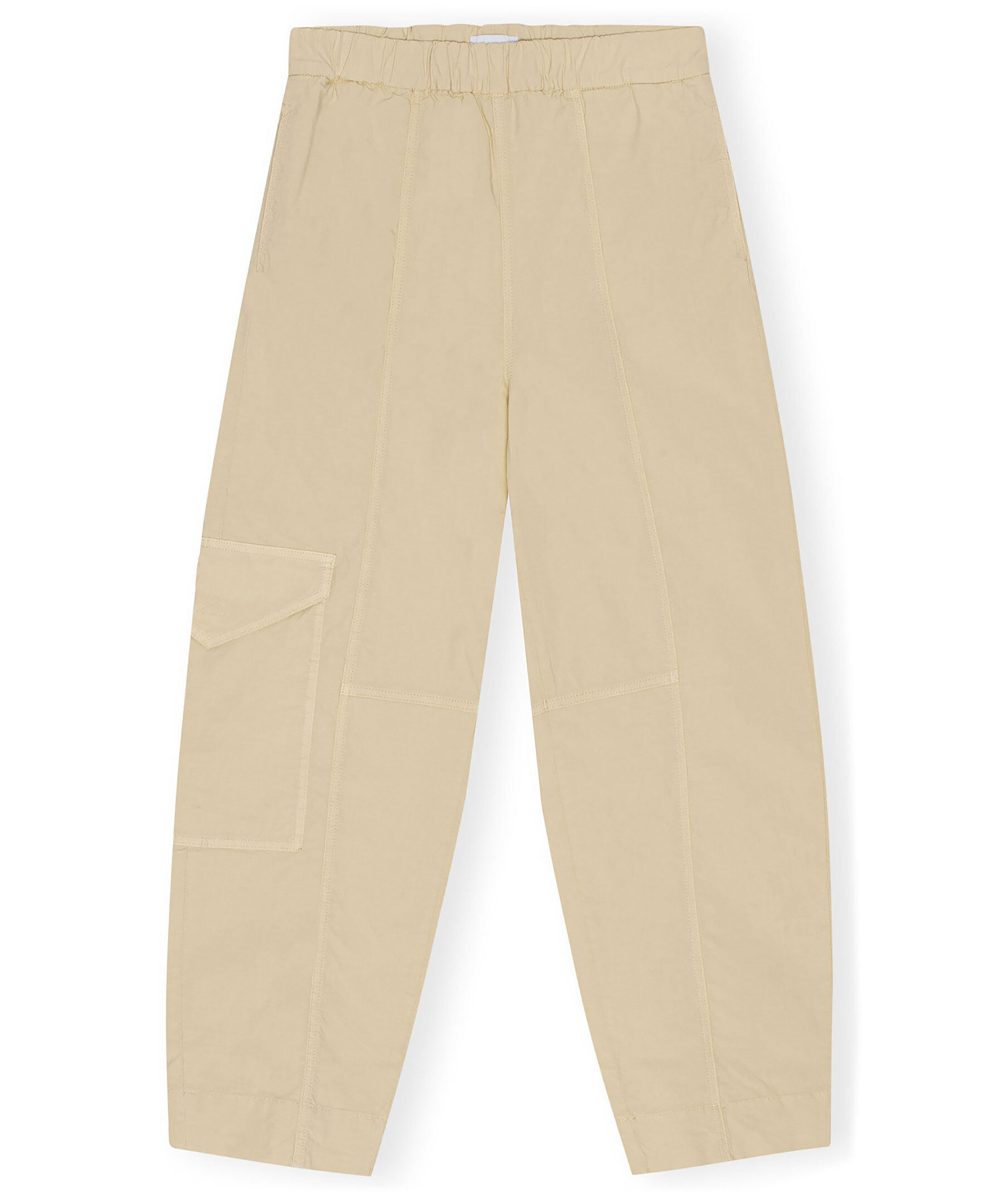 Beiga cargobyxor i tvättad kanvas från Ganni. Tillverkad i en bomullsblandning. Elastisk midja. Två sidofickor samt en ficka längre ner på benet som stängs med kardborre. Liten broderad logotyp under vänster framficka.